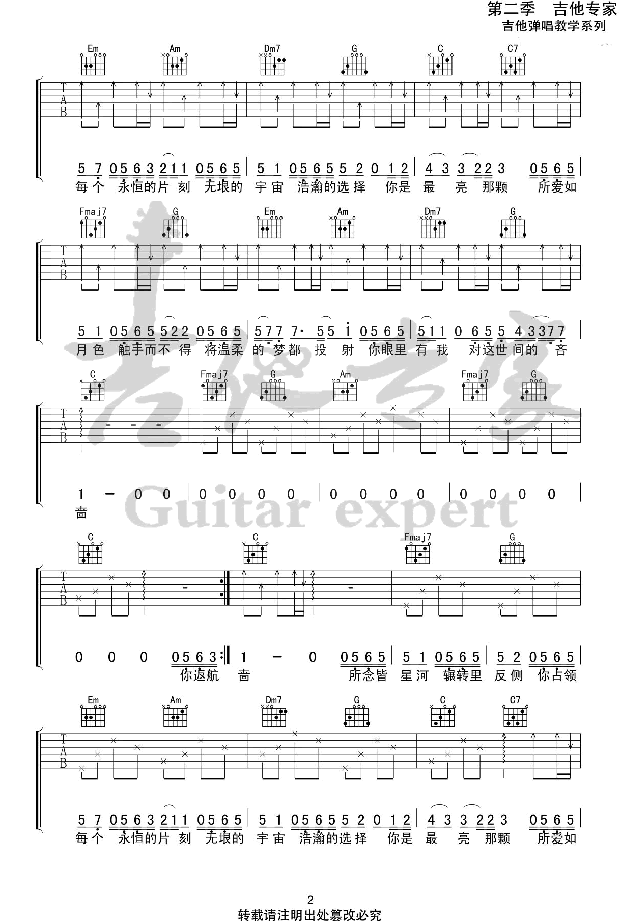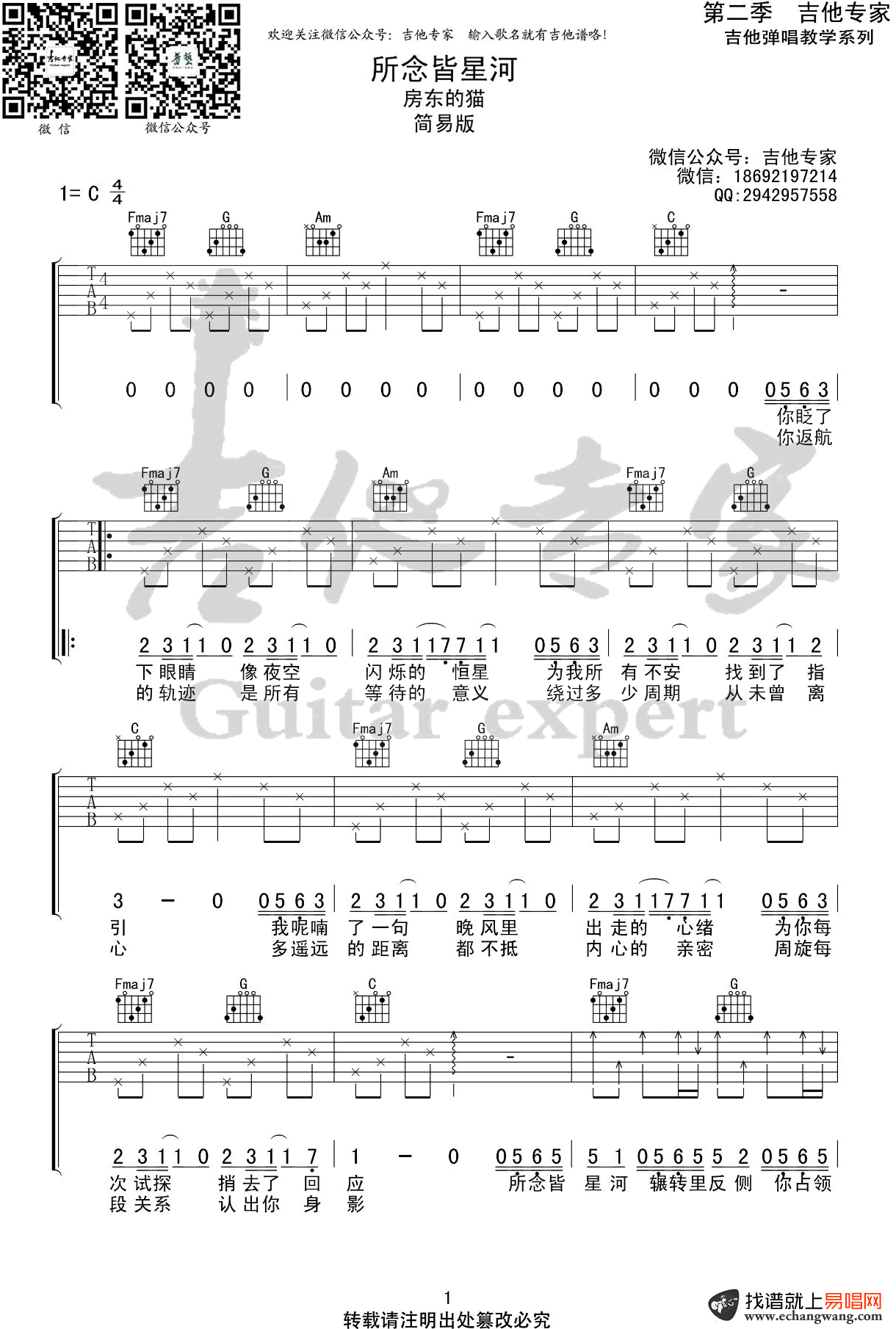 所念皆星河吉他谱_房东的猫_C调简单版 时间:2020-09-30 来源:吉他专家 点击:次 《所念皆星河》吉他谱,房东的猫演唱的一首美好治愈的歌曲。所念皆星河吉他弹唱谱,C调简易版,适合初学者练习。六线谱共三张图片,吉他专家制谱分享,易唱网整理上传。 如星空如梦境般浪漫,房东的猫用干净细腻的嗓音,演绎这段美好的旋律,轻轻抚慰你我疲惫的灵魂,带我们走向她们世界里的星空~