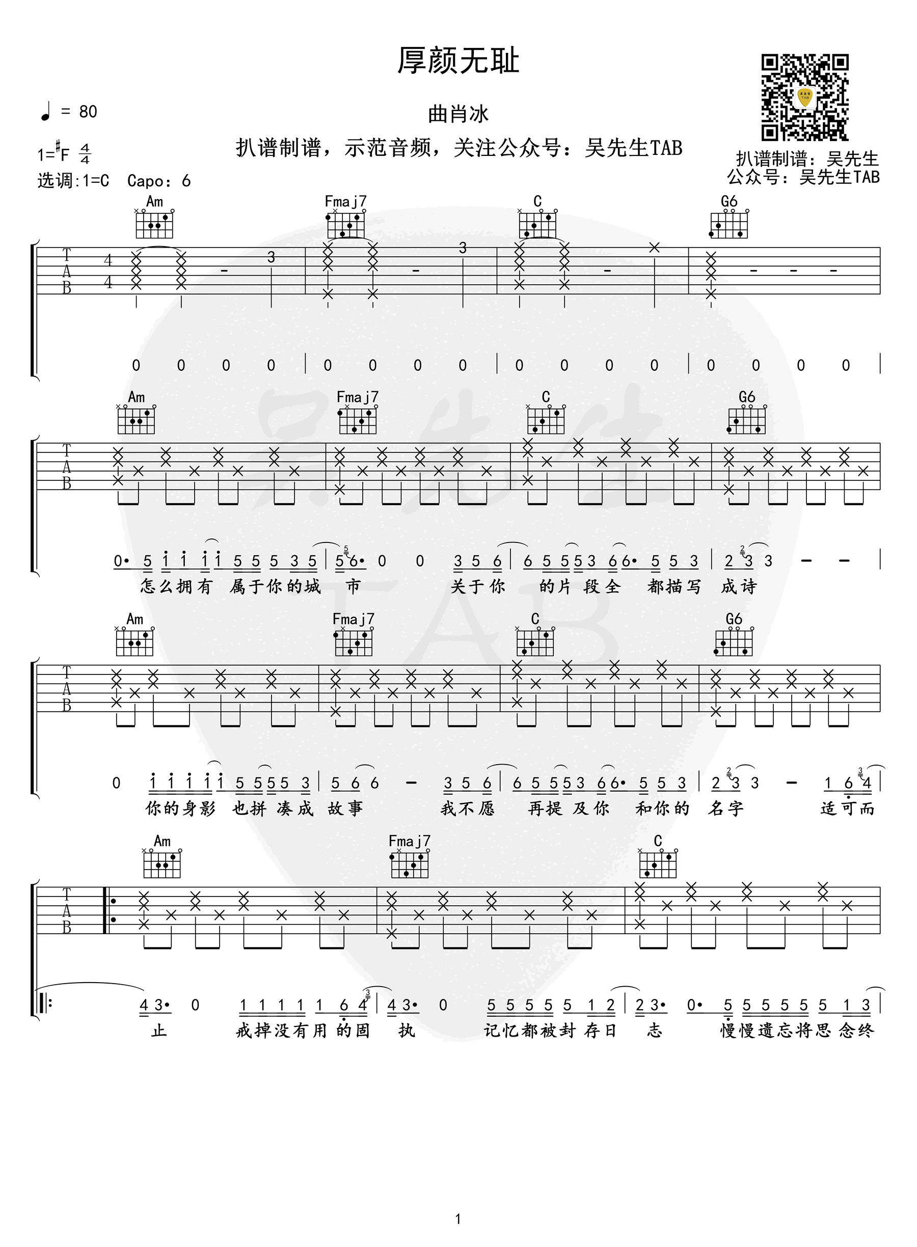 厚颜无耻吉他谱_曲肖冰_C调弹唱谱_高清版