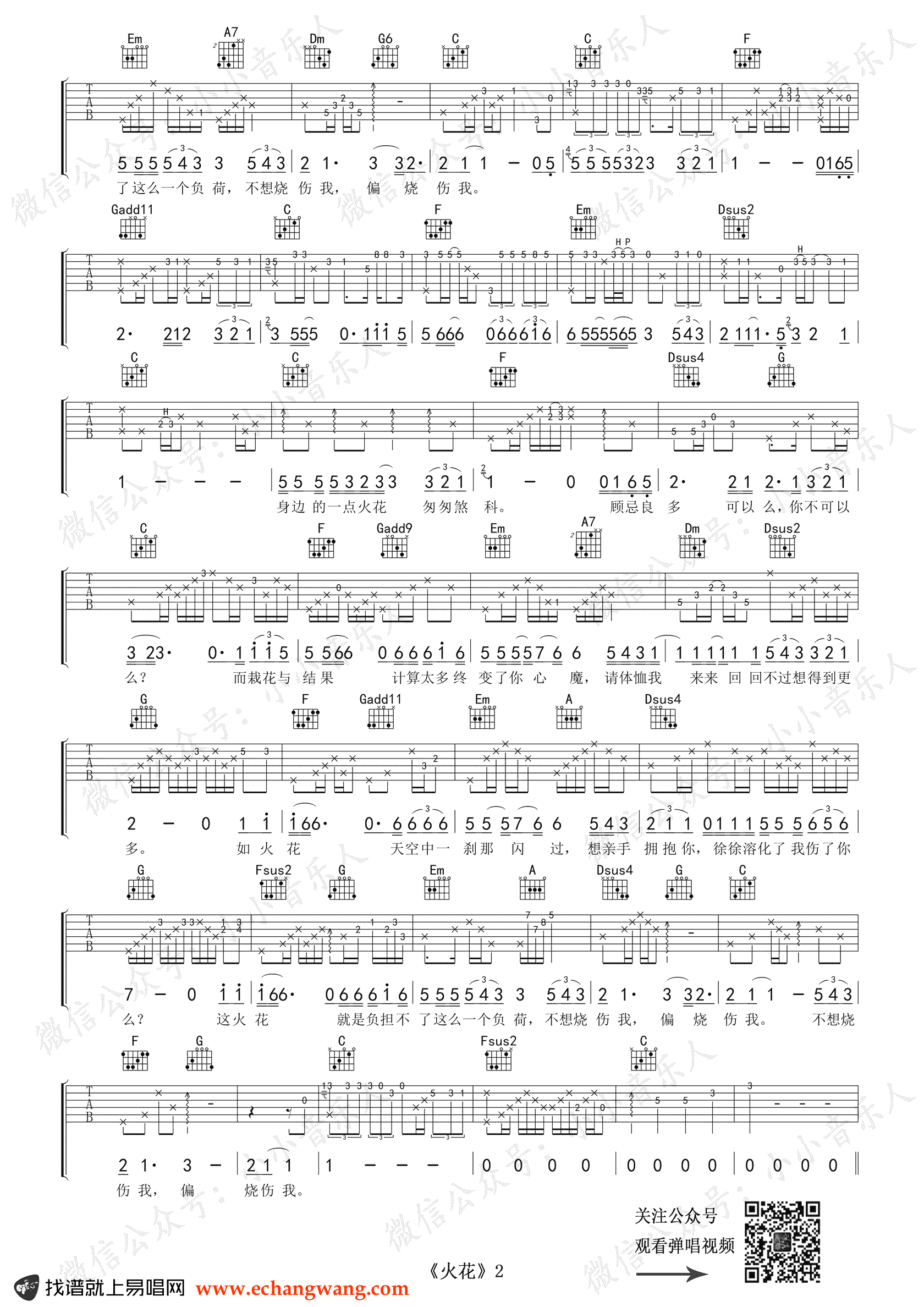 《火花》吉他谱,罗嘉良的一首粤语歌曲,电视剧《创世纪》插曲。火花吉他弹唱谱,原调E选调C,变调夹夹第四品。除指法上更容易弹奏外,也更利于前奏间奏的编配。感谢知秋制谱分享,易唱网更新上传。吉他弹唱和编配说明:本曲根据原版编配,使用C大调指法,原曲前奏和间奏使用两把吉他合奏,古典吉他演奏旋律部分,民谣吉他演奏分解和弦伴奏部分,非常符合歌曲的主基调,这里用一把古典吉他完整还原前奏间奏和尾奏,演奏者需要非常注意节奏的把握,特别是三连音和个人感觉的融入。由于吉他音域的关系,二级和弦Dm,Dsus2低音不能用六弦,故指法上会有别常规,请体会一下这样的编配调整。