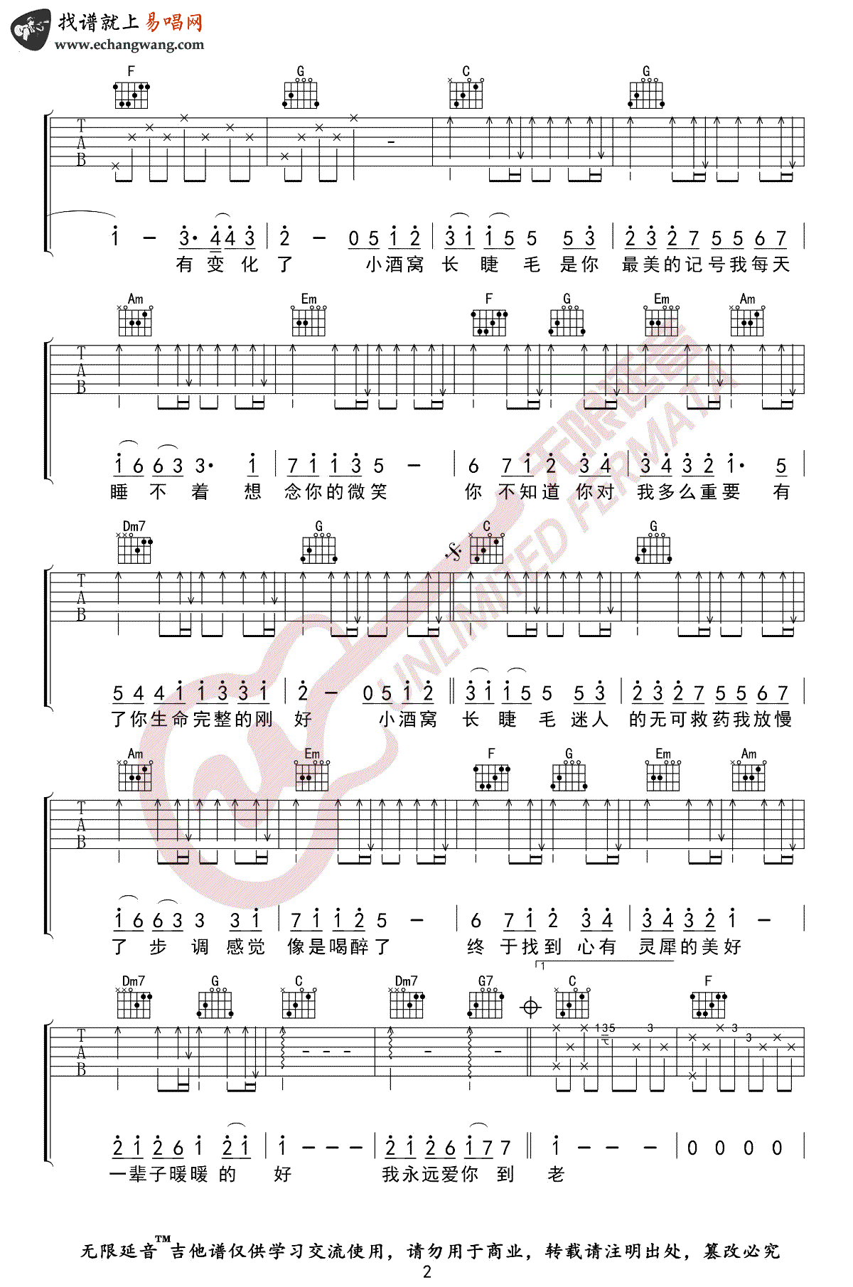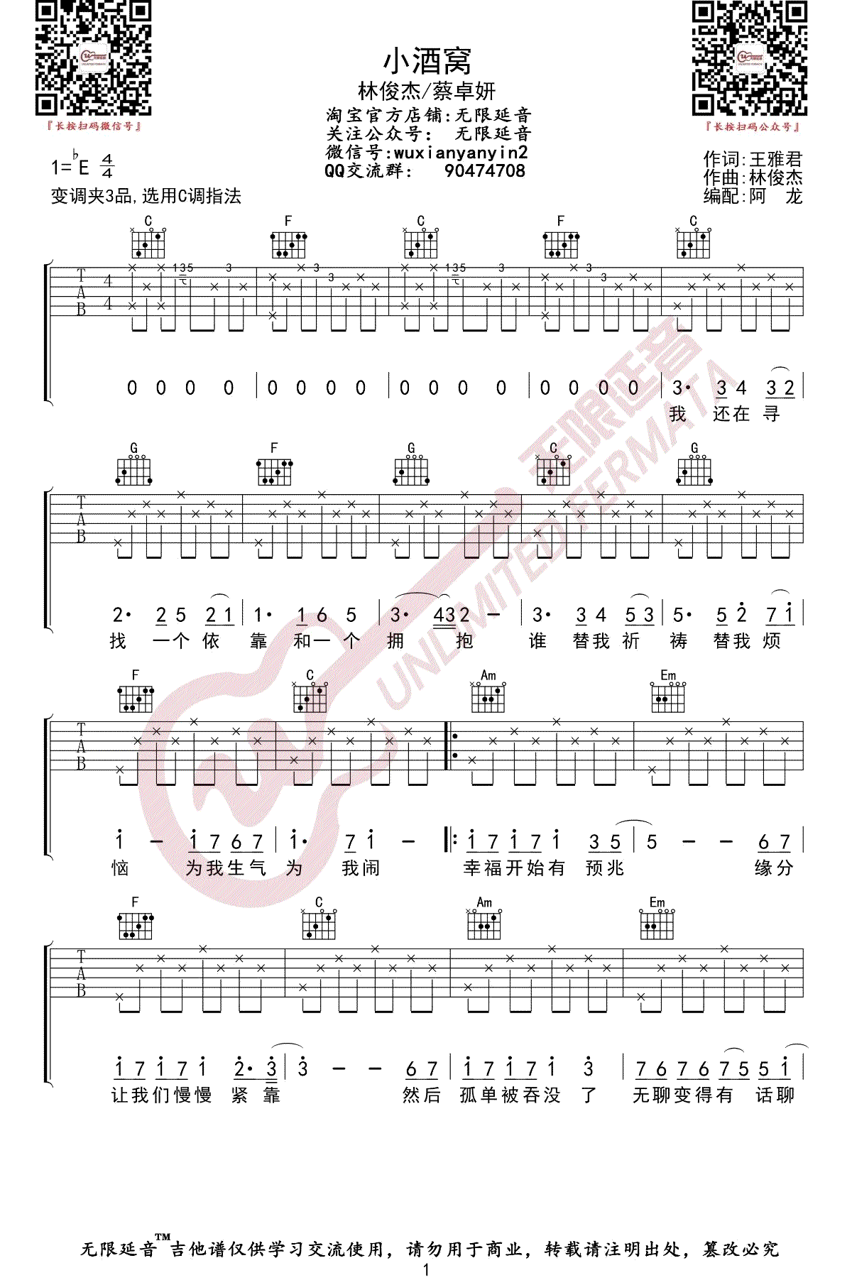 小酒窝吉他谱C调_林俊杰/蔡卓妍_对唱情歌_弹唱六线谱 时间:2020-10-11 来源:无限延音 点击:次 小酒窝吉他谱,林俊杰和蔡卓妍演唱, 一首经典的男女对唱情歌。小酒窝吉他弹唱谱,三张图片六线谱。歌曲采用C调指法编配,变调夹三品,无限延音制谱分享,易唱网吉他谱整理更新。 一首充满甜蜜恋爱气息的歌曲,轻快温暖,唱出恋人之间的纯爱情愫。吉他弹唱不难,琴友们可以独唱也可以找搭档一起弹唱哦~