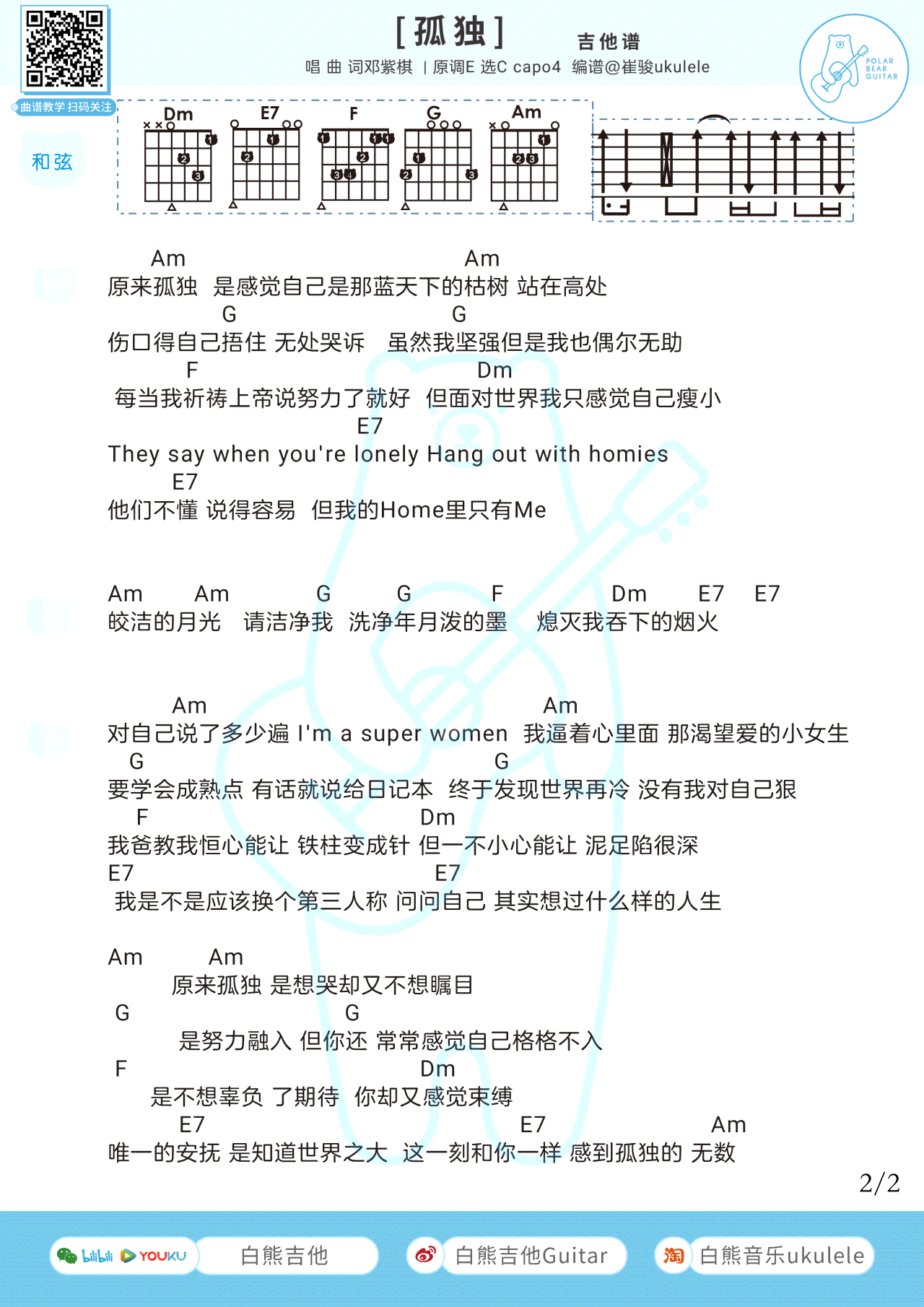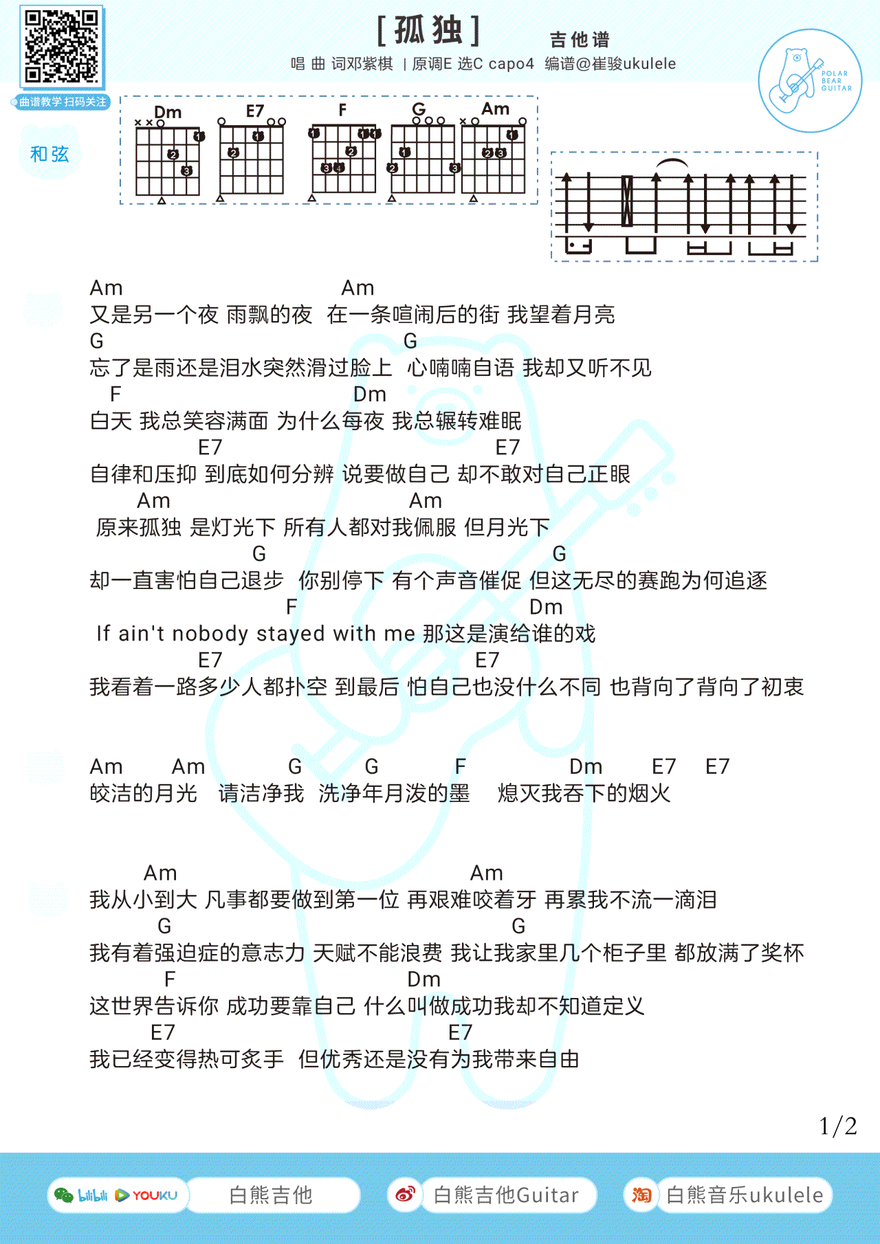 人生就是博尊龙旧版现金-手机APP下载-易唱网echangwang.com 时间:2020-10-14 来源:白熊音乐 点击:次 《孤独》吉他谱,邓紫棋一首献歌孤独者的新歌,孤独吉他弹唱谱,原调E选调C,CAPO夹四品。白熊音乐编配制谱分享,易唱网吉他谱上传更新。 跟以往的飙高音不一样,这首新歌用rap的形式将现代人们的孤独表现出来,这又何尝不是我们现在的状态呢,置身在喧闹中,却无时无刻不感受着孤独带来的滋味,相信很多人听了都会感同身受。