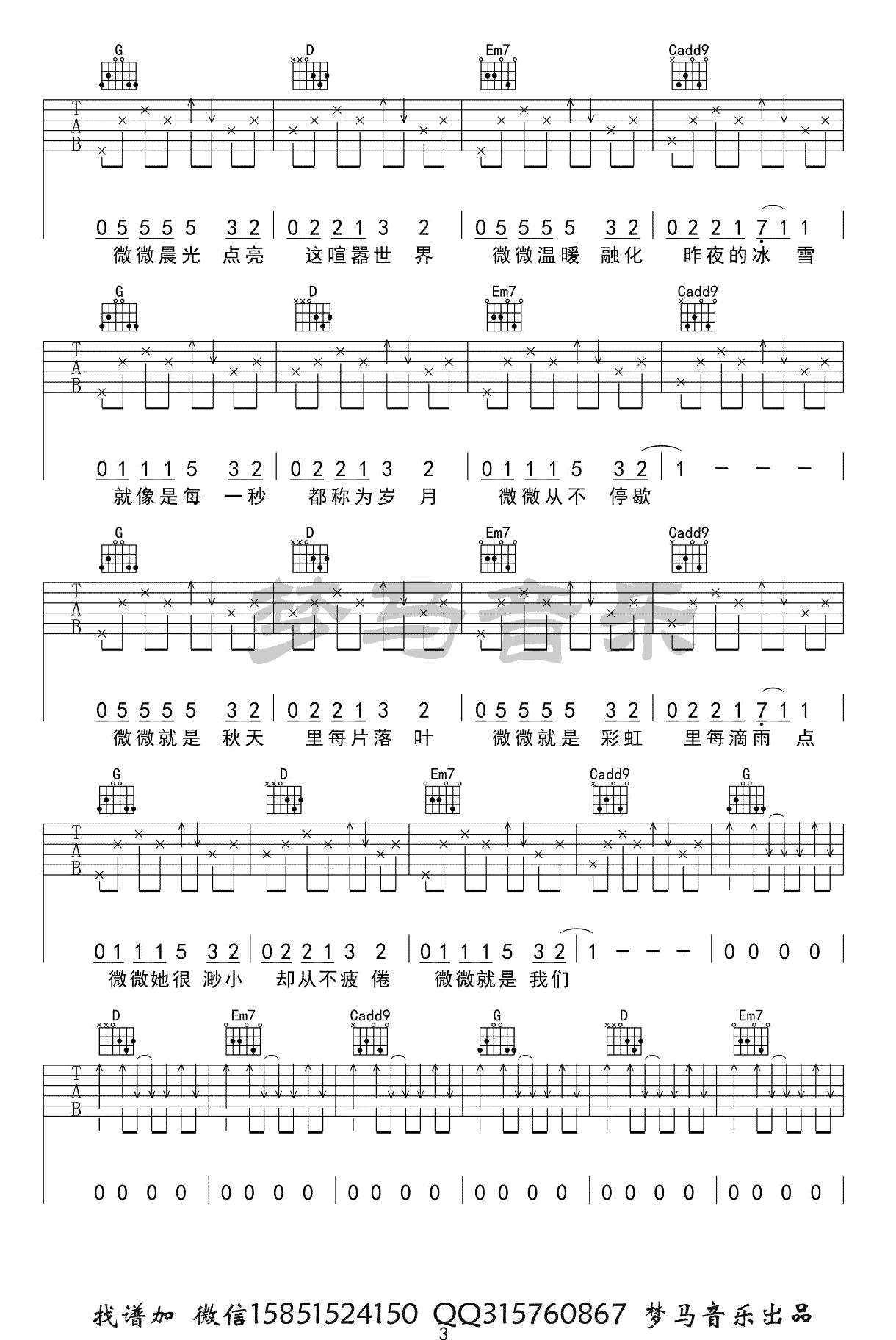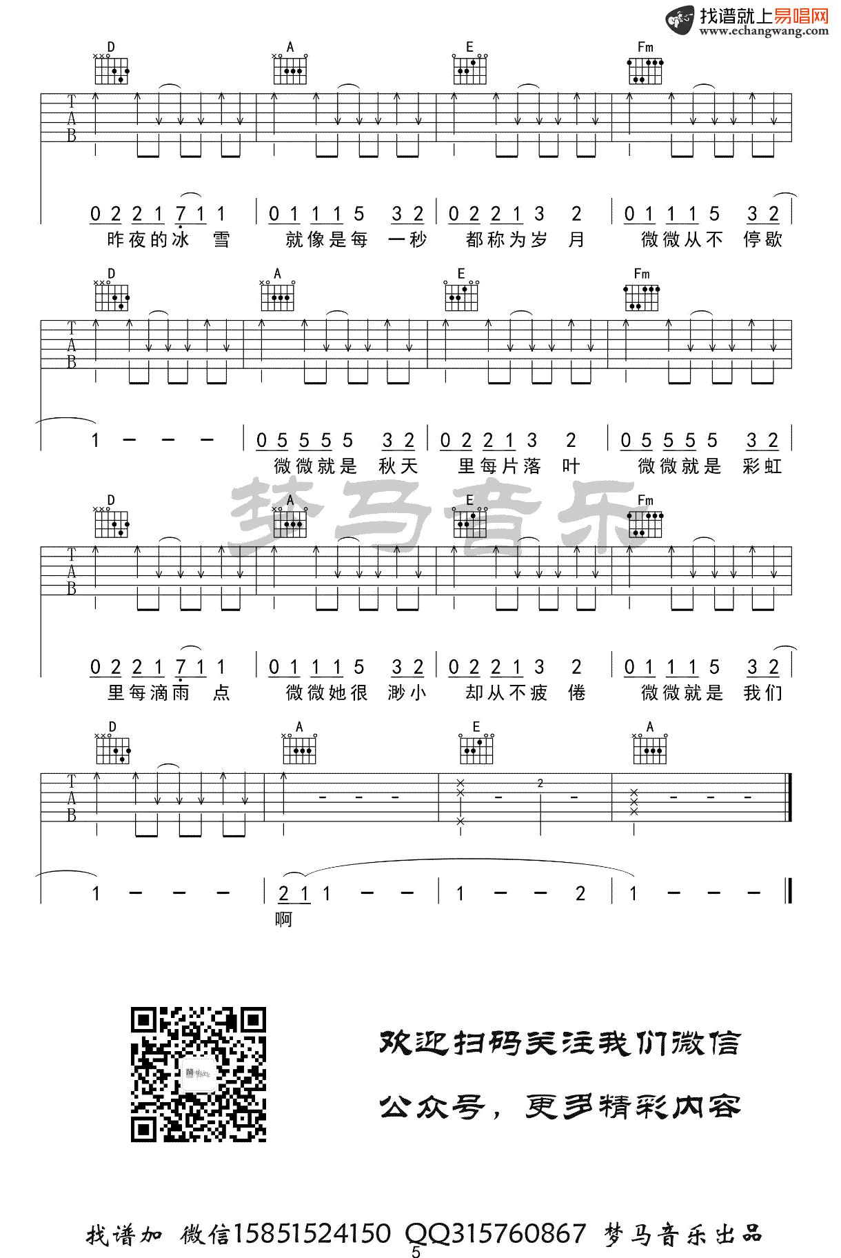 微微吉他谱_傅如乔_G调弹唱谱_完整高清版 时间:2020-10-17 来源:梦马音乐 点击:次 傅如乔《微微》吉他谱,一首抖音上火起来的歌,《青春有你2》节目的暖心单曲。微微吉他弹唱谱,完整版共五张图片六线谱,感谢梦马音乐编配,易唱网吉他谱上传。 世界虽渺小,但我们一直在努力强大,一次次跌倒,仍坚持不懈,乐观向前。夏祯阳老师:歌曲演奏不难,老师把歌曲里面转调的部分也加上了,基本还原了整首歌曲。希望大家喜欢!