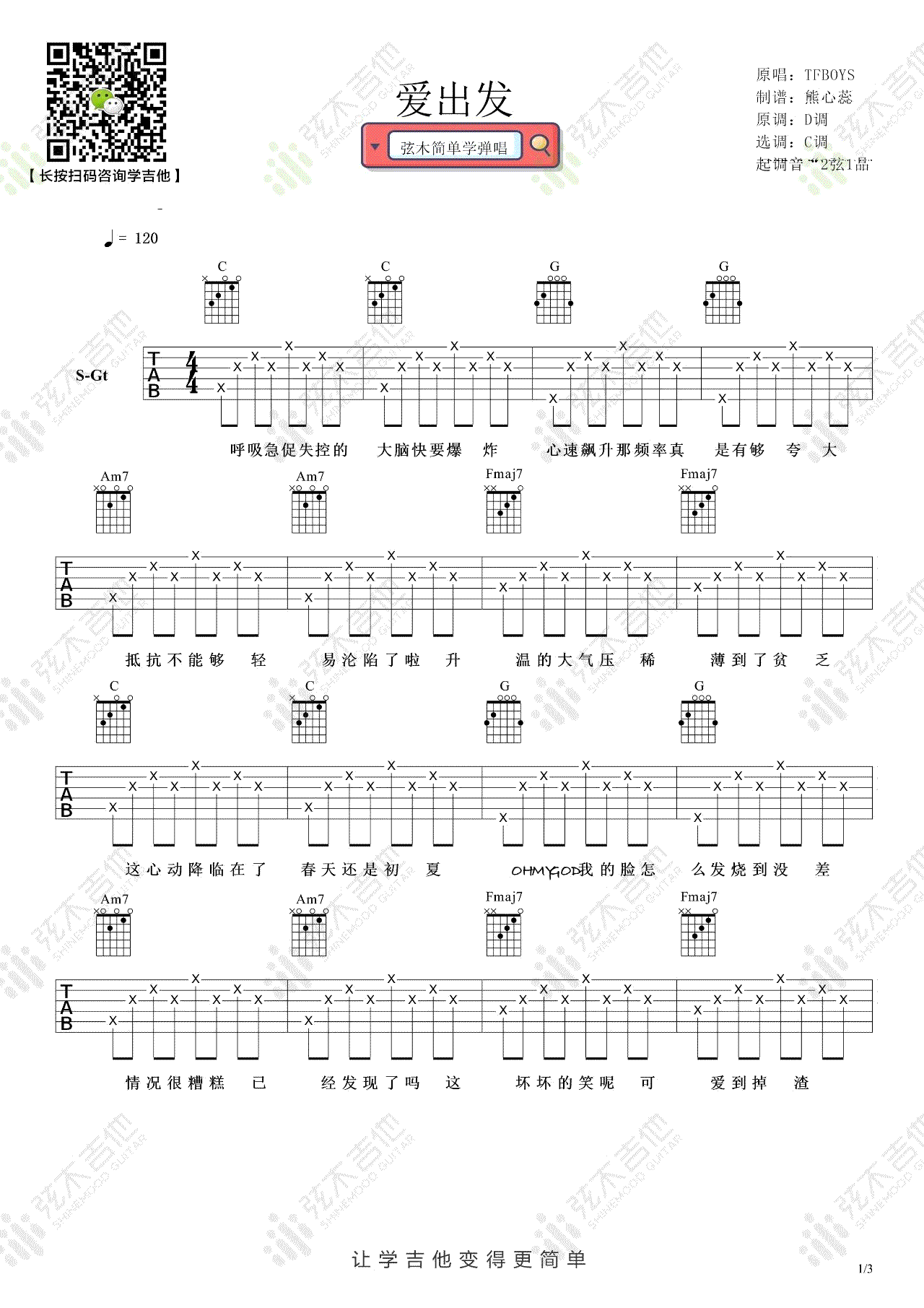 爱出发吉他谱_TFBOYS_C调指法_弹唱六线谱 时间:2020-10-18 来源:弦木吉他 点击:次 《爱出发》吉他谱,TFBOYS演唱的一首小清新歌曲,爱出发六线谱,原调D选调C,起调音二弦一品,三张弹唱图片谱。弦木吉他编配制谱,易唱网吉他谱上传分享。 深受四叶草粉丝喜爱的一首歌曲,轻快的旋律,充满帅气青春的歌声,可爱又甜蜜。时间过得好快,不知不觉离TFBOYS发行这首歌已经七年了,曾经青涩的三小只已经慢慢长大成熟了。