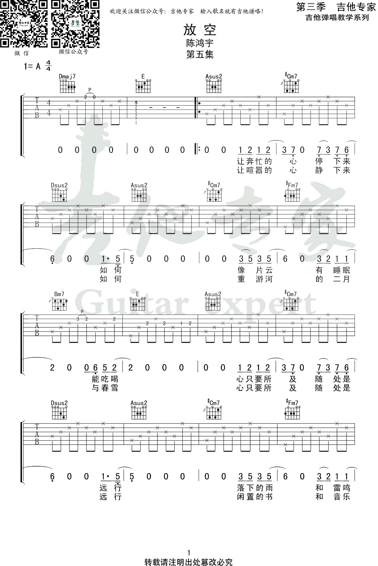 陈鸿宇《放空》吉他谱_弹唱六线谱_民谣歌曲 时间:2020-10-25 来源:吉他专家 点击:次 《放空》吉他谱,陈鸿宇一首2020的新歌,延续了以往的舒缓民谣曲风。放空吉他六线谱,A调指法编配,三张图片弹唱谱由吉他专家制谱分享,易唱网更新上传。 仿佛是治愈生活的舒缓剂,这首歌曲能够舒缓我们的耳朵与身心,为纷忙都市快节奏生活的人们,带来一时遐想的放空,得片刻悠闲的心情。