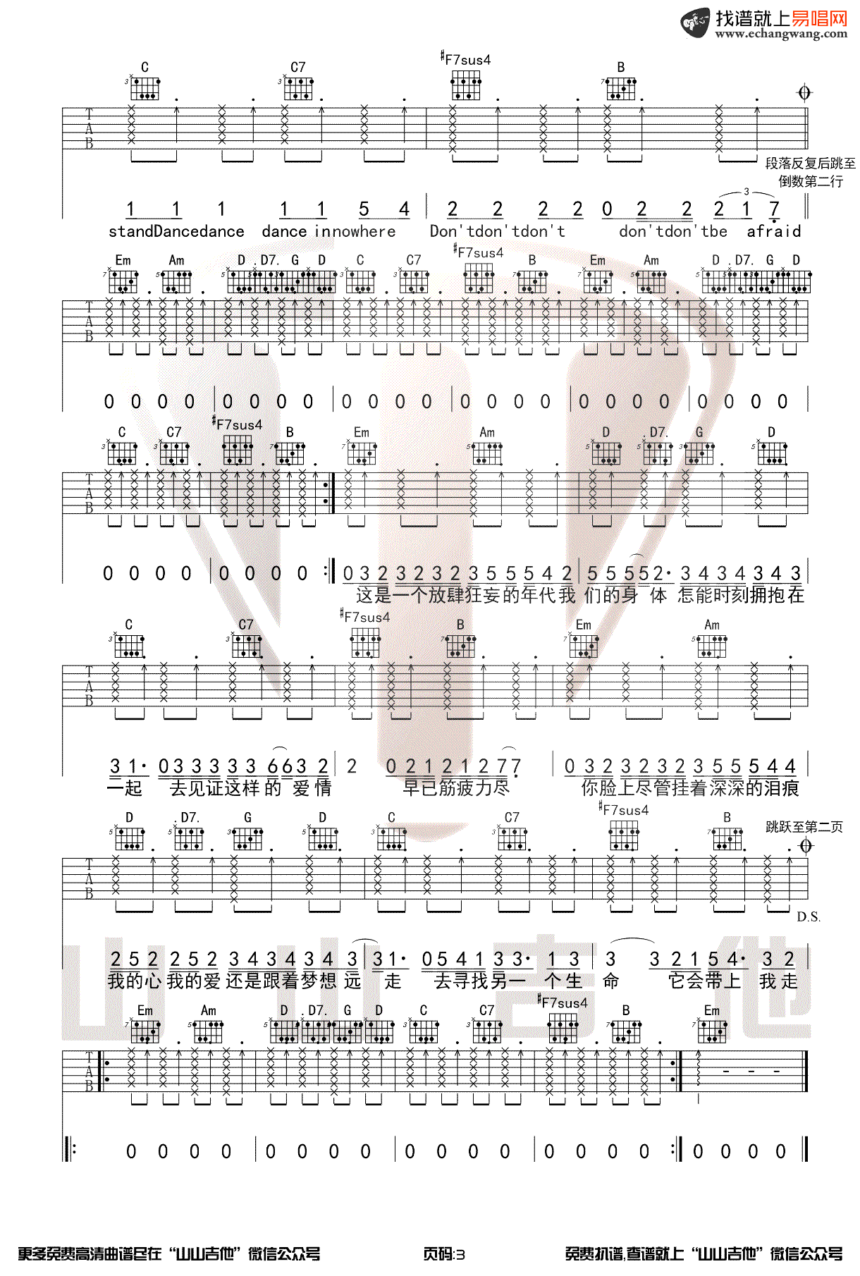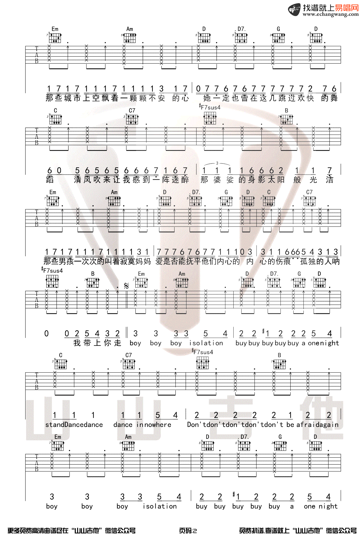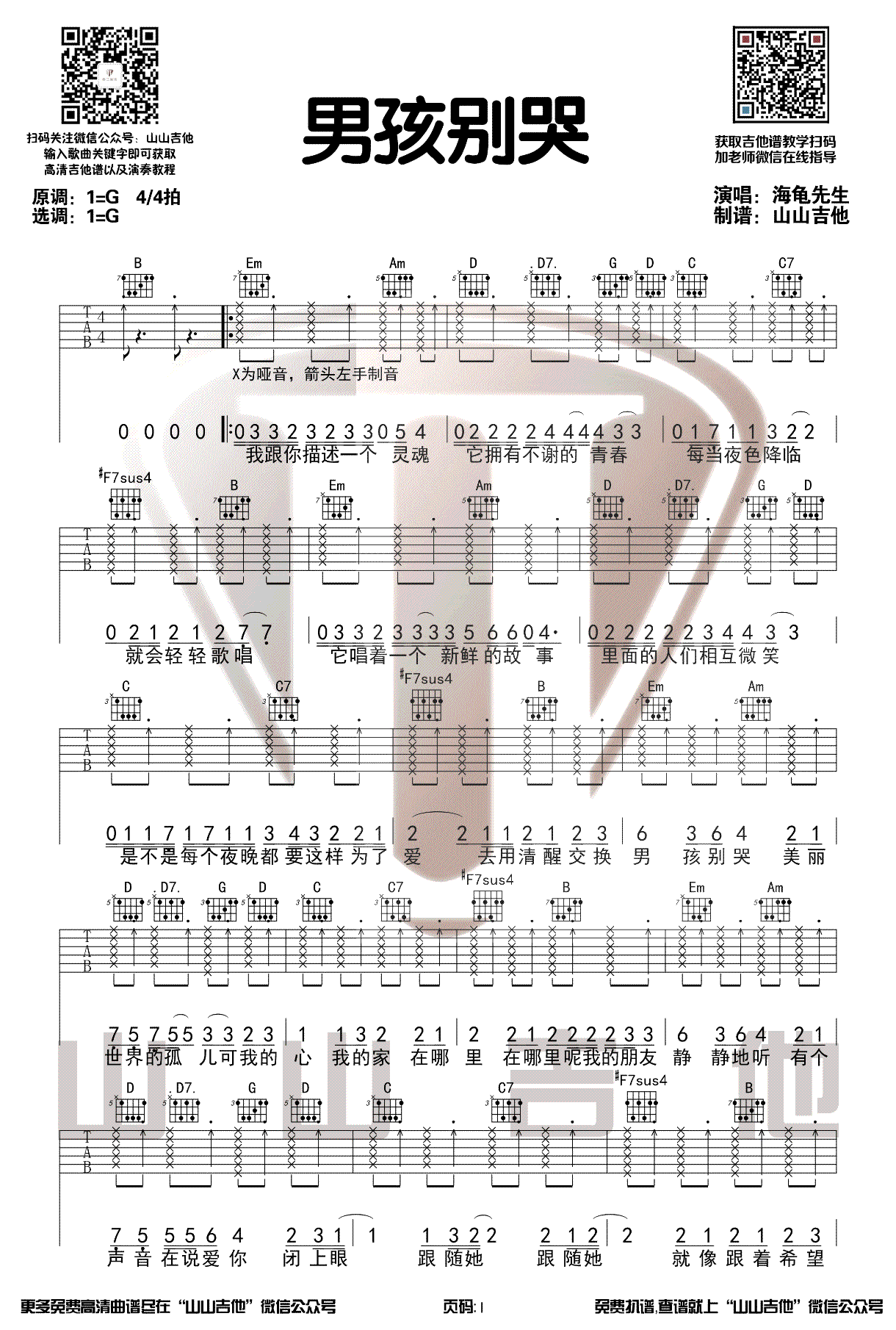 男孩别哭吉他谱_欧阳娜娜_G调指法_原版吉他谱 时间:2020-10-26 来源:山山吉他 点击:次 欧阳娜娜《男孩别哭》吉他谱,歌曲翻唱自国内著名摇滚乐队海龟先生的经典曲目,男孩别哭吉他弹唱谱,G调指法编配,三张图片六线谱,山山吉他制谱出品,易唱网更新上传。 在综艺节目《美好的时光》中,欧阳娜娜和李荣浩等人组成乐队,在不同城市街头路演,我们为琴友们制作了这首歌曲的原版吉他谱,喜欢的朋友可以赶紧学起来,如果你也喜欢这个综艺节目,可以浏览前几天发布的欧阳娜娜《500 miles》吉他谱。