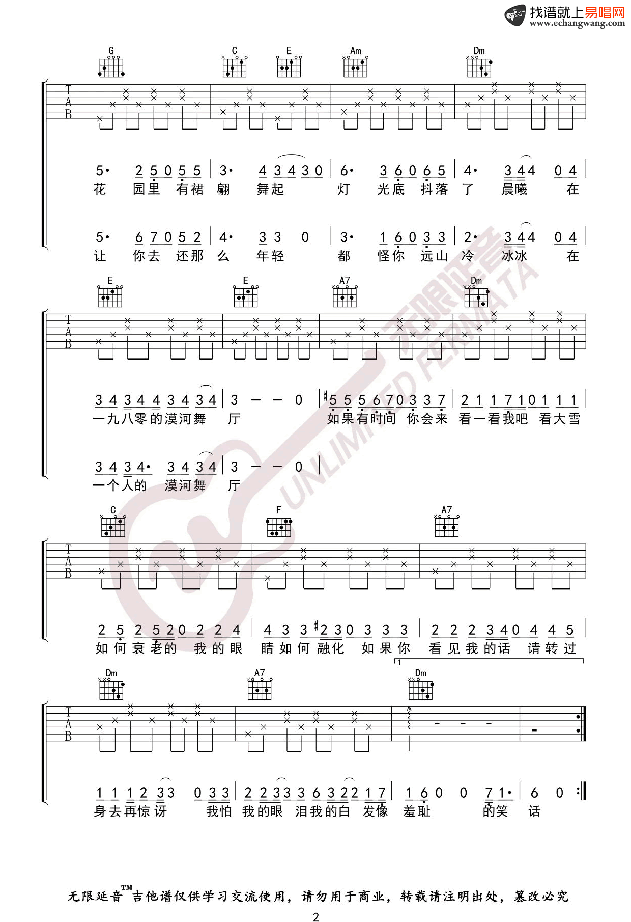 漠河舞厅吉他谱_柳爽_C调指法_弹唱谱 时间:2020-11-02 来源:无限延音 点击:次 《漠河舞厅》吉他谱,柳爽词曲创作演唱的一首歌曲,愿听到这首歌的人都拥有至死不渝的爱情。漠河舞厅六线谱,原调E选调C,变调夹夹第四品,三张弹唱图片谱。无限延音编配分享,易唱吉他谱网站更新。 这首哀伤的歌,创作灵感来自于中国最北端的城市漠河,偶然间听到的一个半个世纪前充满遗憾的深情故事。将它献给那些因不幸而逝去的美好的生命。更送给那些,赋予离去生命继续存在意义的,拥有着爱的人们。