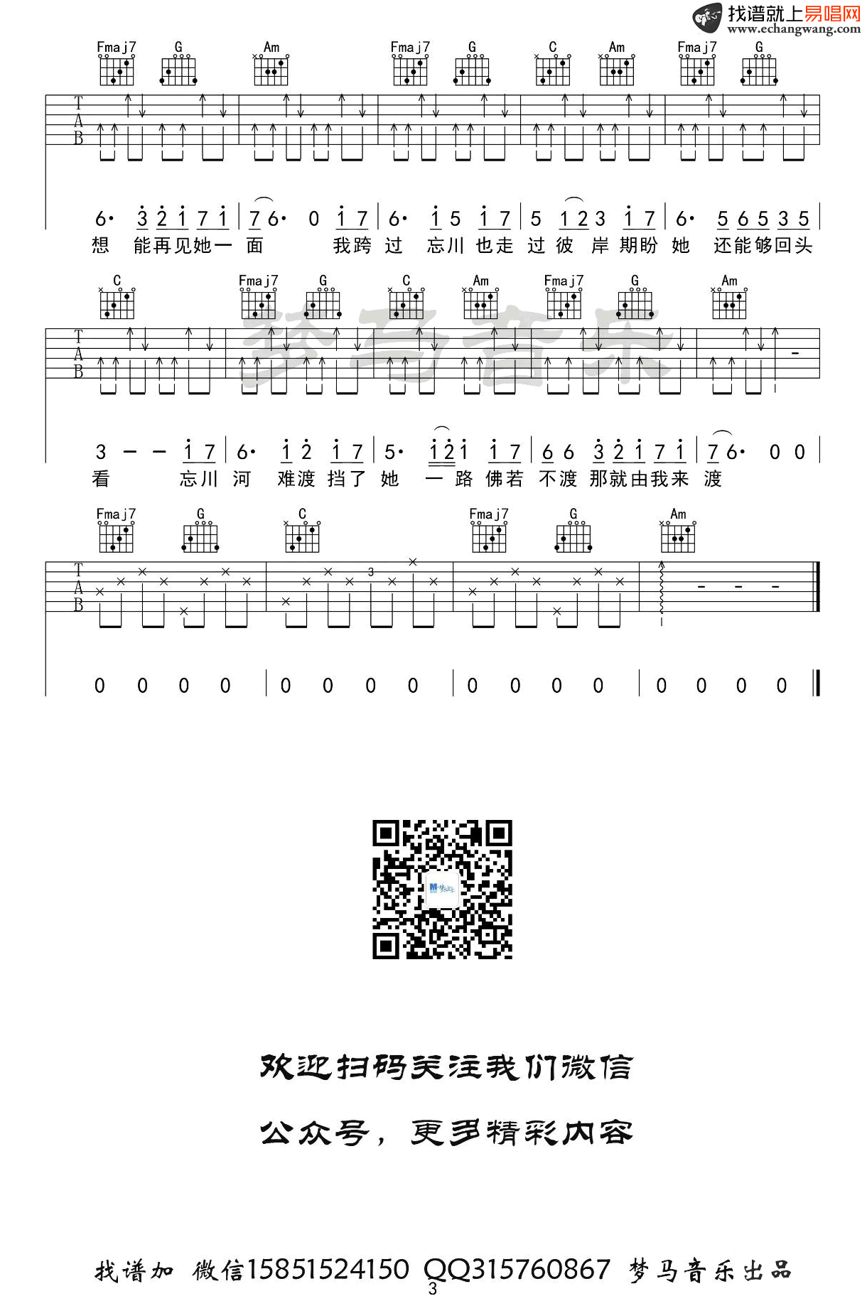忘川彼岸吉他谱_零一九零贰_C调简单版_适合初学者 时间:2020-11-06 来源:梦马音乐 点击:次 《忘川彼岸》吉他谱。零一九零贰演唱,一首抖音热门歌曲。忘川彼岸C调简单版,弹唱六线谱共三张图片。梦马音乐出品,易唱网吉他谱更新上传。 入忘川,一轮回,一转世,如若忘川有彼岸,你是否愿意在河岸为我点一盏不迷路的灯?因为歌曲简单,谱子也做的很简单。很适合初学者演奏。