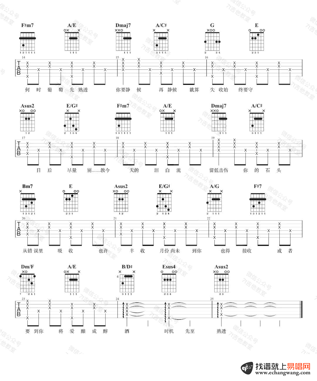 葡萄成熟时吉他谱,陈奕迅的一首粤语歌曲,葡萄成熟时六线谱,原调是Bb大调,用的是A大调的指法来编配(采用了降半音调弦)。如果想弹原调,用标准音调弦并且变调夹夹在第1品就可以。感谢7T吉他编配出品,易唱网上传更新。如果你在广东生活,每年到了冬至时分,你应该会听到有人哼起“差不多冬至,一早一晚还是有雨”,你也会在朋友圈里看到一些人分享这首歌。面对爱情的引诱,面对人生的得失,我们要学会静候,就像种葡萄一样,并不是每个人都那么幸运可以一次丰收。