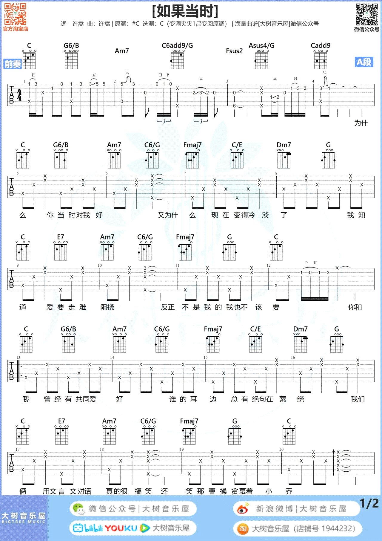 如果当时吉他谱_许嵩_C调弹唱谱_吉他演示视频 时间:2020-11-23 来源:大树音乐屋 点击:次 《如果当时》吉他谱,许嵩的一首歌曲,如果当时吉他弹唱谱,C调指法编配,变调夹夹一品,和弦+六线谱版本,这首歌用到了推弦技巧,琴友们参照吉他演示视频多多练习。大树音乐屋出品,易唱网更新上传。 泪目许嵩的温柔,如果说2009他讲的是难舍难分,青涩稚嫩的爱恋,那么2020就是经过岁月沉淀对过往的缅怀和过尽千帆的淡然。弹唱起来吧,为永远回不去的年少轻狂,和那些在岁月里走丢的人。