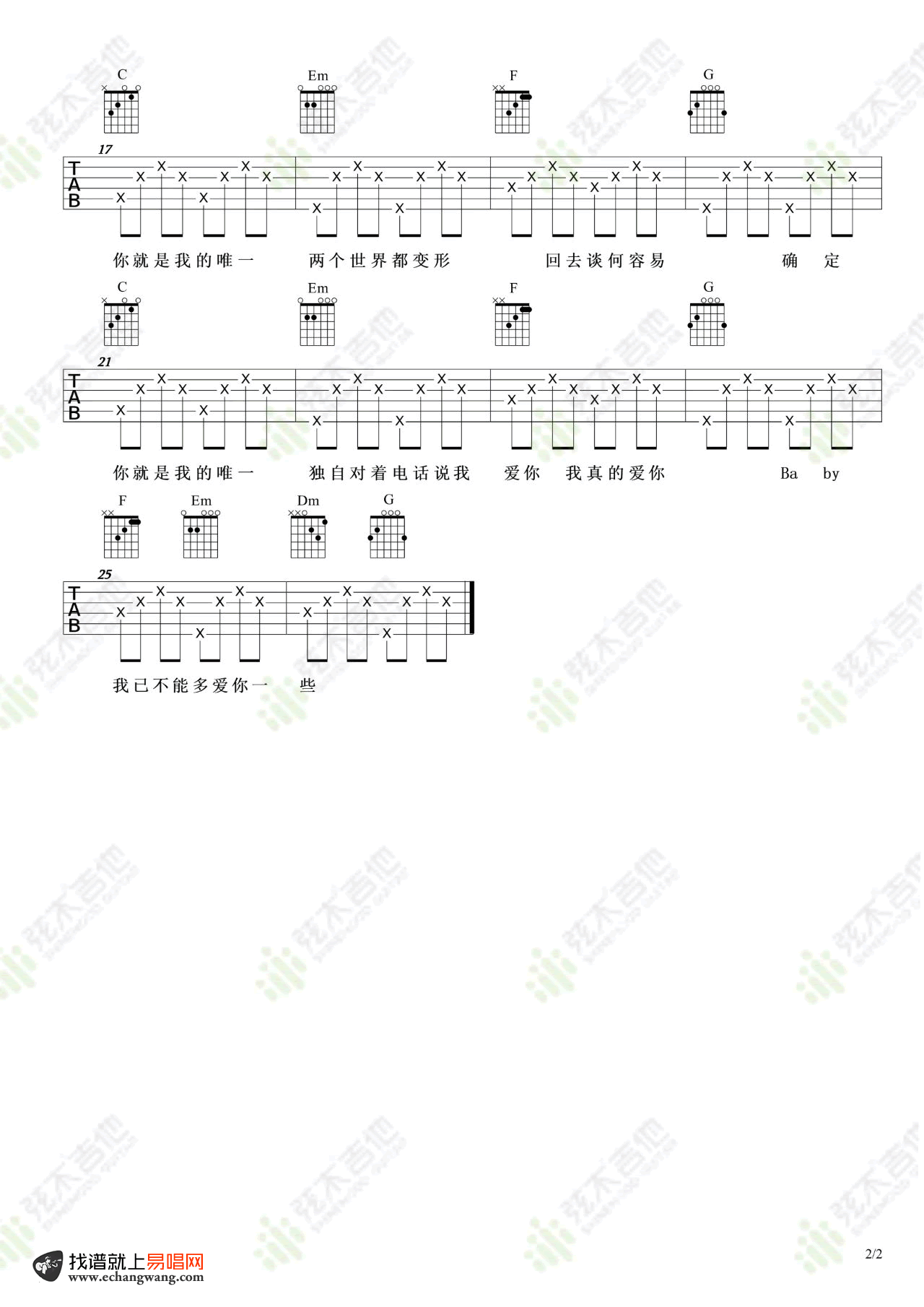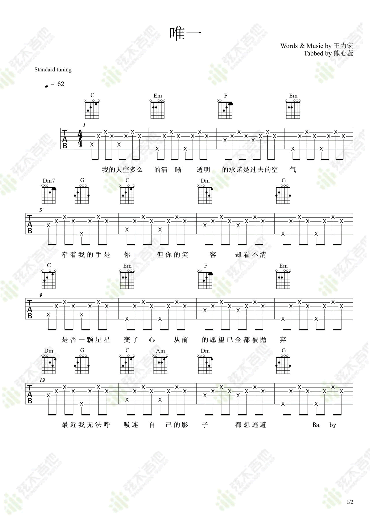 唯一吉他谱_王力宏_C调简单版_弹唱谱 时间:2020-11-24 来源:弦木吉他 点击:次 王力宏《唯一》吉他谱,电影《恋爱通告》的插曲,。唯一吉他弹唱谱,C调编配,两张图片六线谱。弦木吉他出品,易唱网更新上传。 一首王力宏式的情歌,细腻的呈现出自我的心情,将对恋人的深深爱意,勇敢而诚恳的表达,完全融入其中,使其成为百听不厌的经典。