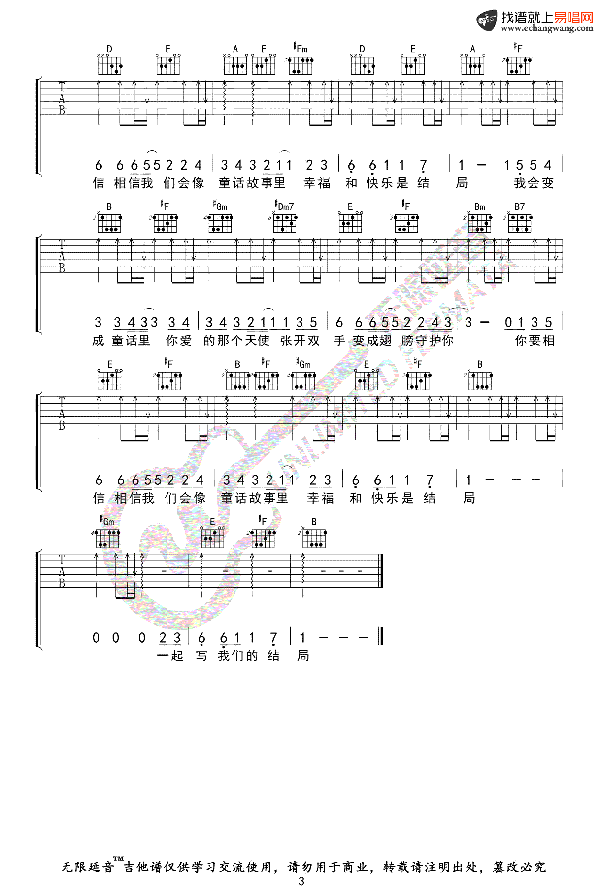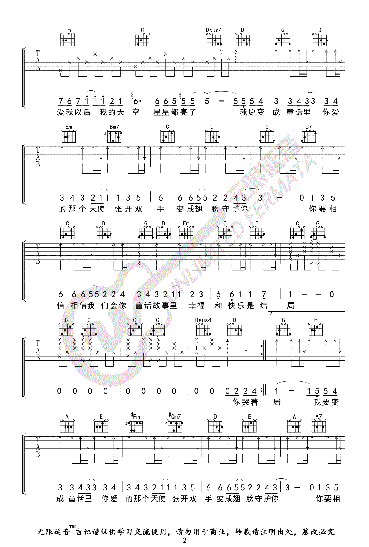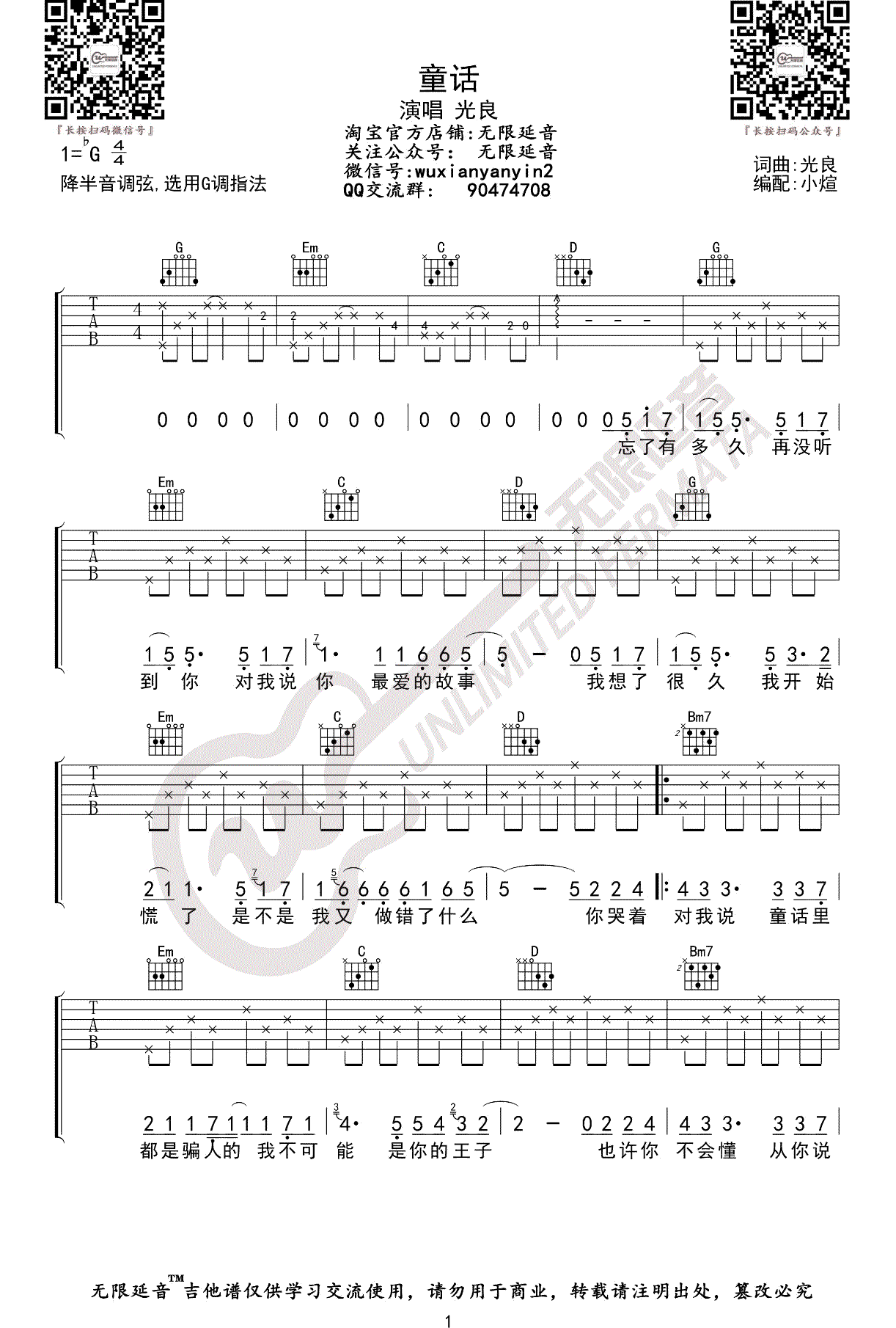 万博体育app官方下载3.0APP-手机APP下载-易唱网echangwang.com 时间:2020-11-26 来源:无限延音 点击:次 《童话》吉他谱,光良的一首代表歌曲,温暖感人的歌声曾一度风靡整个亚洲。童话六线谱,原调降G,降半音调弦,使用G调指法,三张弹唱图片谱,无限延音制谱分享,易唱网更新上传。 一首《童话》陪我们长大,歌曲唱出人们内心深处对美好童话的向往。愿我们都能有那份勇气和能力,张开双手变成翅膀,保护此生所爱,坚信并创造出属于自己的幸福快乐的结局。