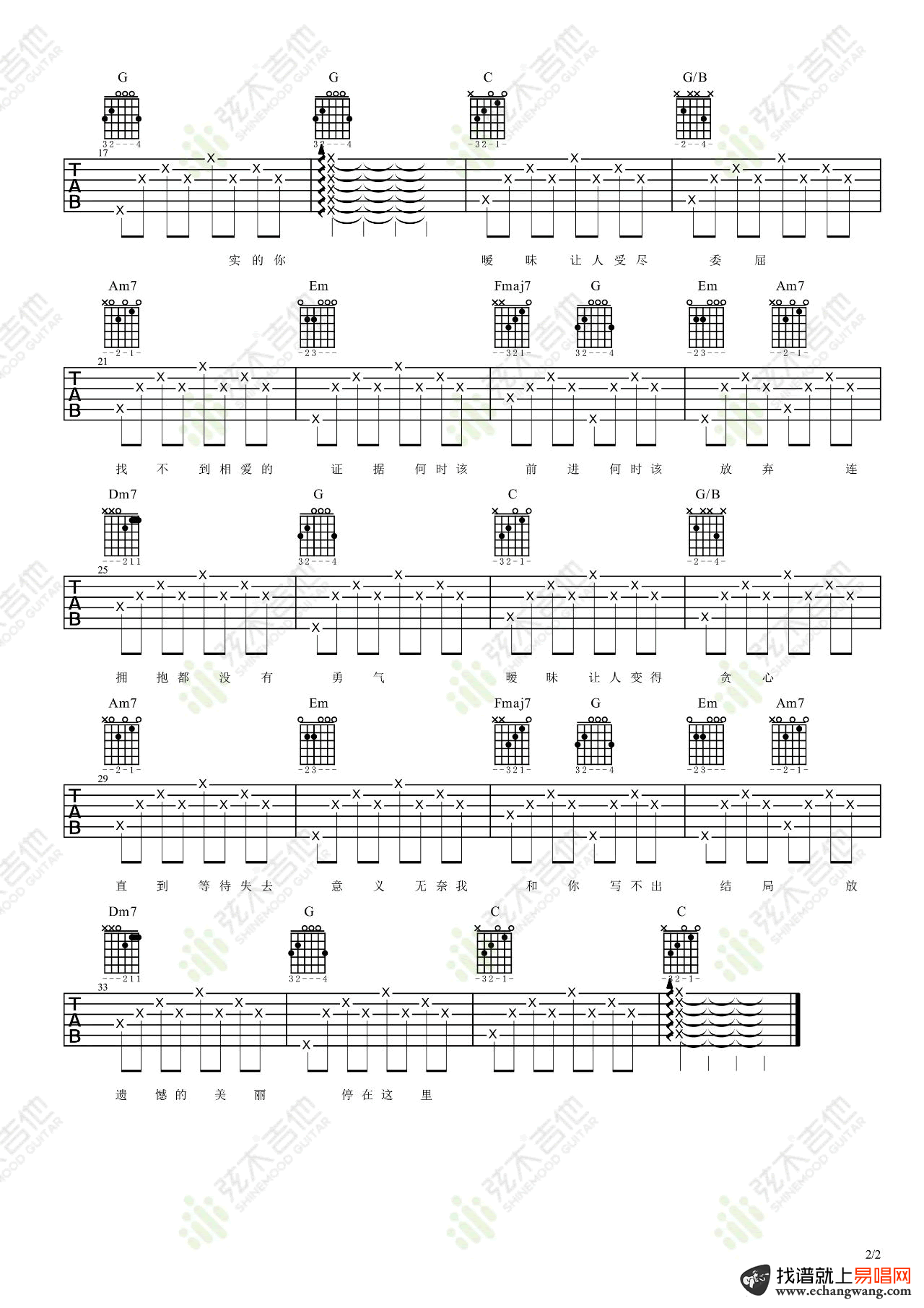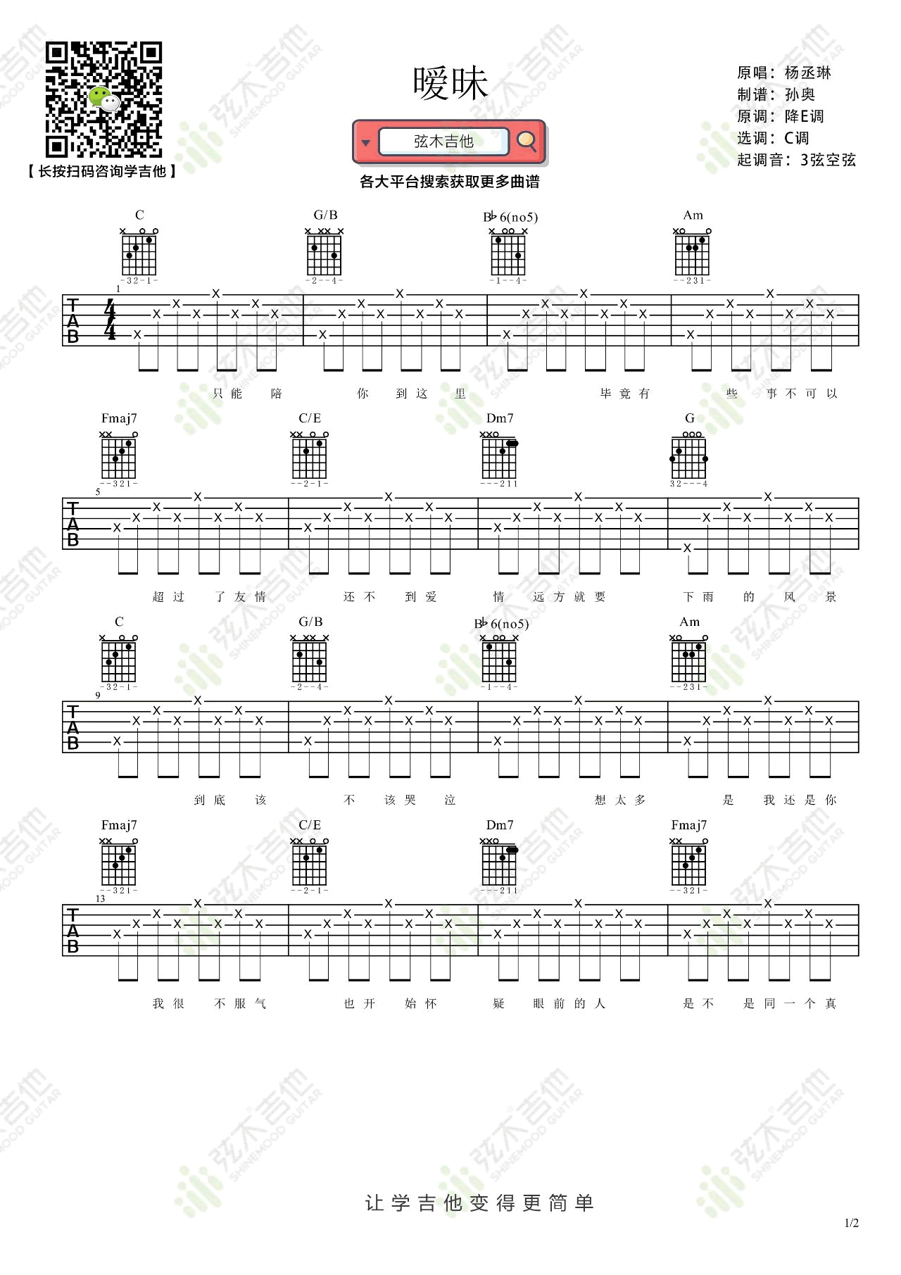 暧昧吉他谱_杨丞琳_C调指法_简单弹唱谱 时间:2020-12-09 来源:弦木吉他 点击:次 《暧昧》吉他谱,杨丞琳的一首代表歌曲,偶像剧《恶魔在身边》的片尾曲。暧昧吉他弹唱谱,原调降E选调C,起调音三弦空弦,两张图片六线谱。弦木吉他编配出品,易唱网更新上传。 青春年少时,我们对爱情懵懵懂懂,小心翼翼的维护和对方的关系,却没有勇气更进一步,这种超过了友情,还不到爱情,就叫暧昧吧……