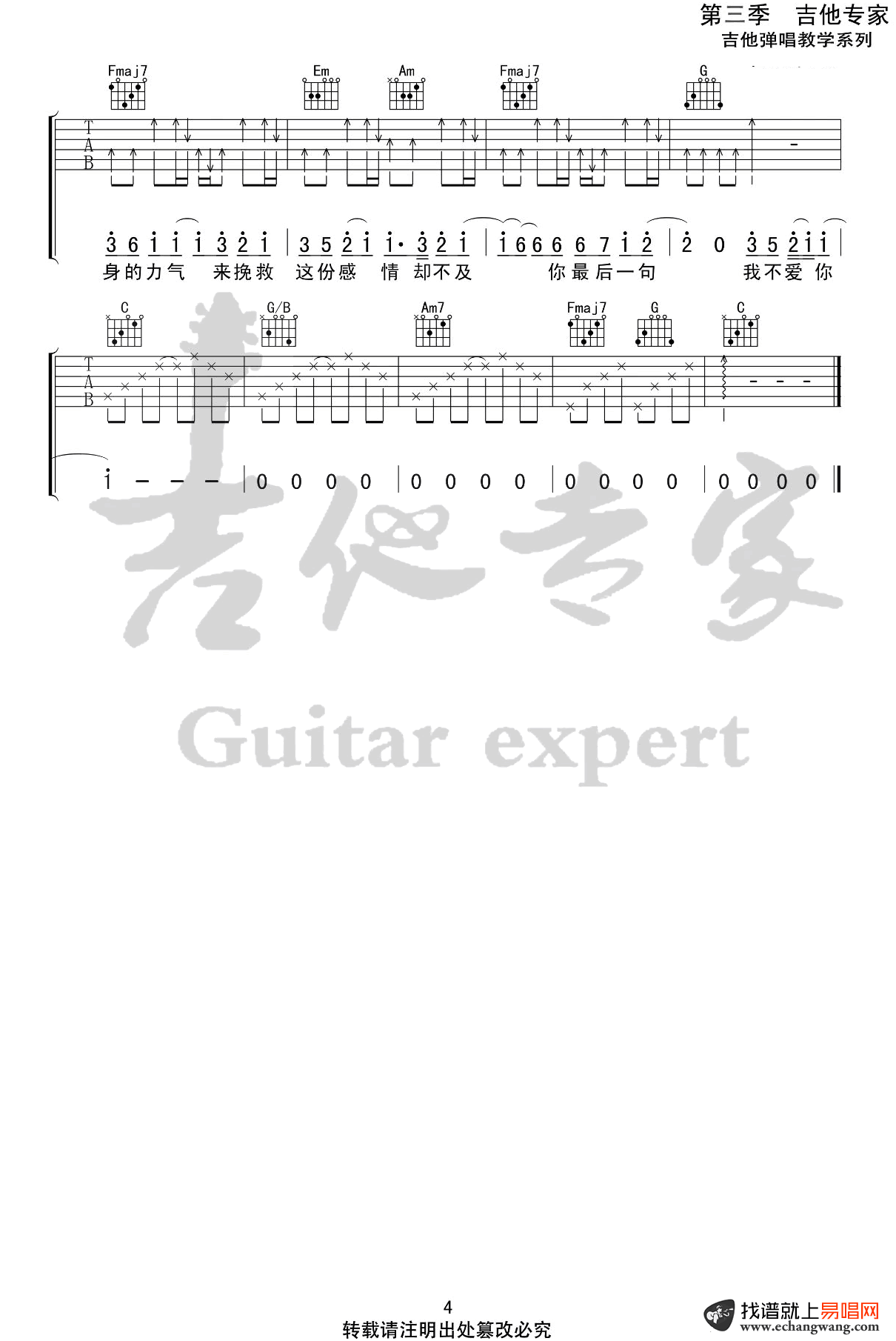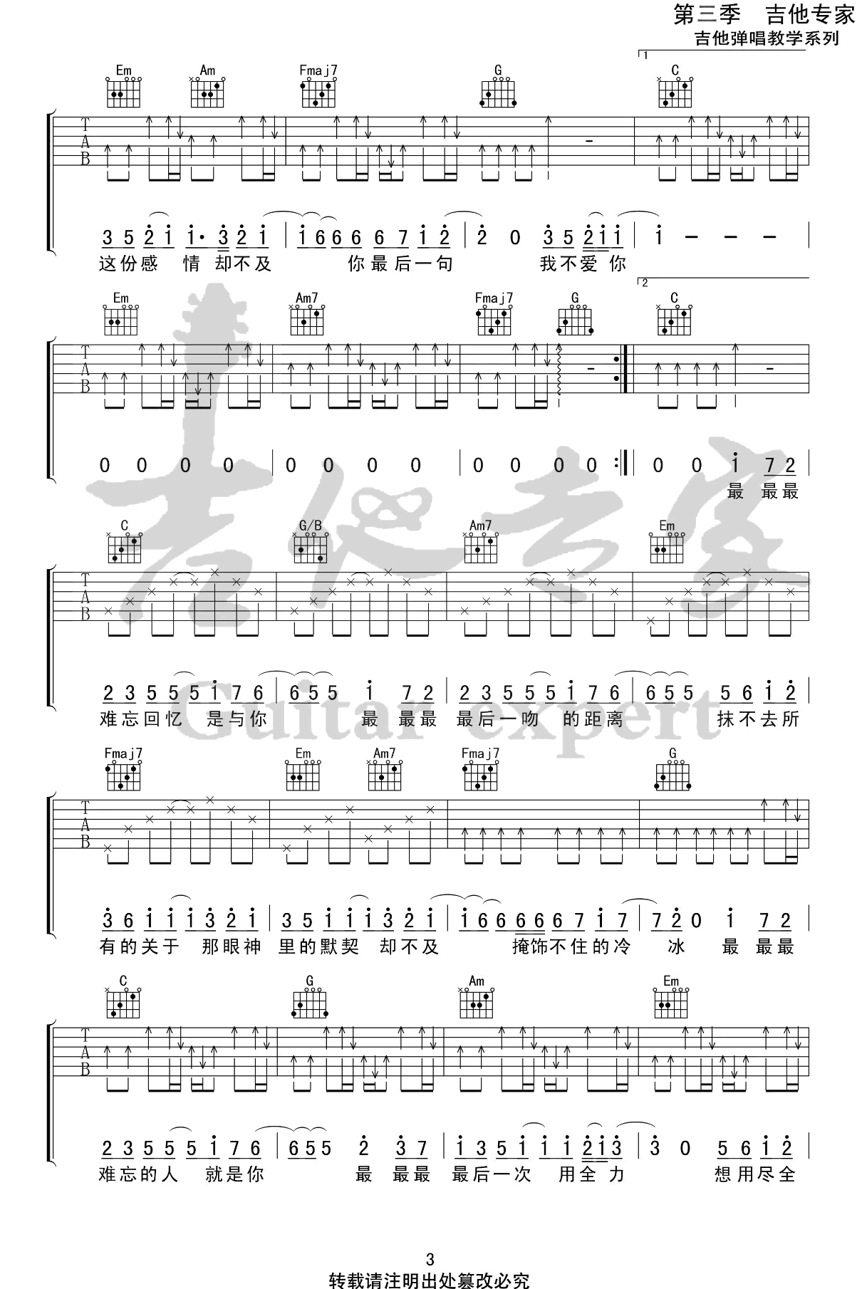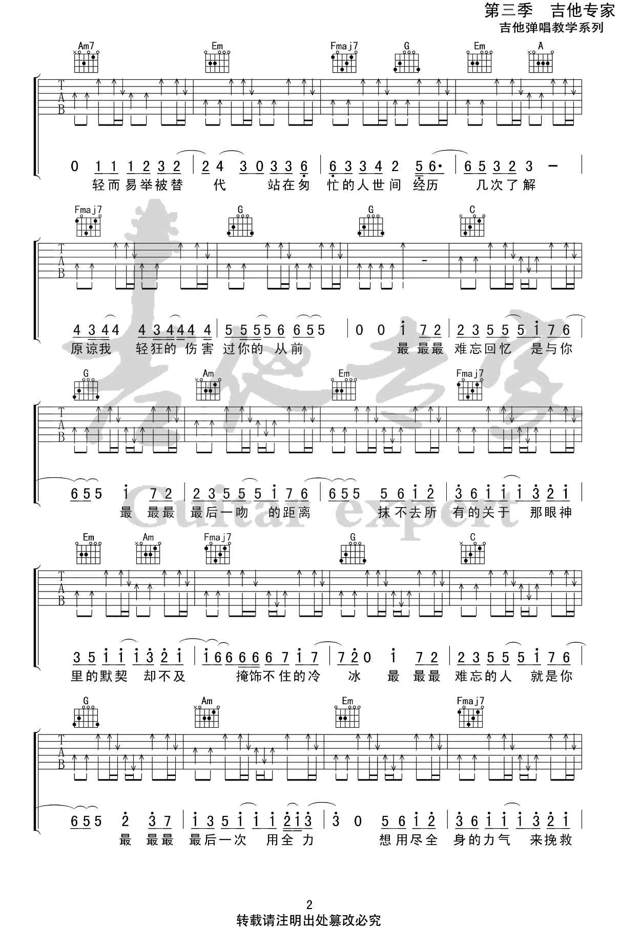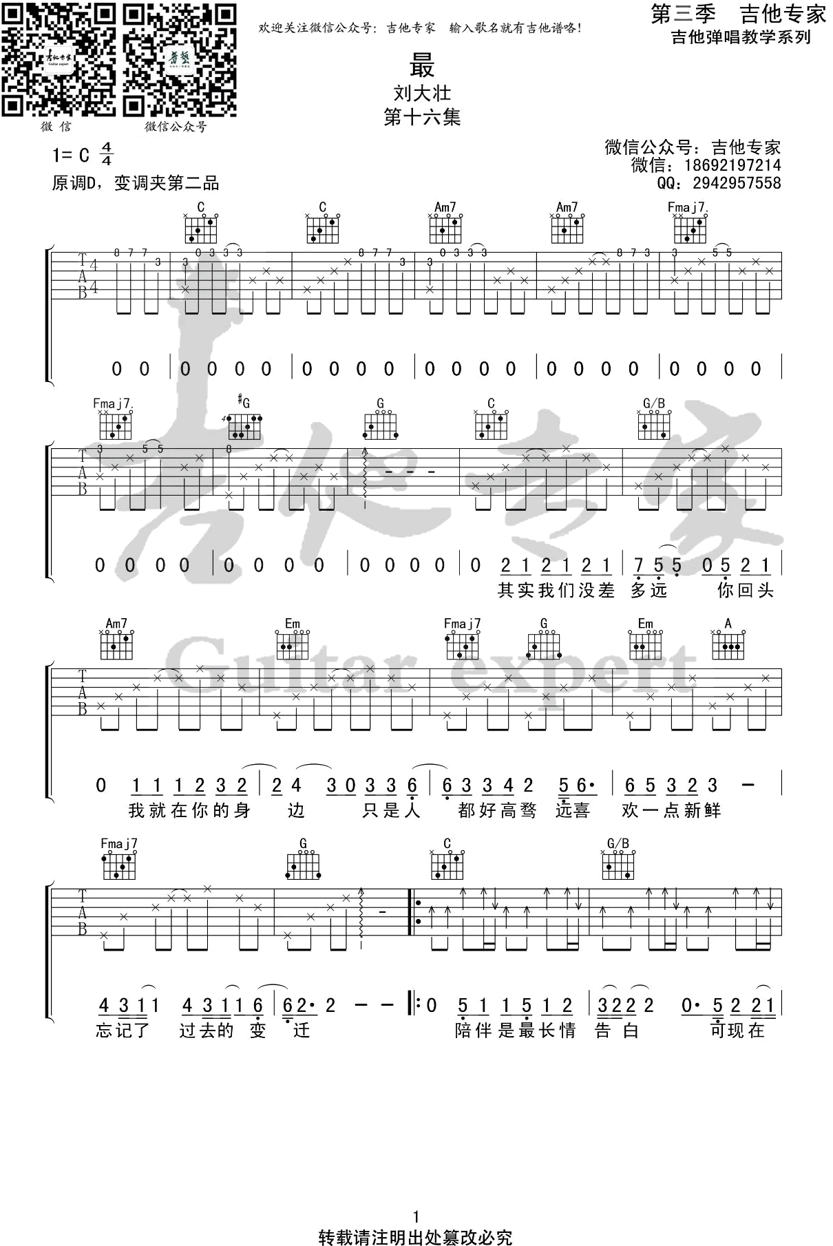 刘大壮《最》吉他谱_C调完整版_弹唱六线谱 时间:2020-12-26 来源:吉他专家 点击:次 最吉他谱,刘大壮演唱的一首新歌,《最》吉他六线谱,原调D,选用了C调指法,变调夹夹二品位置。完整编配版本共四张弹唱图片谱。吉他专家制谱分享,易唱网整理上传。 最最最,难忘回忆是与你一起的点点滴滴的美好回忆。如今我们故事的最后,再也没有机会续写了,心中的千言万语都在这一刻化为叹息,彼此也只剩一句,感谢陪伴,好聚好散。