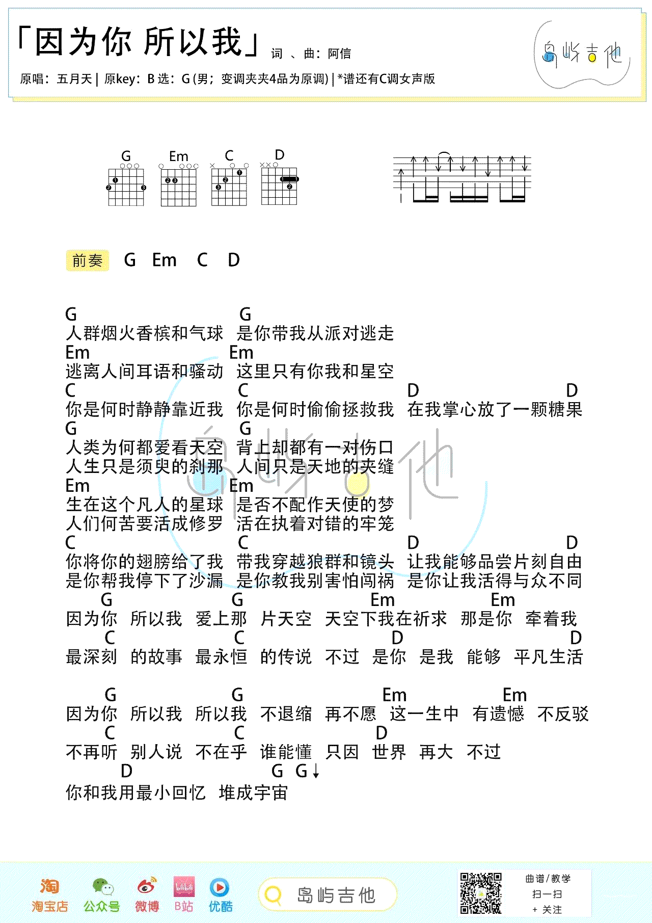 五月天《因为你 所以我》吉他谱_G调男生版+C调女生版 时间:2020-12-28 来源:岛屿吉他 点击:次 《因为你所以我》吉他谱,五月天时隔近三年发布的新歌,因为你所以我吉他弹唱谱,原调B,这里曲谱准备了两个编配版本,方便琴友们选择练习,分别为G调指法男生版,和C调指法女生版,易唱网感谢岛屿吉他制谱分享。 这是一首典型阿信温暖诗歌,五月天式抒情摇滚,唱出世界动荡中人类情感的牵挂与羁绊,彼此珍惜彼此扶持,才能更好的前行。