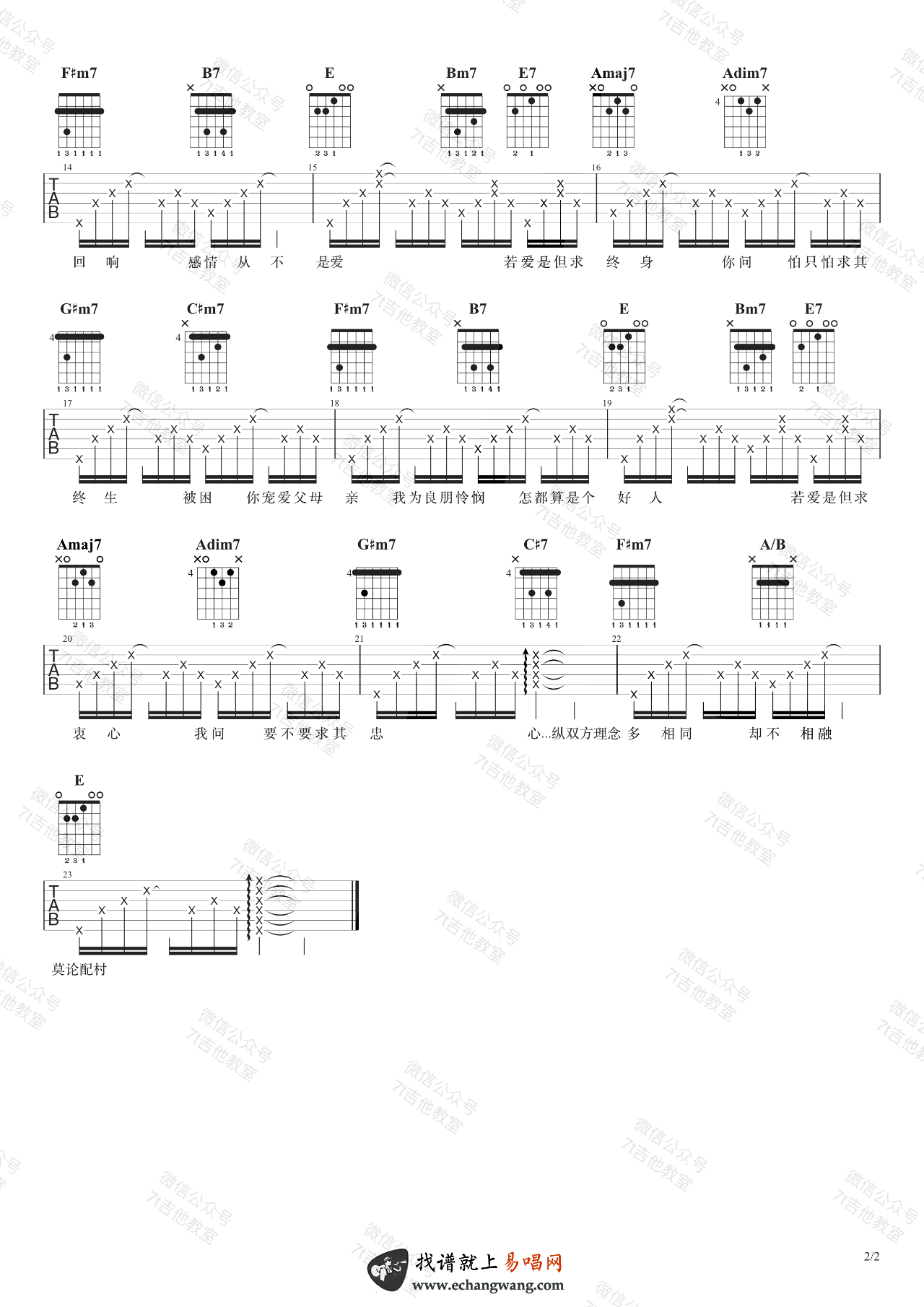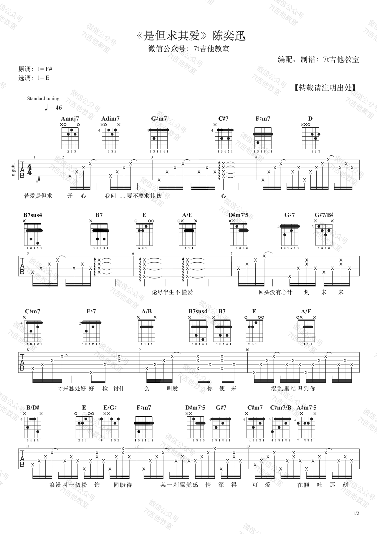 《是但求其爱》吉他谱,陈奕迅一首最新粤语歌曲,是但求其爱吉他六线谱,两张图片谱例。这首歌的原调是F#大调,用的是E大调的指法来编配,视频里是标准音调弦,没有用变调夹。如果想弹原调需要夹第2品哦。易唱网整理分享,感谢7T吉他教室出品。琴友们在演奏时右手节奏型可以自由发挥,不必完全按照谱子上的来弹。对于吉他初学者来说,觉得节奏型太难,可以用最基础的节奏型来代替,一样也会很好听。