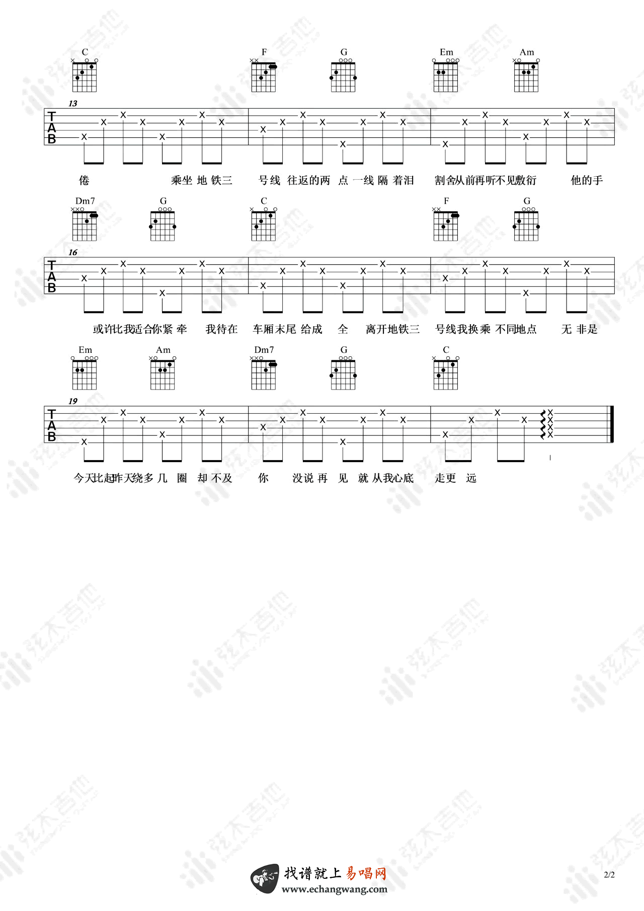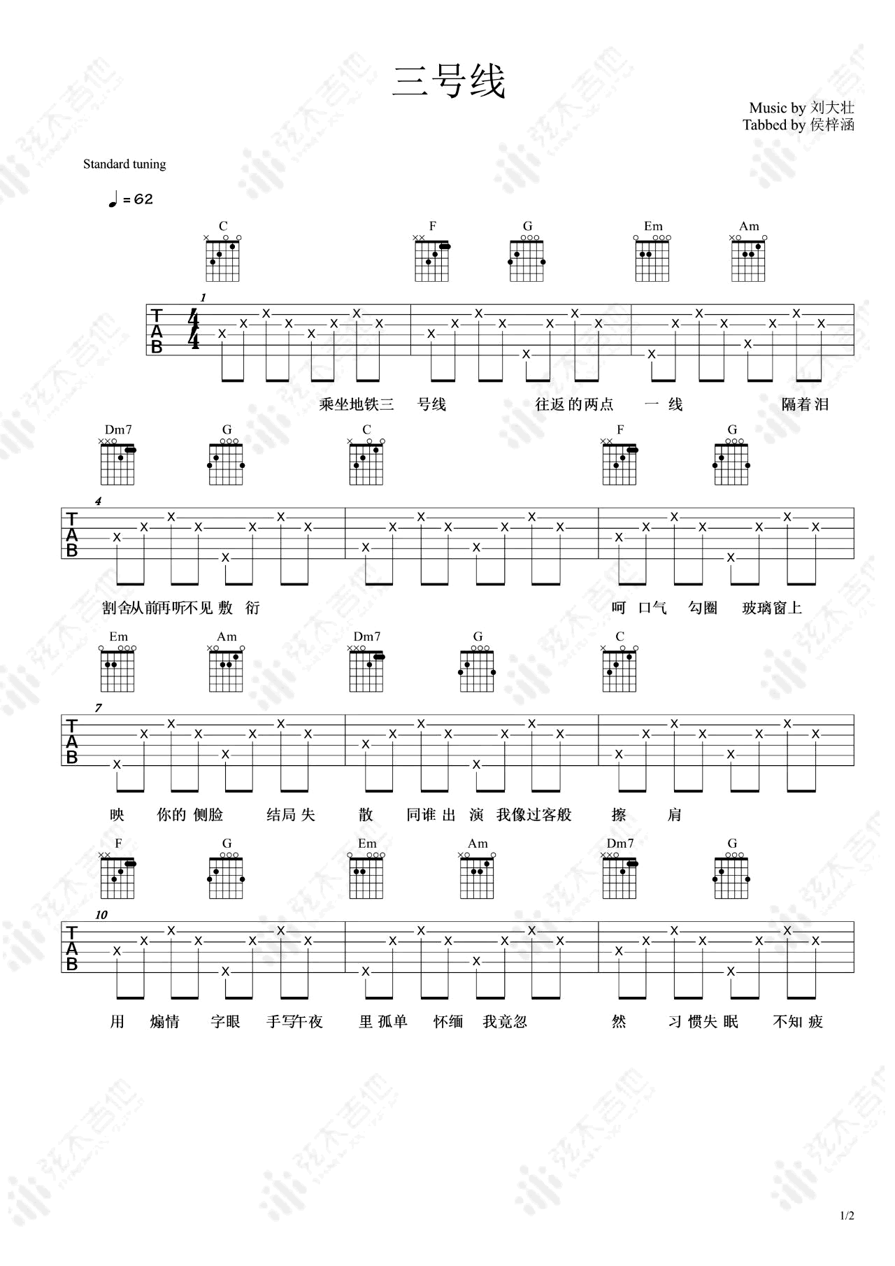 myball-手机APP下载-易唱网echangwang.com 时间:2021-01-02 来源:弦木吉他 点击:次 《三号线》吉他谱。刘大壮的一首伤感情歌,三号线吉他弹唱谱,C调和弦编配,两张图片六线谱,易唱网更新上传,感谢弦木吉他制谱编配分享。 拥挤的地铁三号线,许多爱情故事在上演,但也有许多分手离别提前下了车,曾经熟悉的身影就这样消失就在了人海里,两点一线的生活,再也遇不到你的那个她!