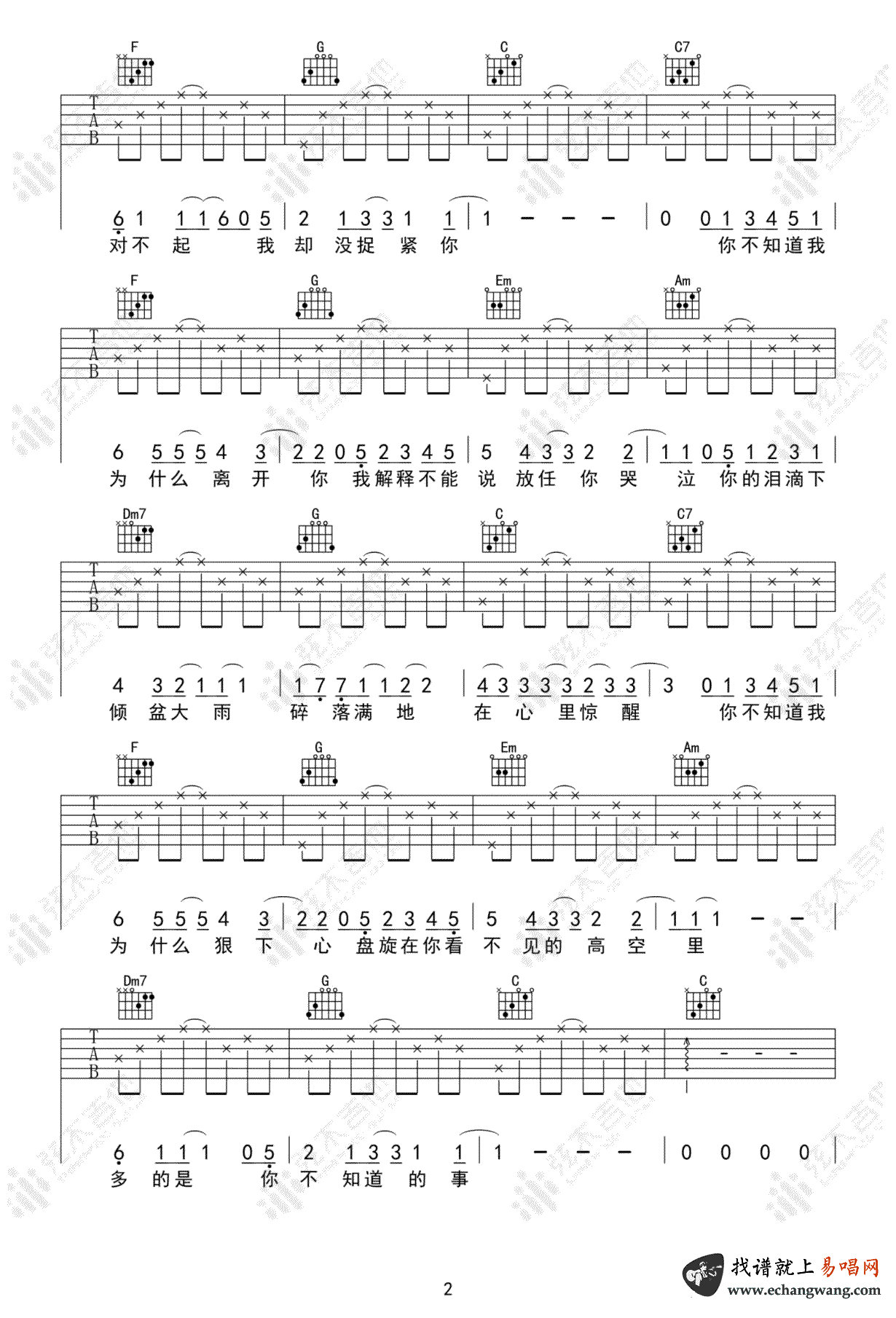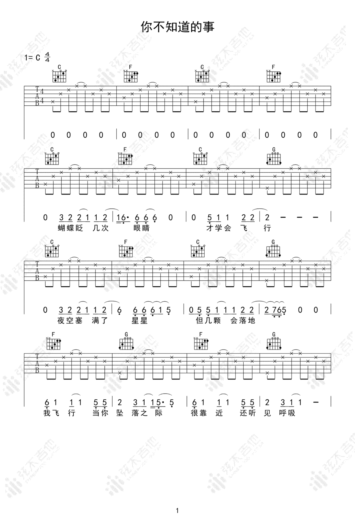 你不知道的事吉他谱_王力宏_C调简单版_弹唱六线谱 时间:2021-01-04 来源:弦木吉他 点击:次 你不知道的事吉他谱,王力宏的一首经典代表歌曲,也是电影《恋爱通告》主题曲,如今已有十年了,传唱度依然很高。你不知道的事吉他六线谱,C调弹唱编配,两张图片谱。易唱网感谢弦木吉他制谱分享。 世上那些无疾而终的爱情故事,包含了多少的无奈和心酸,离开你,也许只是换了一种方式爱你而已。但,那是你不知道的事。唯美动听的旋律,深情直白的歌词,让人轻易陷落在青涩的爱情回忆里。