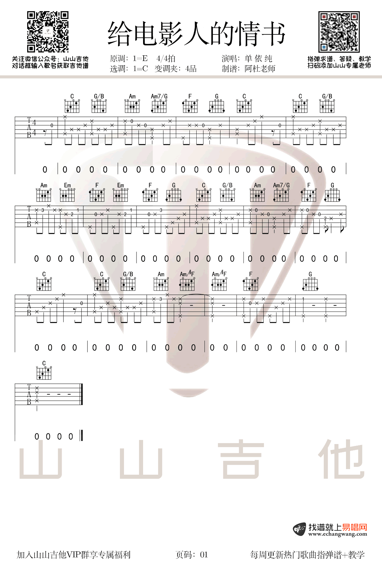 给电影人的情书指弹吉他谱,单依纯演唱,中国好声音节目一首让人回味感动的歌曲。给电影人的情书吉他独奏谱,歌曲原调E,选用C调指法,变调夹夹四品。感谢阿杜老师编配制谱,并为琴友们带来歌曲的指弹演奏视频,大家可以同步曲谱参照示范演示练习。单依纯为张艺谋电影《一秒钟》配唱了这首推广曲,和电影契合度很高,让人忍不住产生共鸣。今天送上这首歌曲的主歌片段指弹版本,希望易唱网的琴友们喜欢。