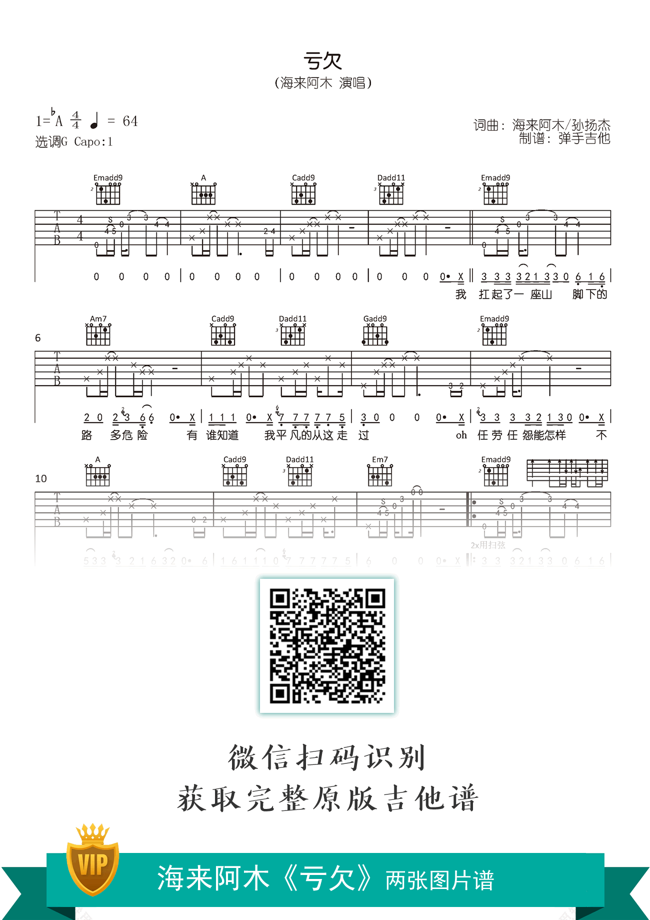 亏欠吉他谱_海来阿木_G调弹唱谱_高清六线谱 时间:2021-01-13 来源:弹手吉他 点击:次 《亏欠》吉他谱,海来阿木词曲演唱的一首歌曲,亏欠六线谱,G调指法编配,完整版共两张高清弹唱图片谱,易唱网推荐收藏,感谢琴友们对付费曲谱的支持,让我们能走得更长远。 用情至深感人的一首歌曲,唱出爱与生活的两难,海来阿木的歌声,总能够打动我们的心坎,让从不轻易流泪的我们,在夜深人静的时候湿了眼眶。