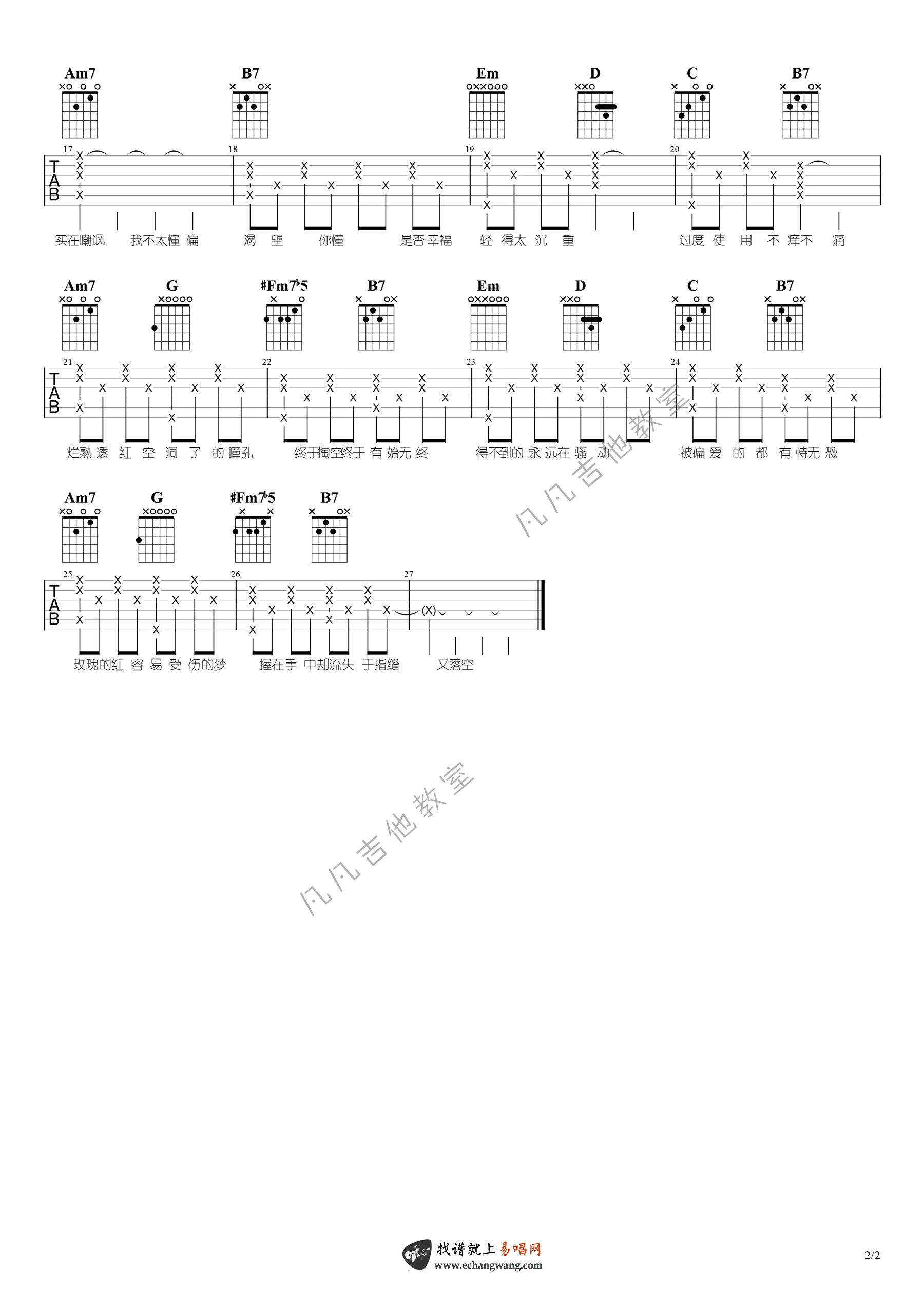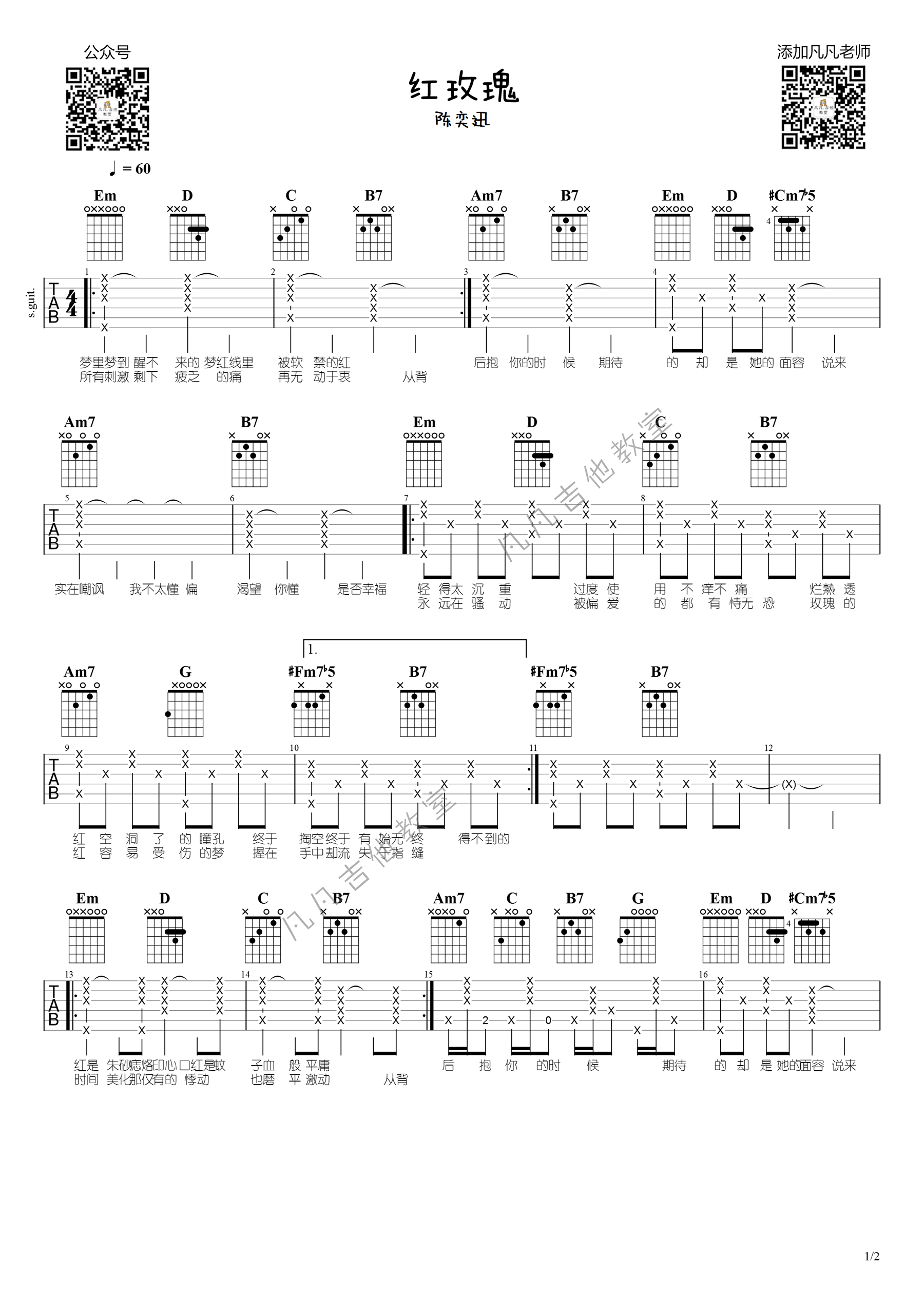 红玫瑰吉他谱_张碧晨_弹唱谱_吉他演示视频 时间:2021-01-24 来源:凡凡吉他教室 点击:次 红玫瑰吉他谱,张碧晨版本,原唱陈奕迅。红玫瑰吉他六线谱,两个和弦不太好换,#Cm7-5、#Fm7-5,多加练习。由于加切音不好弹,所以吉他谱没加。中间有一次变速。大家看着歌词,注意需要反复的地方。 随谱附上老师带来的《红玫瑰》吉他弹唱视频,喜欢这首歌曲的琴友们,可以跟随演示练习。感谢凡凡吉他教室编配出品。