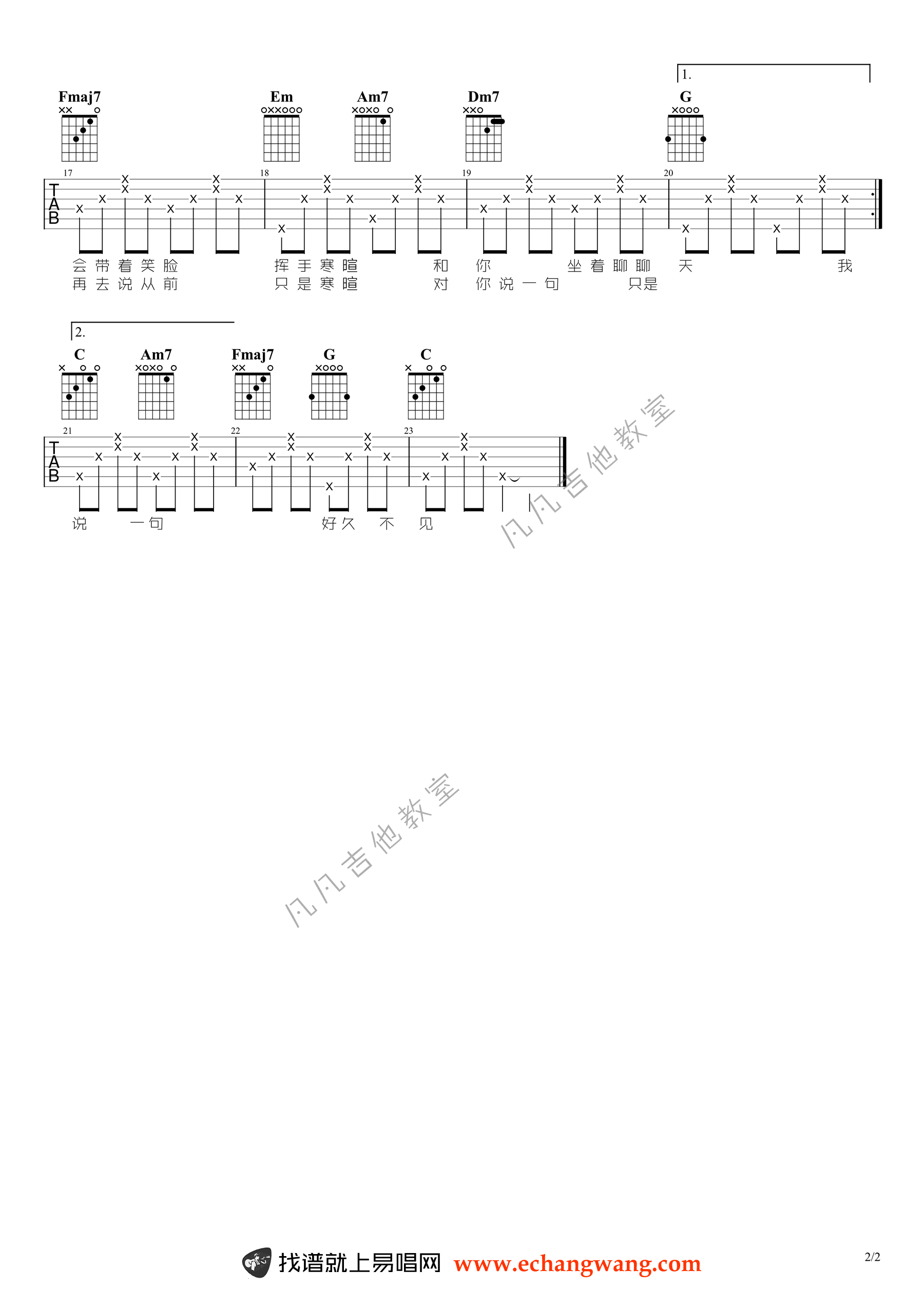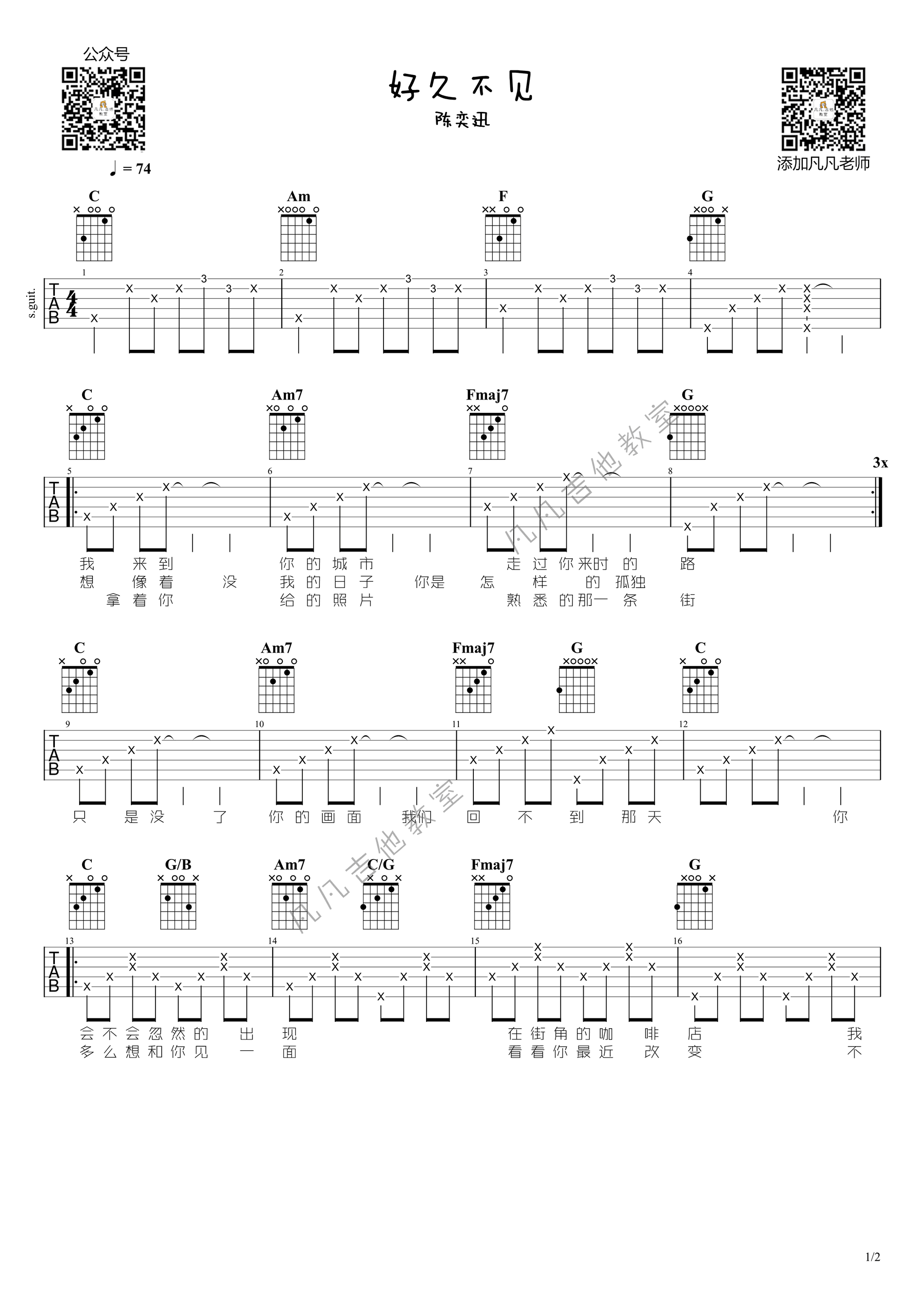 好久不见吉他谱_陈奕迅_C调简单版_吉他演示视频 时间:2021-01-27 来源:凡凡吉他教室 点击:次 好久不见吉他谱,C调简单版,《陈奕迅演唱的一首经典情歌,好久不见》吉他弹唱谱,注意反复。3X表示总的弹3次。看着歌词主要反复的段落。整首歌比较简单。凡凡吉他教室,易唱网整理上传。 你送的吉他依然放置原地,你用过的单反再也没有开启,是因为已经遗忘还是刻意回避…你是否会和我一样用记忆支撑着慢慢前行。随谱附上《好久不见》吉他弹唱视频,琴友们参照老师的演示练习。