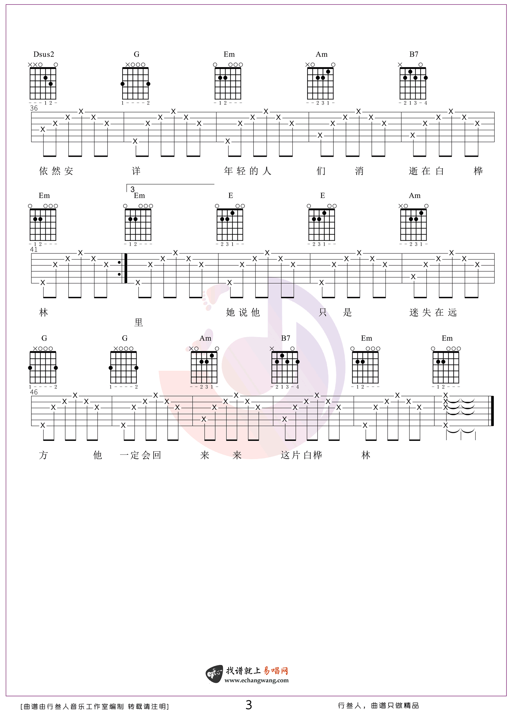 白桦林吉他谱,朴树的一首经典民谣歌曲,白桦林吉他六线谱,歌曲选用G调指法,变调夹夹一品。三张高清弹唱图片谱。感谢行叁人音乐编配出品,易唱网更新上传。随谱附上小白老师带来的吉他弹唱教学视频,琴友们参照讲解练习。整首曲谱在难度上做了调整,既尽可能保持了原曲e小调的味道,又给初学者以伴奏学习上的提升感,弹奏过程中注意歌曲和弦bossline 的行进,把握3/4拍的强弱,适合C级学员。
