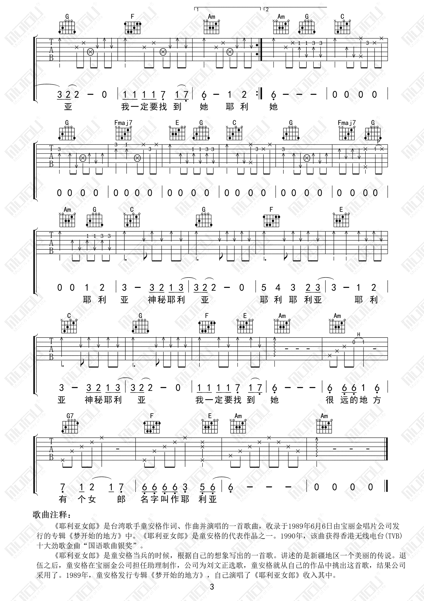 耶利亚女郎吉他谱_童安格_C调_弹唱谱_经典老歌 时间:2021-02-08 来源:木头吉他屋 点击:次 耶利亚女郎吉他谱,童安格演唱,一首90年代风靡大江南北的台湾国语流行经典老歌,耶利亚女郎六线谱,C调弹唱编配,三张图片谱例。木头吉他屋制谱分享,易唱网更新上传。 童安格词曲创作的代表作品之一,原唱是刘文正,胡彦斌在《我是歌手》舞台上曾经有过翻唱。歌曲用稍显忧郁的吉他作为伴奏,曲调优美,歌词也令人印象深刻。