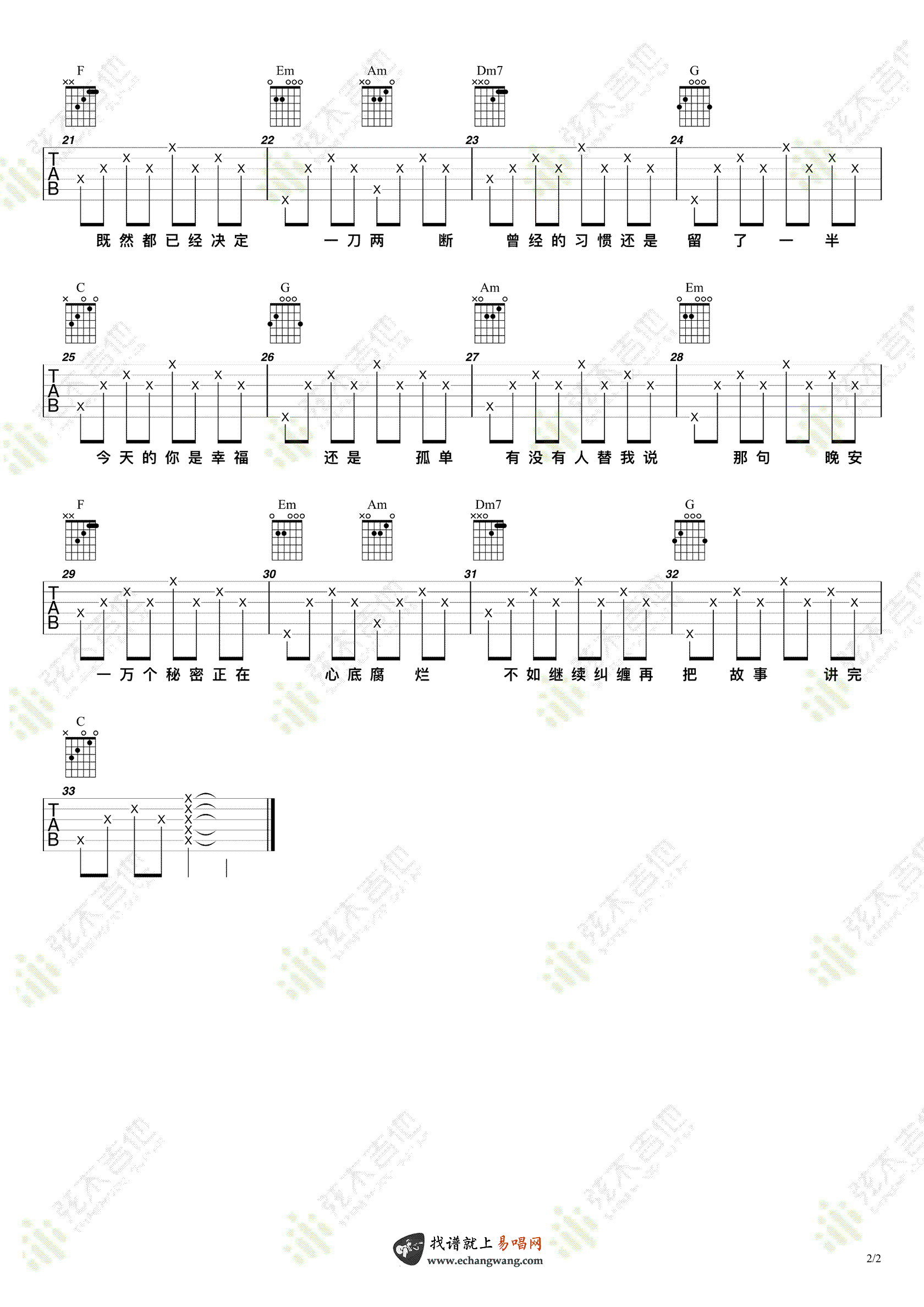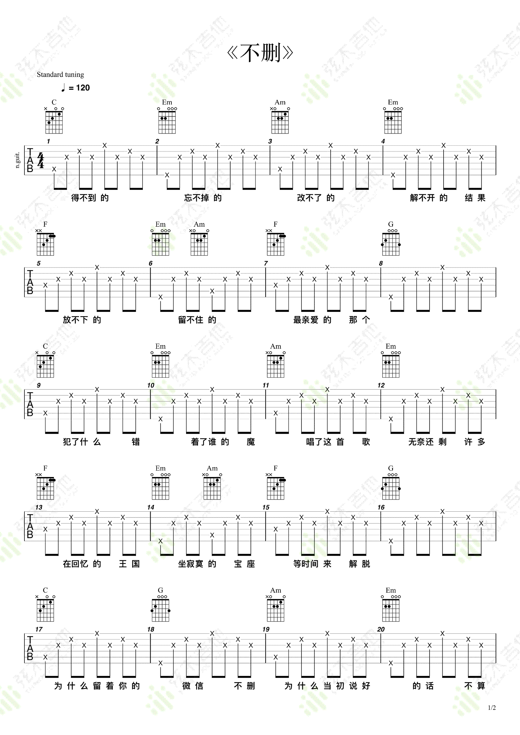 井胧《不删》吉他谱_C调简单版_高清图片谱 时间:2021-02-24 来源:弦木吉他 点击:次 不删吉他谱,井胧演唱的一首网络歌曲,不删吉他弹唱谱,C调简单版,两张图片六线谱。弦木吉他编配制谱,高清谱由易唱网整理上传。 有些故人,虽许久不联系,却也舍不得删掉。可我们终归是要往前走的,不是吗?有人走,才能有人来。所以啊,把这个位置留出来吧,让我们对接下来的人生说一句,你好! 对后来的人说一句,欢迎光临!