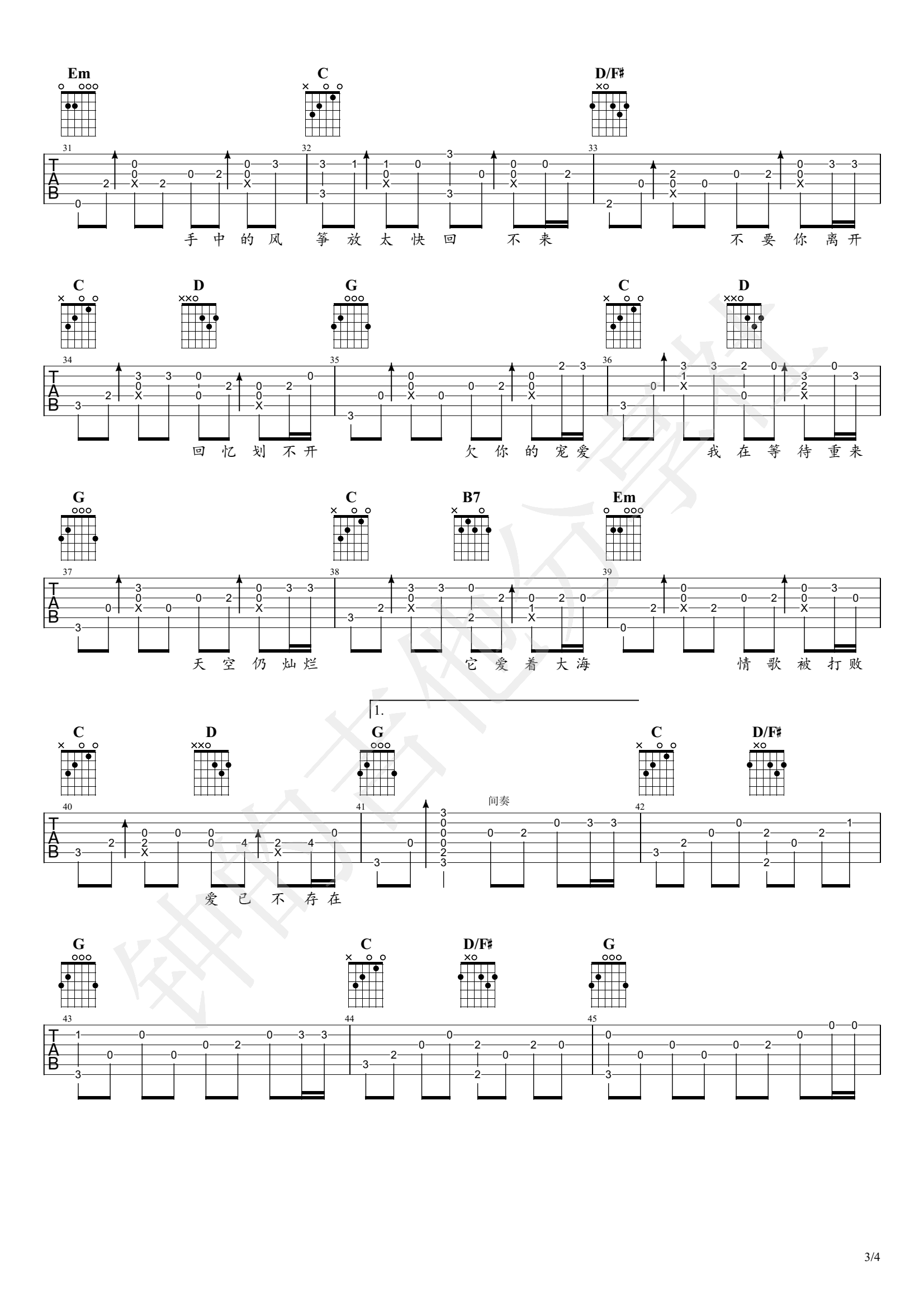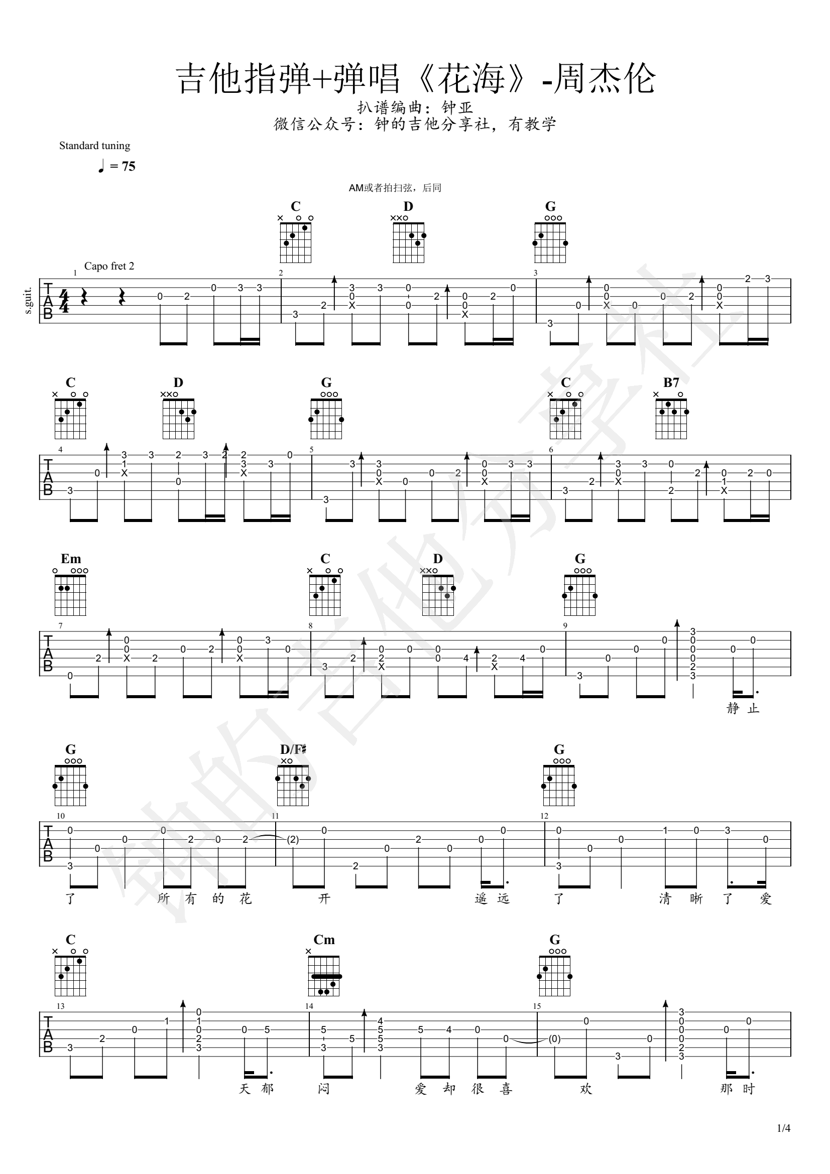 花海指弹吉他谱_周杰伦_弹唱+指弹吉他演示视频 时间:2021-02-27 来源:钟亚 点击:次 花海指弹谱,周杰伦的一首经典情歌改编,花海吉他独奏谱,原调B调,标准调弦,Capo夹二品,G调和弦指法编配,完整版共四张图片谱例。随谱附上吉他指弹视频,感谢钟的吉他分享社制谱出品,易唱网整理更新。 钟亚老师编配说明:谱子做的是完整的,有间奏,视频示范就不弹全部了。用指弹谱唱歌,比用弹唱谱唱歌更容易找到歌曲的节奏,不容易跑调。听起来也很特别,不想唱的时候又可以独奏,不过谱子挺难背下来。
