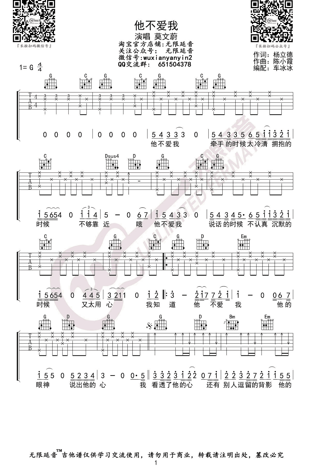 他不爱我吉他谱_莫文蔚_G调弹唱谱_经典失恋情歌 时间:2021-03-08 来源:无限延音 点击:次 他不爱我吉他谱,莫文蔚的一首经典代表作品,声声催泪的失恋情歌。他不爱我六线谱,G调弹唱编配,两张图片谱例。无限延音制谱分享,易唱网更新上传。 触动心灵的一首歌曲,唱尽爱情的离愁。黯然斩情丝,凭歌悼回忆,“他不爱我”或许是一种遗憾,但说不定,它也是你和另一个他相遇的机缘。