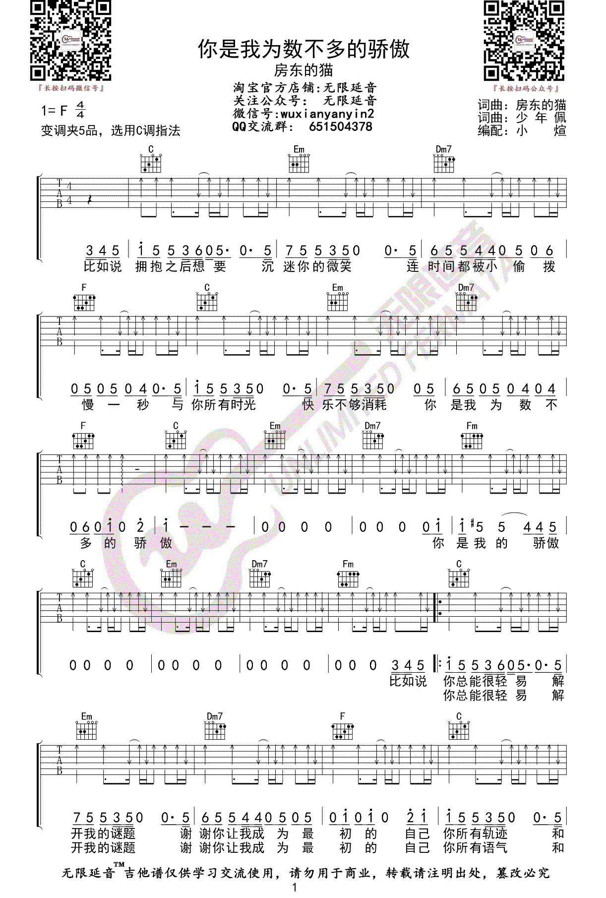 你是我为数不多的骄傲吉他谱_房东的猫_C调弹唱谱 时间:2021-03-11 来源:无限延音 点击:次 你是我为数不多的骄傲吉他谱,房东的猫演唱的一首新歌,你是我为数不多的骄傲吉他六线谱,原调F,选调C,变调夹夹第五品。三张图片弹唱谱例,易唱网感谢无限延音制谱分享。 听房东的猫的歌,有一种祥和安静的感觉,那是一种让人能静心的治愈良药,那娟娟如溪流的曲调,那慵懒和漫不经心的清澈声音,唱出我们每个人的真实内心渴望。