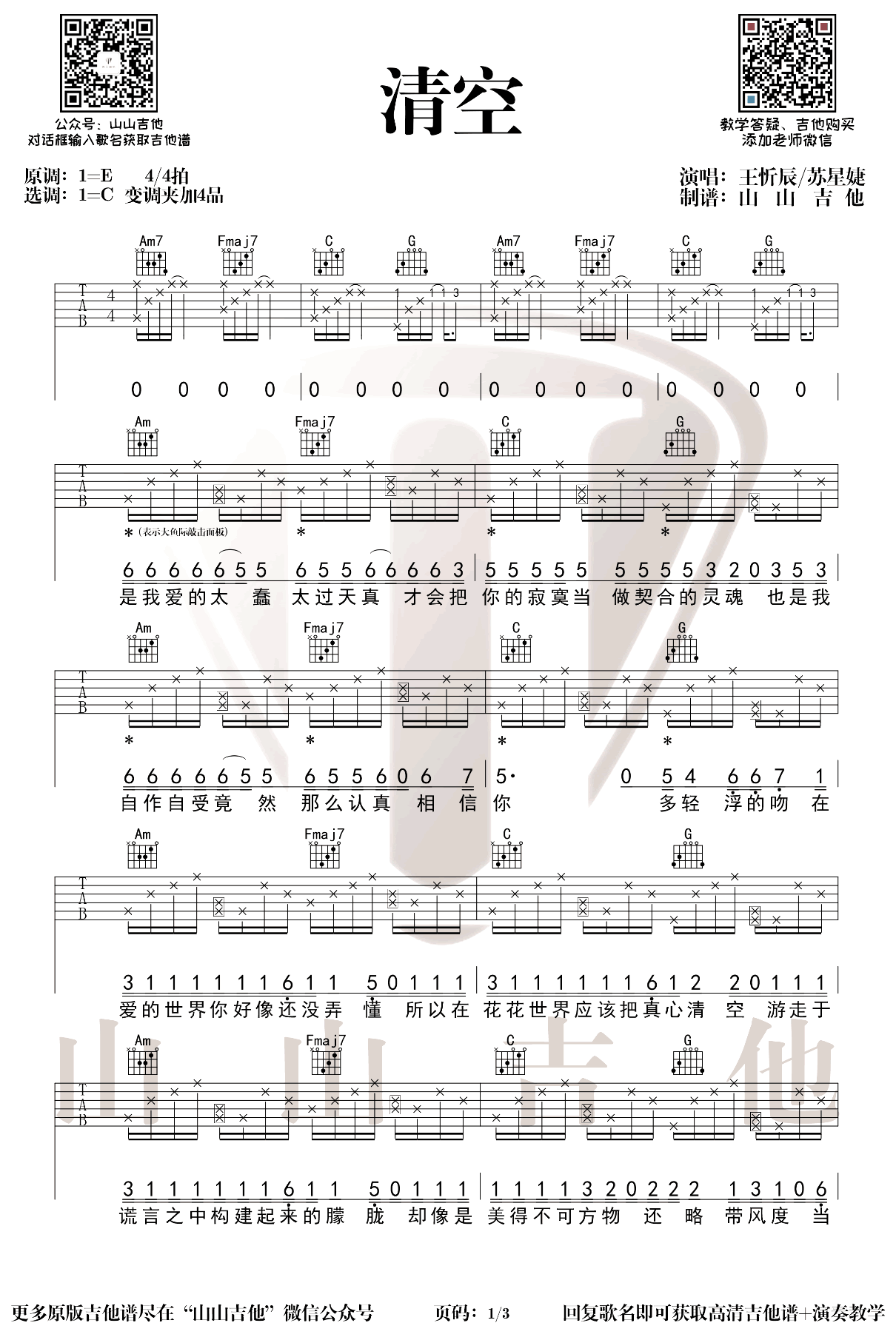 清空吉他谱_C调指法_带打板技巧_吉他弹唱演示 时间:2021-03-12 来源:山山吉他 点击:次 清空吉他谱,王忻辰/苏星婕演唱的网络热门歌曲,清空六线谱,原调E选调C,CAPO夹四品,三张图片谱。感谢山山吉他制谱编配,易唱网吉他谱上传分享。 结合歌曲的鼓点和节奏,制作了这张带打板和拍弦技巧的吉他谱,随谱附上《清空》吉他弹唱视频,琴友们喜欢这首歌可以参考演示练习起来。