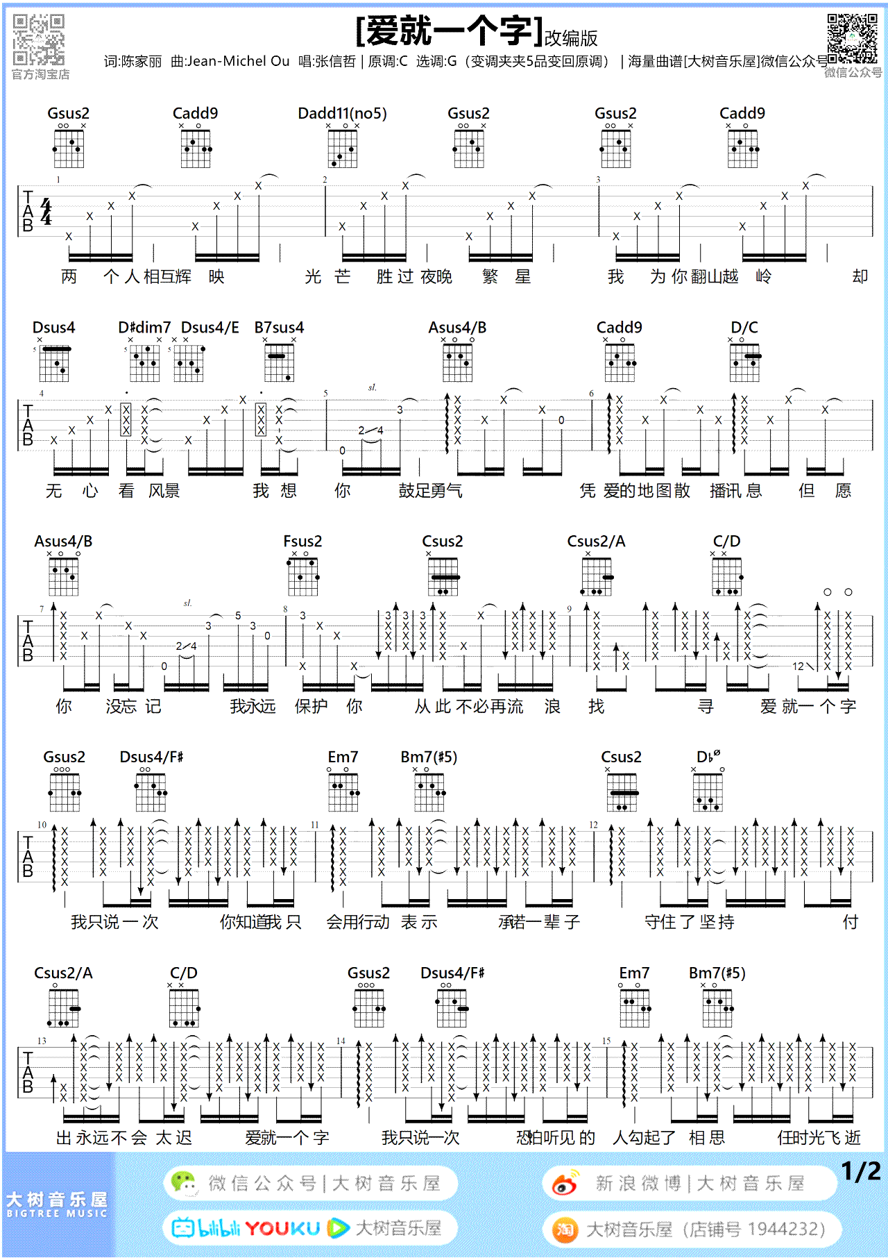 爱就一个字吉他谱_张信哲/V仔改编版_弹唱教学视频 时间:2021-03-15 来源:大树吉他屋 点击:次 爱就一个字吉他谱,张信哲演唱的一首经典,也是动画电影《宝莲灯》的主题曲,这里送上的是网络大火的V仔改编版,爱就一个字吉他弹唱谱,C调和弦图片谱+G调六线谱编配,感谢大树音乐屋制谱出品,易唱网整理上传。 我为你翻山越岭,却无心看风景。这首老歌最近又在网上翻红了,老师带来吉他弹唱教学视频,喜欢的琴友们不可错过,赶紧参照讲解练习起来。