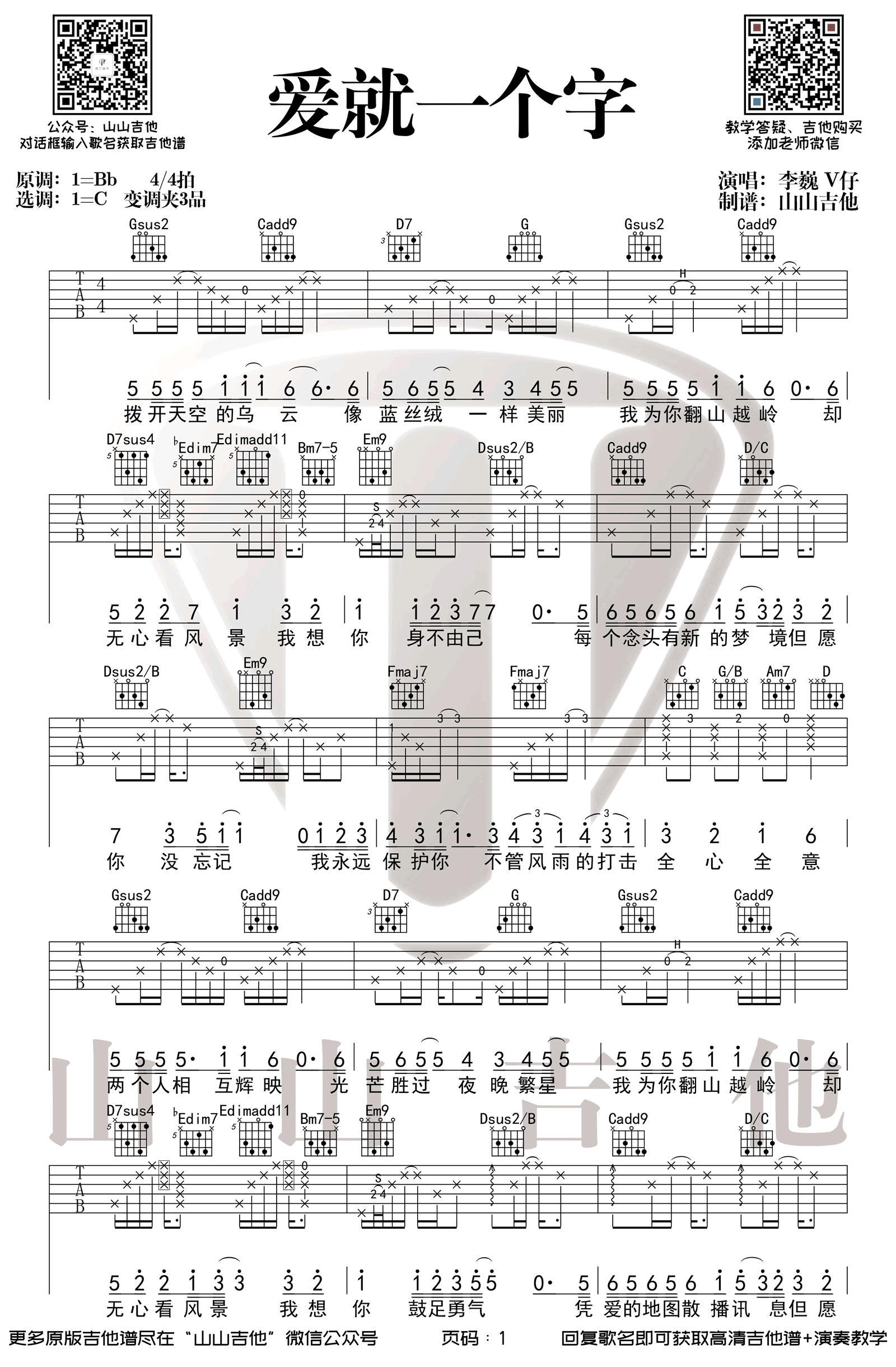 亚美am8ag-手机APP下载-易唱网echangwang.com 时间:2021-03-19 来源:山山吉他 点击:次 爱就一个字吉他谱,抖音李巍V仔版本,歌曲原唱是张信哲,动画电影《宝莲灯》片尾主题曲。爱就一个字六线谱,原调降B,选用C调指法编配,变调夹夹第三品。原版和弦编配共两张图片谱例。山山吉他制谱出品,易唱网更新上传。 吉他版比原音温柔治愈很多,真的让人喜欢,张信哲唱出了遗憾,V仔唱出了尽力,唱出了一种,爱就是要尽力,不给自己留遗憾,最起码回首时,看看自己还是满意的点点头。