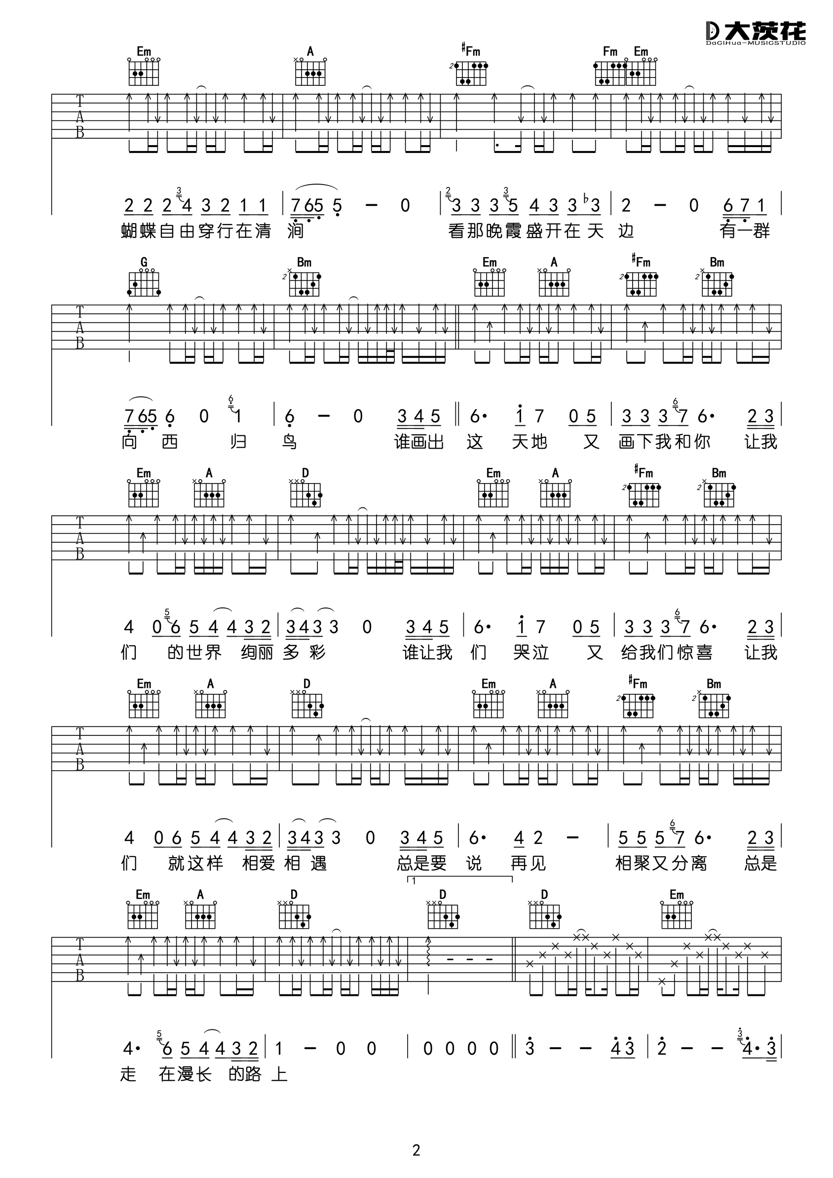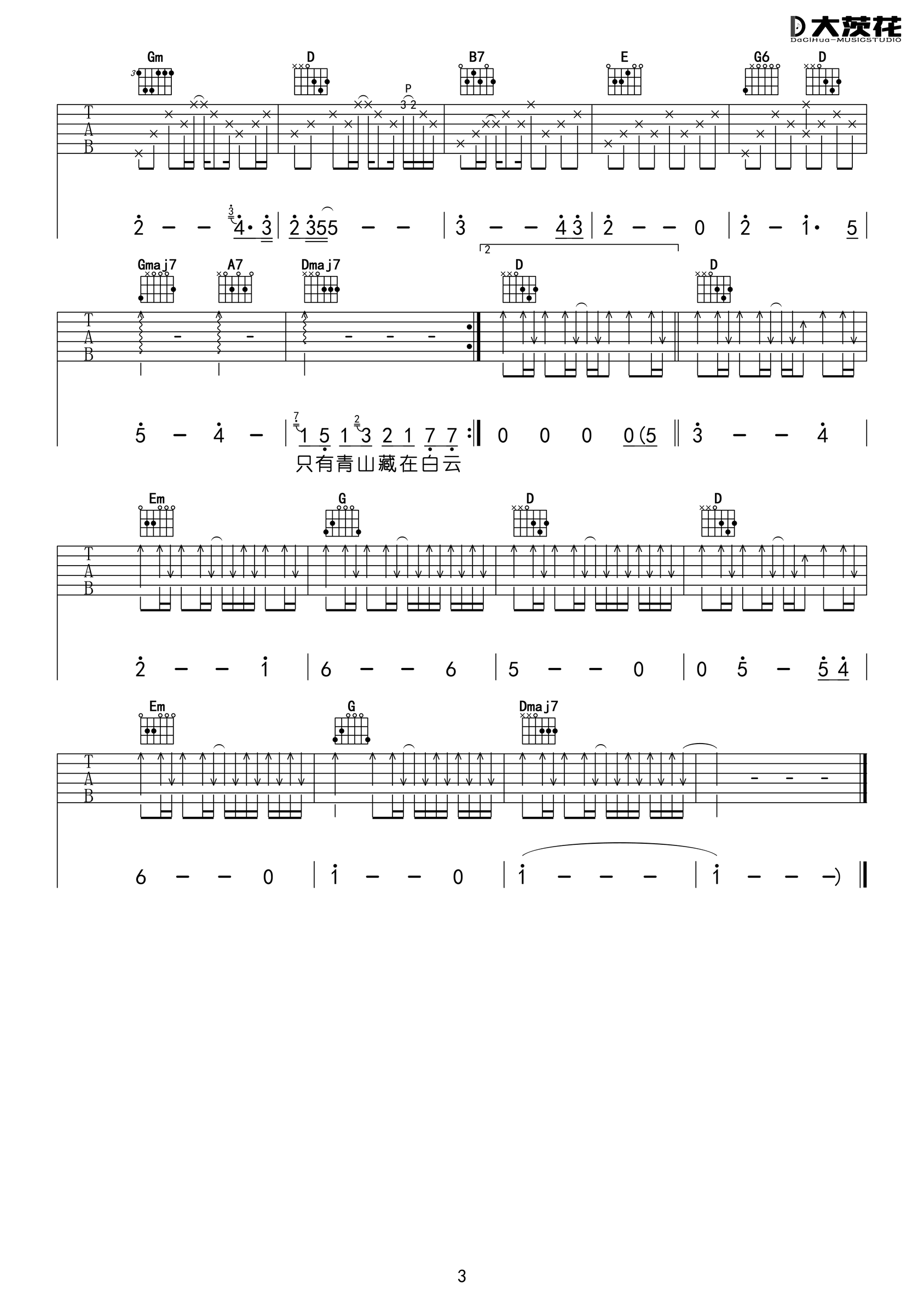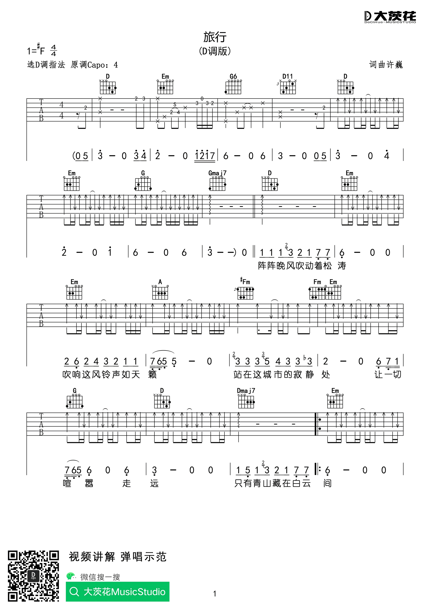 旅行吉他谱_许巍_D调版本_高清弹唱六线谱 时间:2021-03-25 来源:大茨花 点击:次 旅行吉他谱,许巍的一首经典代表歌曲,旅行吉他六线谱,原调升F,选用D调指法编配,变调夹夹第四品,三张图片六线谱。大茨花制谱分享,易唱网吉他谱更新上传。 人生是漫长的旅行,许巍的一首静静的歌,带有入世的深情和出世的随缘自在。我们只是轻轻的一跃,就走进了许巍为我们安排的意境当中,那里只有音乐和简单的意象,却给与我们最需要的享受。