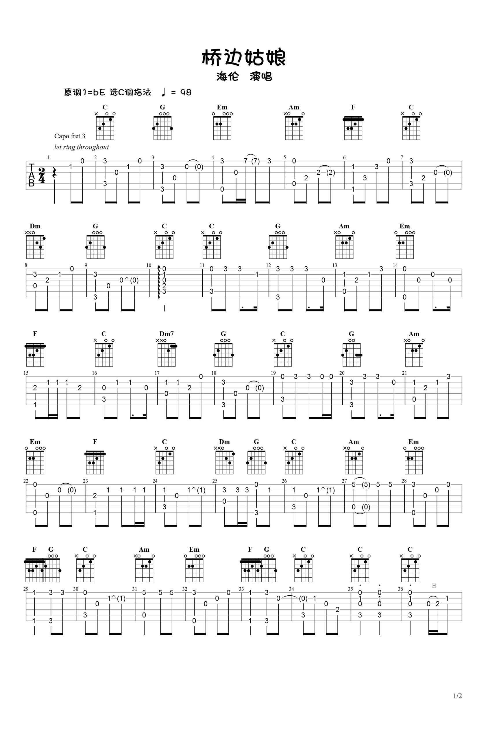 桥边姑娘指弹谱_海伦_C调_吉他独奏谱 时间:2021-03-26 来源:弹吉他的勺子 点击:次 《桥边姑娘》指弹吉他谱,海伦的一首代表歌曲改编,桥边姑娘吉他独奏谱,原调降E,选用C调指法,CAPO夹三品,两张高清图片谱例。弹吉他的勺子编配分享,易唱网整理更新。 一曲民谣旋律优美动听,歌声醉人醉心,唱出了爱情那种唯美的芬芳。这位姑娘没有绝世容颜,也没有泯然众人的风姿,但你心中知道,她愿意在你一无所有时伴你闯荡,也愿意在最寒冷的冬夜里为你提供温暖。