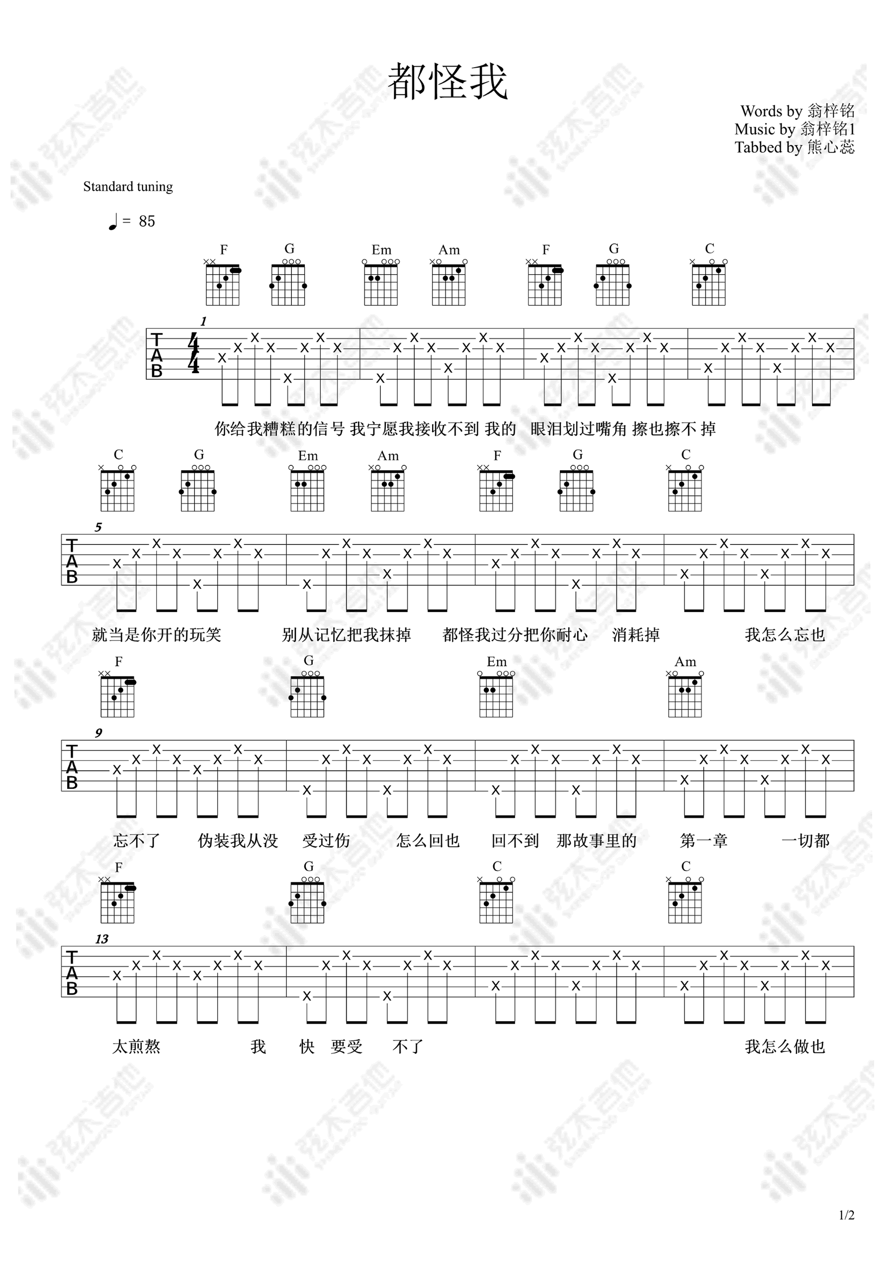 都怪我吉他谱_胡66_弹唱六线谱_高清图片谱 时间:2021-03-27 来源:弦木吉他 点击:次 都怪我吉他谱,胡66演唱的一首歌曲,沙哑的歌声唱出伤感又略带悔意和不舍。都怪我吉他弹唱谱,两张高清图片谱例。弦木吉他出品,易唱网更新。 爱的人消失在街角,心也随风散落于尘埃,看似一切结束,但曾经留下的印记怎么忘也忘不了,那些习惯也怎么戒也戒不掉。独自一人承受煎熬,只希望你回来好不好。