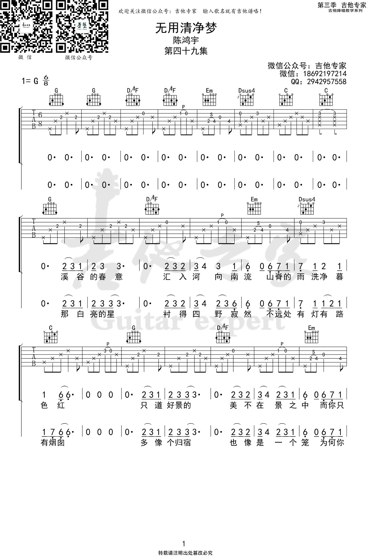 无用清净梦吉他谱_陈鸿宇_G调弹唱谱 时间:2021-03-28 来源:吉他专家 点击:次 无用清净梦吉他谱,陈鸿宇的一首原创民谣歌曲,无用清净梦六线谱,G调和弦指法,三张弹唱图片谱。易唱网更新分享,感谢吉他专家编配出品。 人间的满也是这人间的空,你可想过你为何匆匆?祝各位每天步履不停,奔赴着灿烂前程;黄昏伴着火烧云回家;夜里无牵挂,做个无用清净梦。