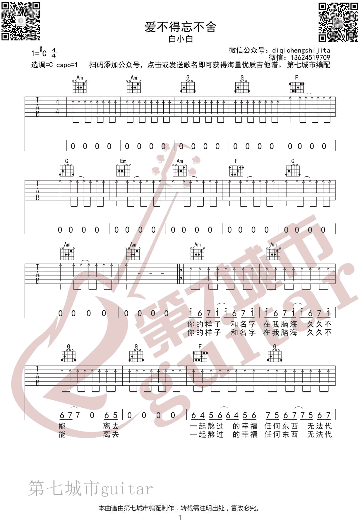 爱不得忘不舍吉他谱_白小白_C调_弹唱六线谱 时间:2021-04-21 来源:第七城市 点击:次 爱不得忘不舍吉他谱,白小白演唱的一首伤感情歌,爱不得忘不舍吉他弹唱谱,C调指法,变调夹一品,三张图片六线谱,第七城市编配,易唱网吉他谱更新上传。 没有过遗憾不算完整的人生,相爱过的人再见太难,但一别两宽,各自安好也是一种结局。白小白以一首《爱不得忘不舍》,来打动你挑剔的音乐味蕾,既是熟悉的感觉,又有不一样的新意。