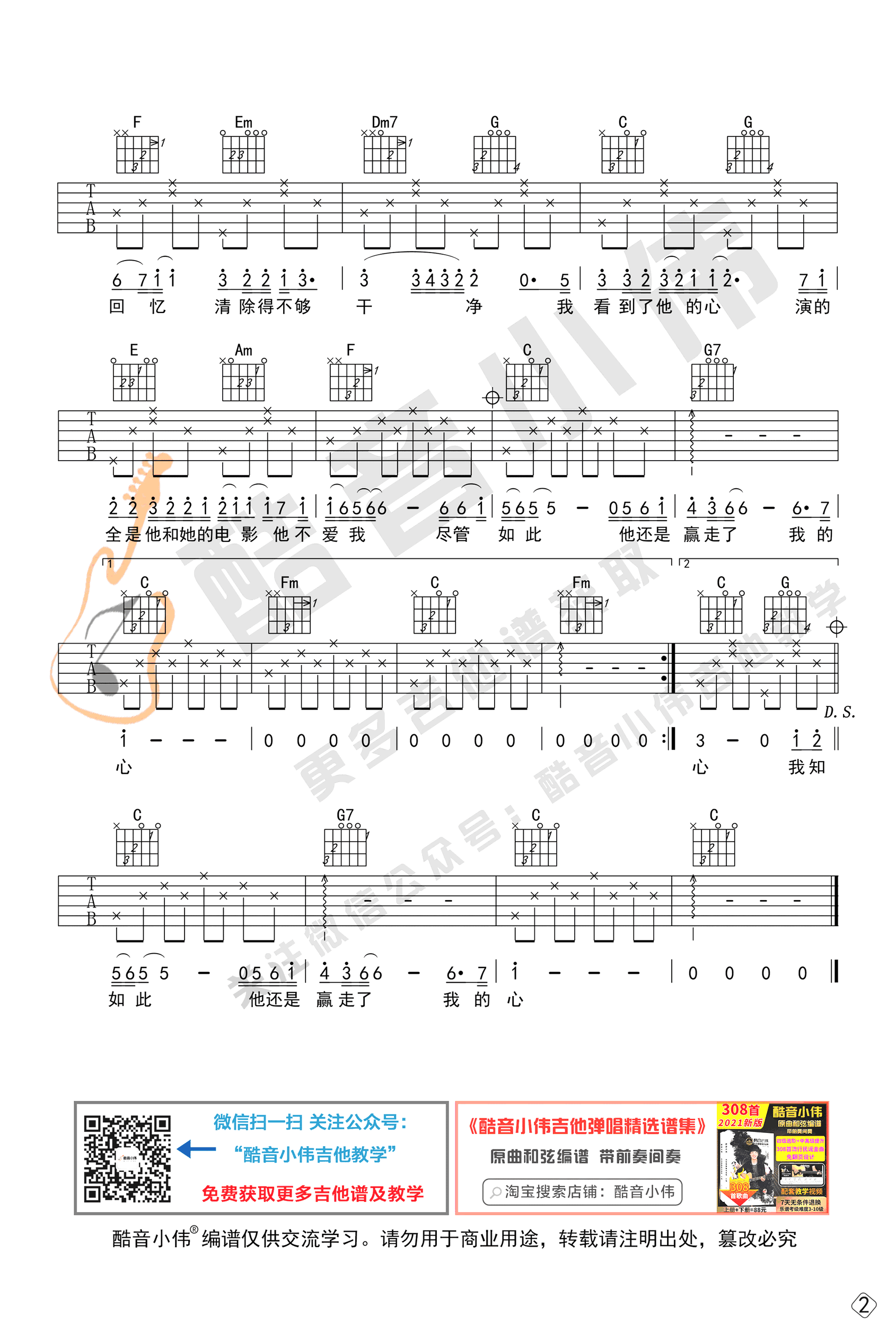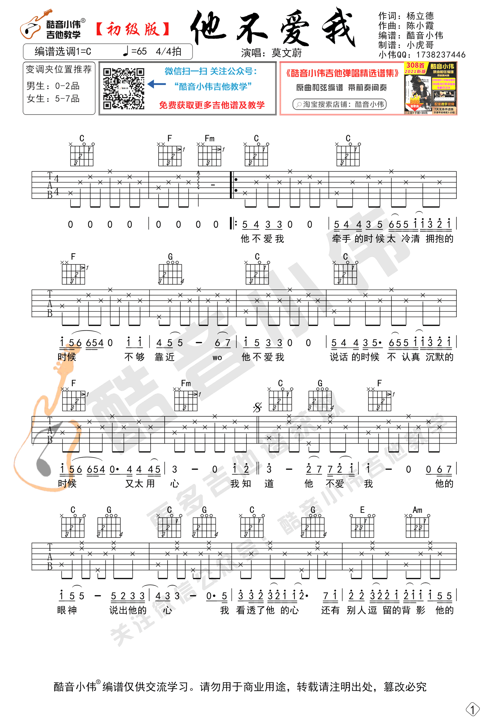他不爱我吉他谱_莫文蔚_C调简单版_初级弹唱谱 时间:2021-05-03 来源:酷音小伟 点击:次 他不爱我吉他谱,莫文蔚的一首虐心情歌,他不爱我六线谱,C调初级版,变调夹男生推荐0-2品女生5-7品,两张高清图片谱。酷音小伟制谱分享,易唱网更新上传。 一首失恋疗伤情歌,爱情永远会带给人伤感和无奈,而它传达出的爱恨离合都是那么让人心动。每一个不甘心的人,都能在歌声里听见自己的故事。