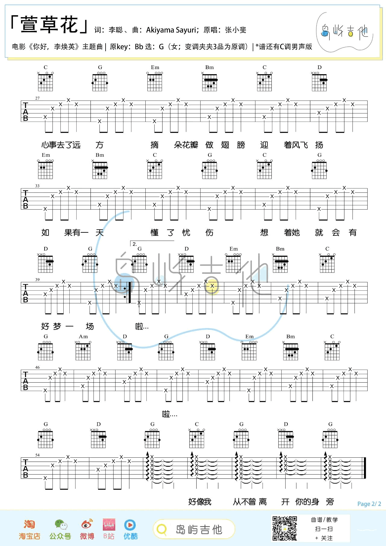 萱草花吉他谱_张小斐_C调男生版+C调女生版_弹唱教学视频 时间:2021-05-09 来源:岛屿吉他 点击:次 萱草花吉他谱,张小斐为贾玲电影《你好李焕英》献唱的主题曲,萱草花六线谱,C调男生版+G调女生版,感谢岛屿吉他制谱出品,并为我们带来弹唱教学视频。易唱网更新整理。 高高的青山上萱草花开放,像妈妈在耳边轻轻哼的摇篮曲温柔又暖心,这是献给妈妈的歌,也是献给妈妈的花。母亲节快乐,祝福全天下妈妈永远健康幸福! 萱草花吉他谱女生版+教学视频