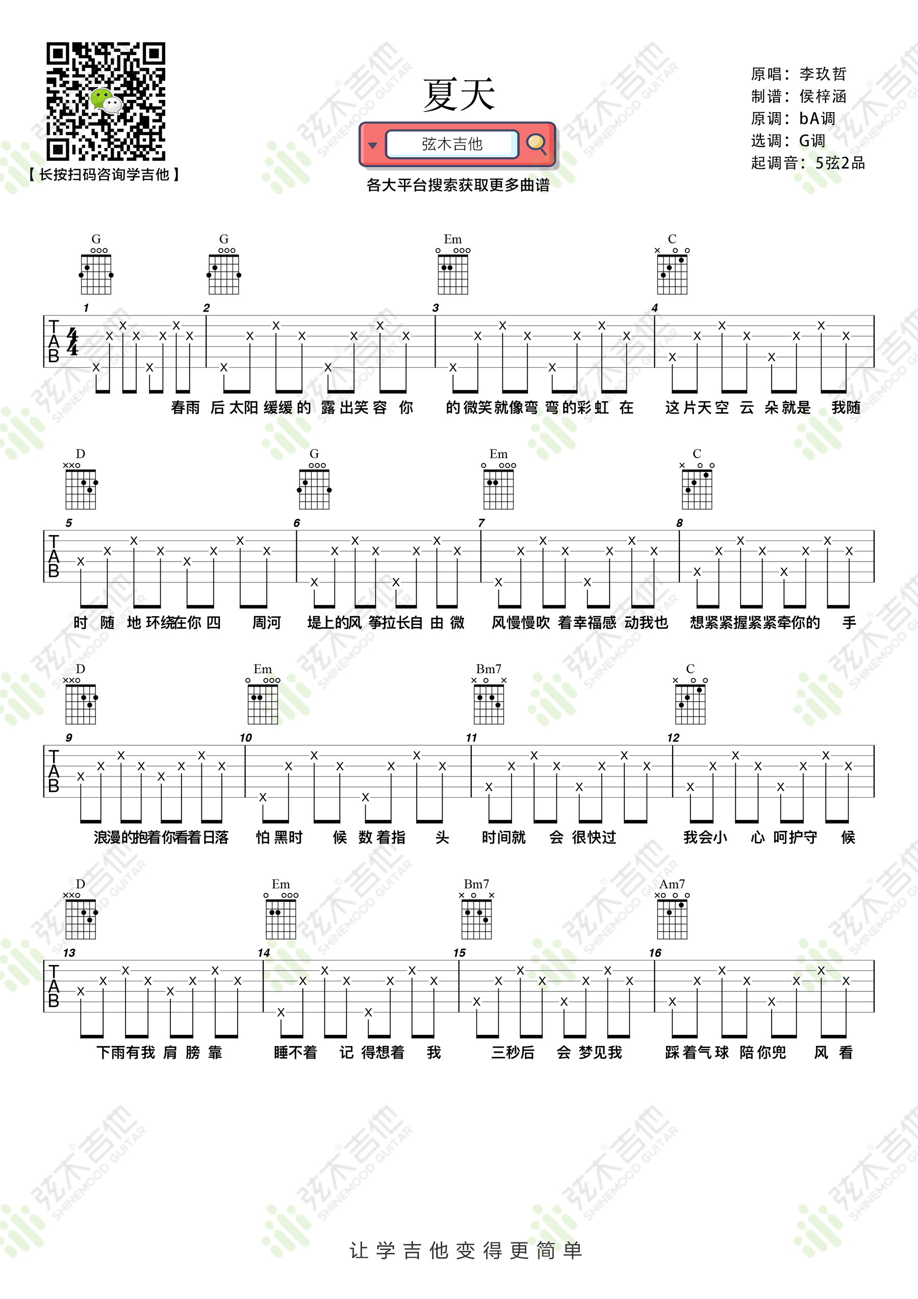 李玖哲《夏天》吉他谱_G调简单版_弹唱谱 时间:2021-05-17 来源:弦木吉他 点击:次 夏天吉他谱,李玖哲演唱的一首甜蜜的小情歌,夏天六线谱,歌曲原调降A,选用G调,起调音五弦二品,两张图片弹唱谱。弦木吉他编配出品,易唱网更新上传。 周杰伦小公举写的曲子像夏日里的冰镇西瓜再淋上一大勺蜜糖。戴着耳机,不禁陷入夏日的幻想,歌词里的一字一句都是想对爱人说的话。