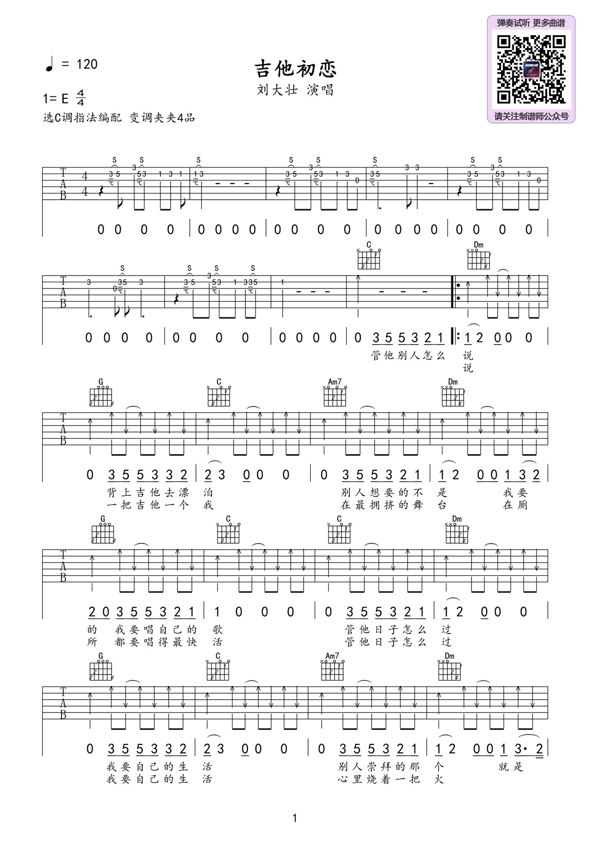 吉他初恋吉他谱_刘大壮_C调_弹唱六线谱 时间:2021-05-17 来源:制谱师 点击:次 吉他初恋吉他谱,刘大壮演唱的的一首热门歌曲,为你唤醒那些藏在心里的热情。吉他初恋六线谱,原调E,选用C调指法编配,变调夹夹第四品。三张弹唱图片谱,制谱师编配分享,易唱网上传。 能治愈生活的良方,是保持对生活的热爱。别人的眼光并不重要,别人的生活也与我无关。我要做我自己,我要的生活,是和吉他一起,创造属于我的音乐人生。