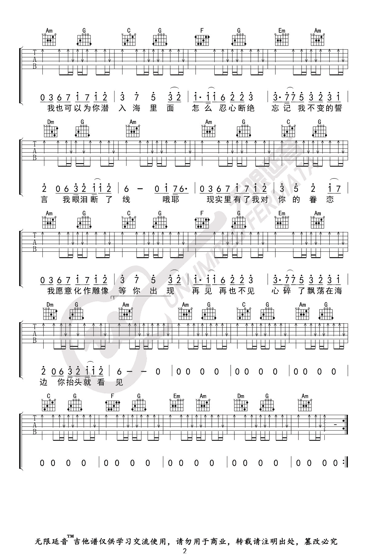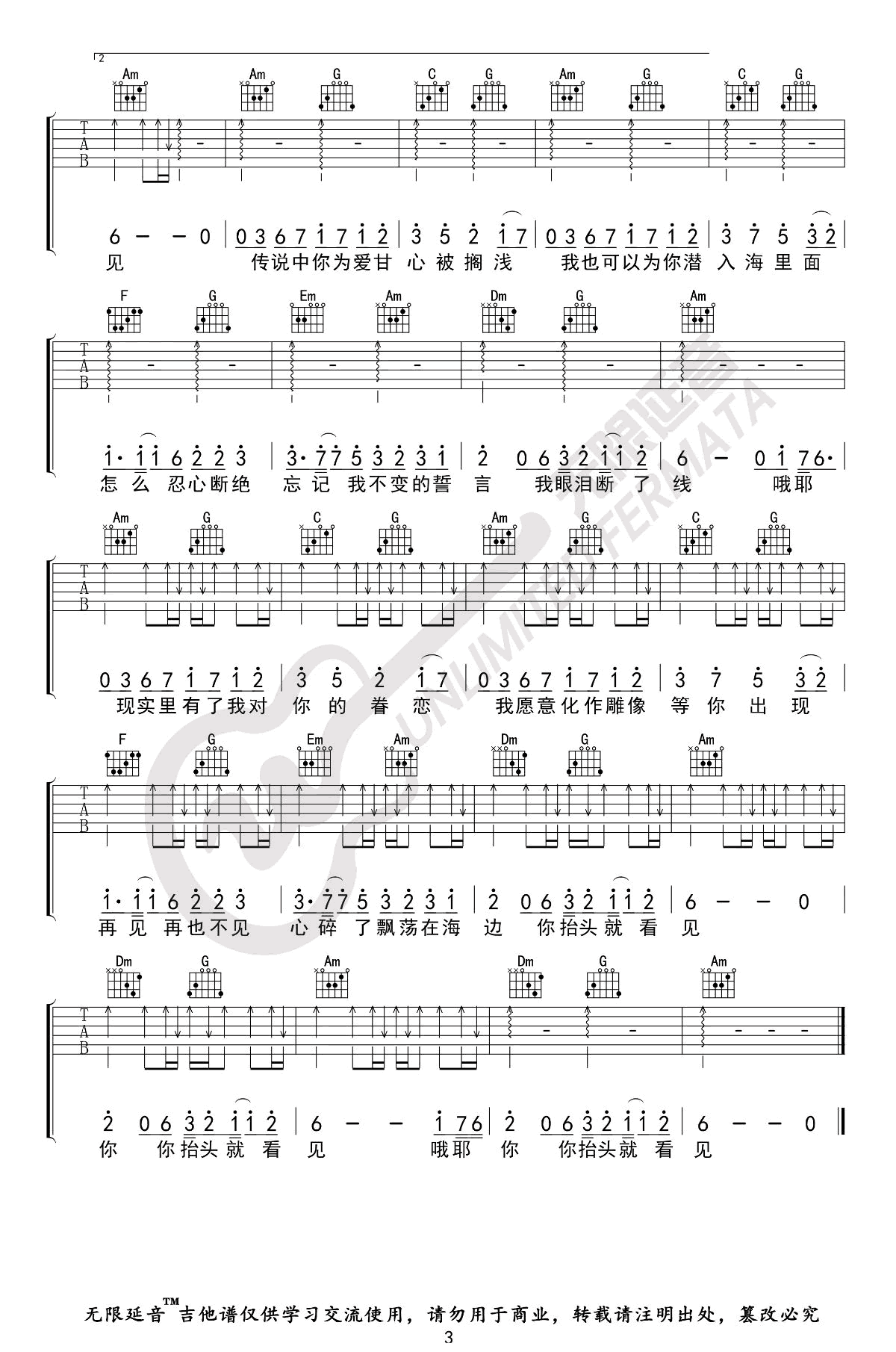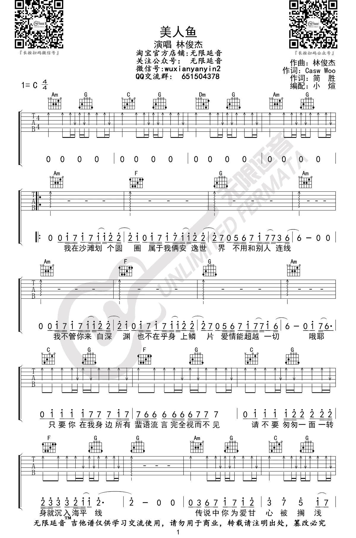 林俊杰《美人鱼》吉他谱_C调_弹唱图片谱 时间:2021-05-23 来源:无限延音 点击:次 美人鱼吉他谱,林俊杰的一首我们青春里的宝藏歌曲,美人鱼吉他弹唱谱,C调编配,三张图片六线谱。易唱网更新上传,感谢无限延音制谱分享。 你相信在这个世界上真的有美人鱼吗?传说中她为爱甘心被搁浅,或许只有爱情的力量才能让这条美人鱼现身。你是否也有勇气,愿意为她潜入海里面?