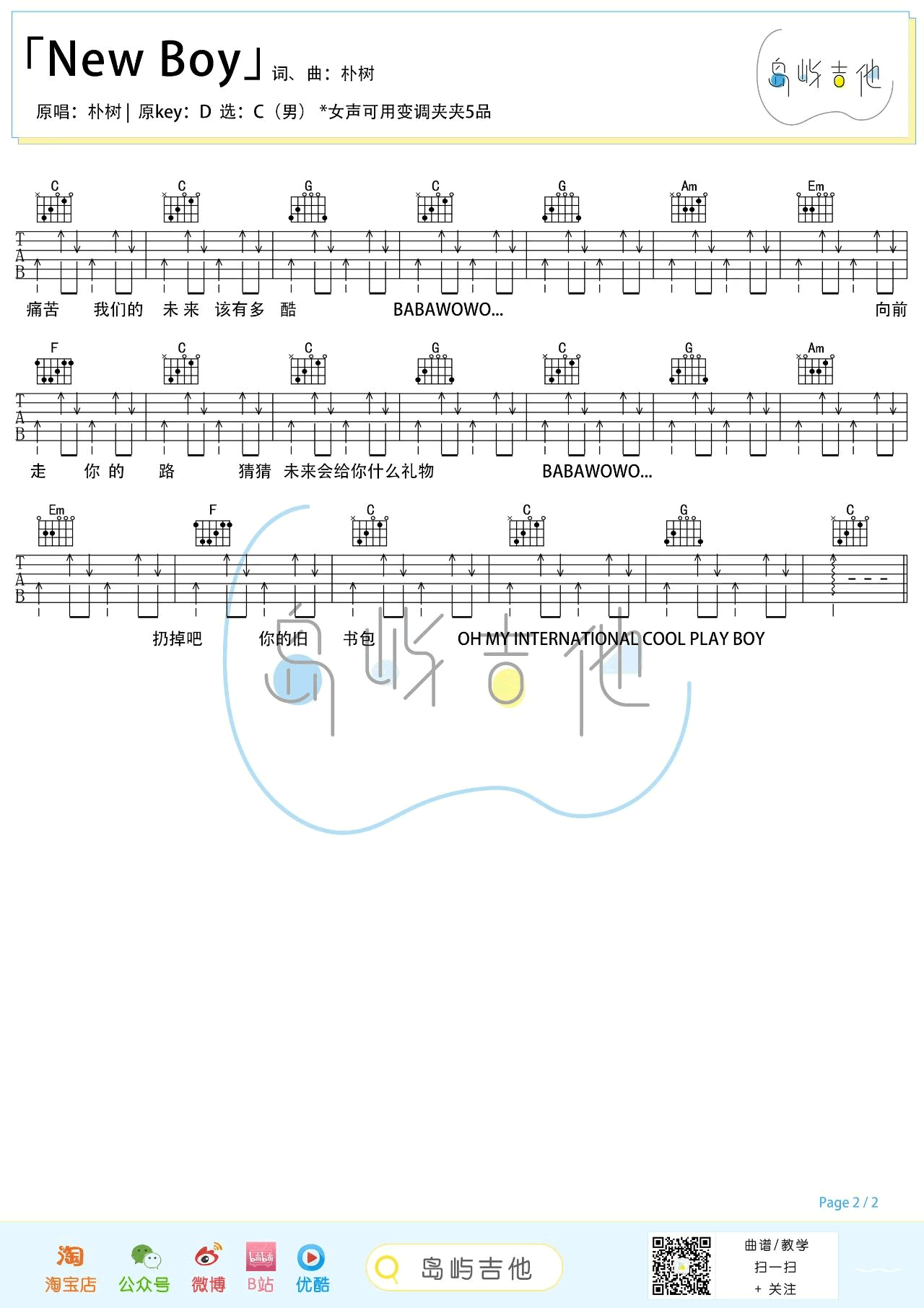 朴树《New Boy》吉他谱_D调弹唱谱_乐队的夏天 时间:2021-05-24 来源:岛屿吉他 点击:次 《NEW BOY》吉他谱,朴树的一首充满青春回忆的老歌,New Boy吉他弹唱谱,原调D选调C,女生建议变调夹夹五品,两张图片谱例,岛屿吉他出品分享,易唱网吉他谱上传。 一首让张亚东泪洒现场的歌曲,乐队的夏天节目盘尼西林唱起《New Boy》,仿佛带我们回到18岁的时光,动感的旋律洋溢着青春活力,给人温暖感动。
