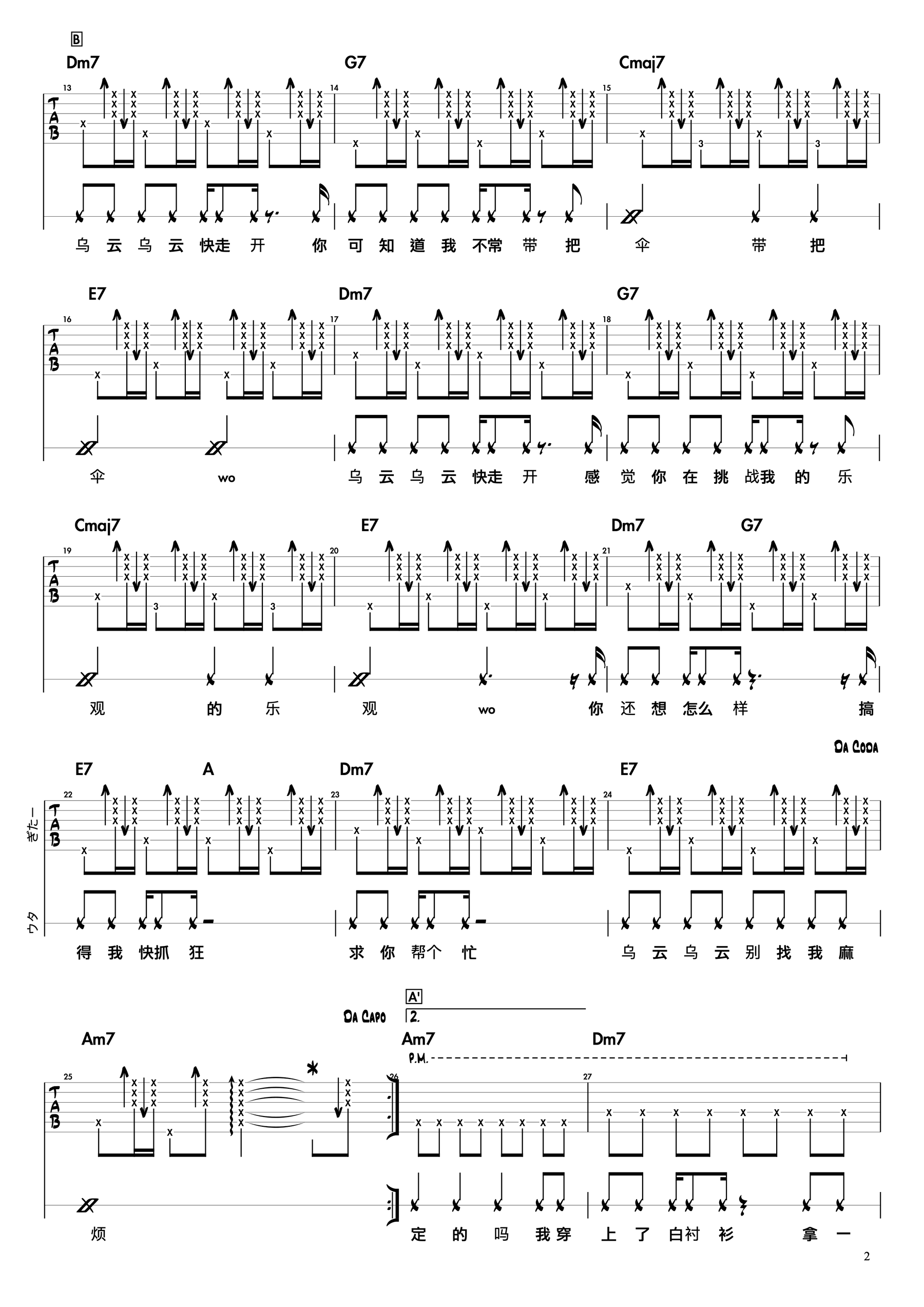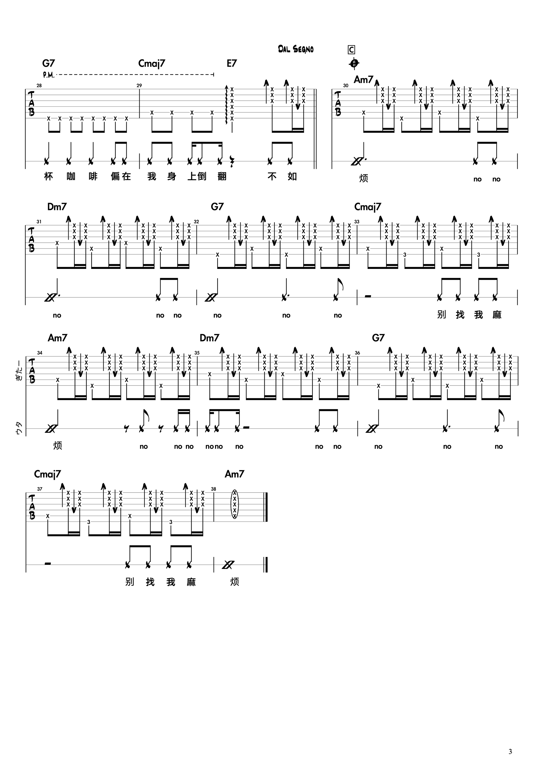 别找我麻烦吉他谱_蔡健雅_吉他弹唱谱_演示视频 时间:2021-06-02 来源:14吉他屋 点击:次 别找我麻烦吉他谱,蔡健雅演唱,慵懒的唱腔演绎随意轻松态度。别找我麻烦六线谱,三张弹唱图片谱,14吉他屋编配分享,易唱网整理更新上传。 这首歌虽然讲述的是生活中不断的小烦恼,但是整体风格却不是一味地抱怨,反而在轻松俏皮中将积极乐观的态度传达出来了。