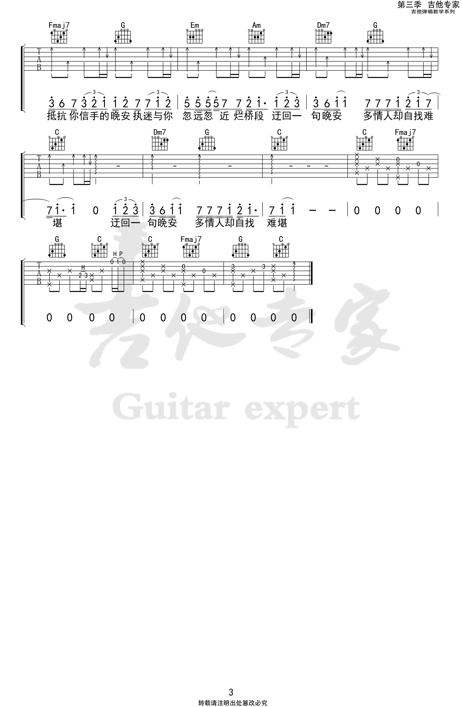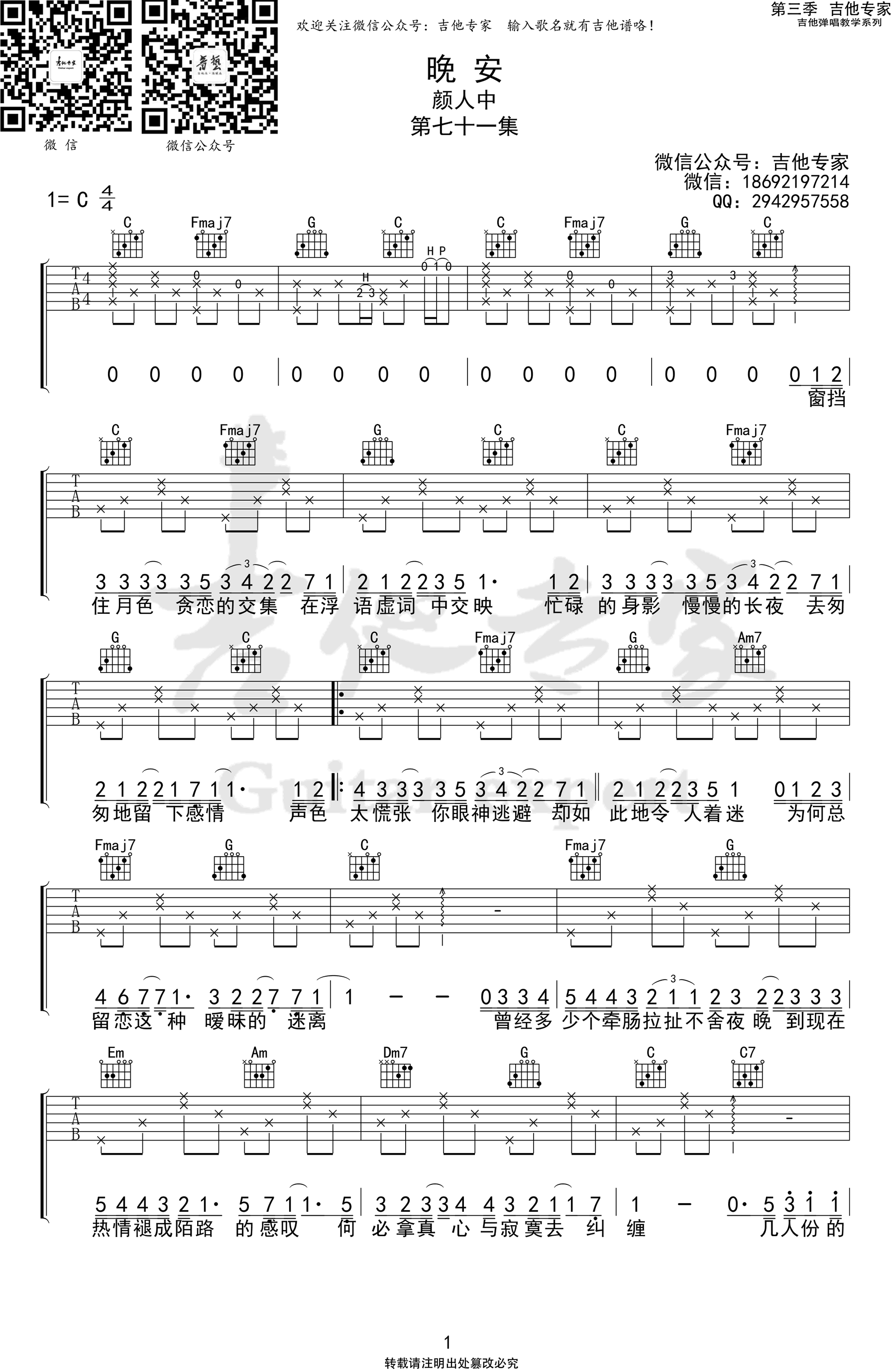颜人中《晚安》吉他谱_C调_高清弹唱谱 时间:2021-06-02 来源:吉他专家 点击:次 晚安吉他谱,颜人中的一首动听歌曲,将夜里无数人孤独的身影尽数道出。晚安吉他六线谱,C调编配,三张高清图片谱,易唱网感谢吉他专家编配分享。 也许是你孤独惯了,幸福的人从来都不晚睡的。而那些但凡未得到,但凡已失去的,总是叫人念念不忘。