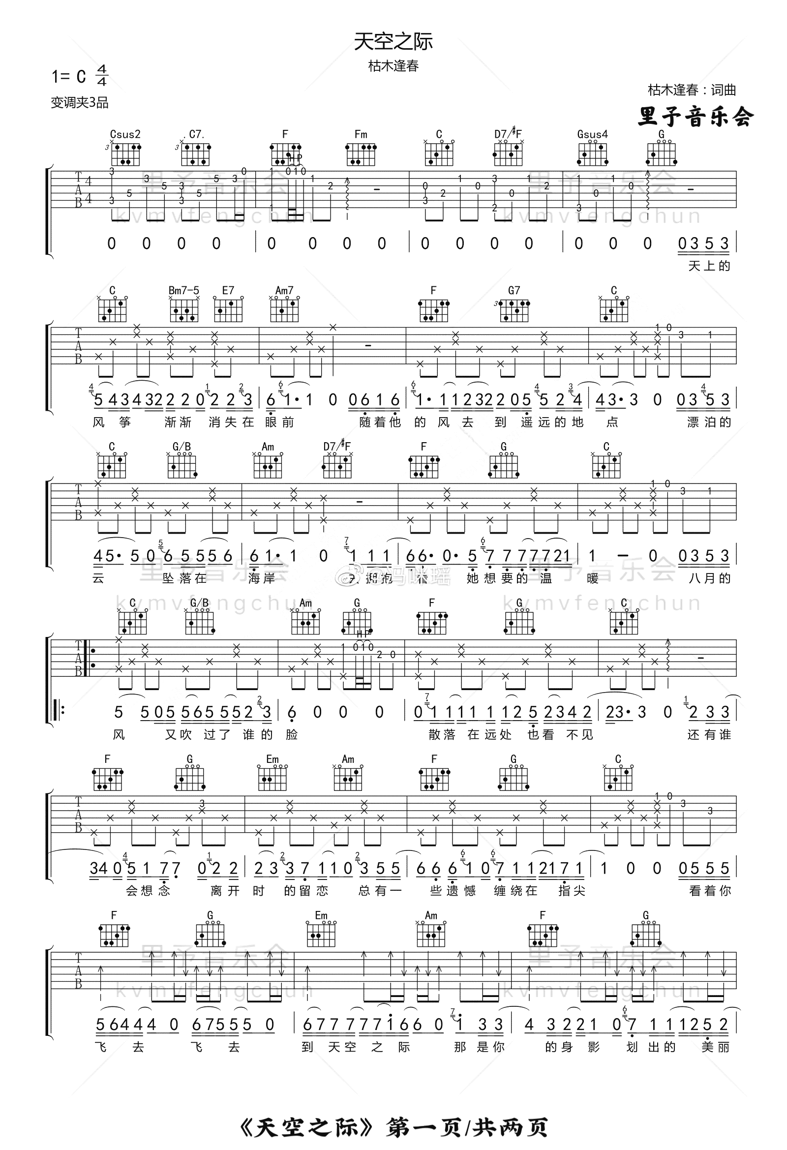 天空之际吉他谱_枯木逢春_C调弹唱谱_高清六线谱 时间:2021-06-04 来源:里予音乐会 点击:次 天空之际吉他谱,枯木逢春最新原创民谣歌曲,天空之际吉他六线谱,C调指法,变调夹夹三品。两张高清图片谱,里予音乐会出品,易唱网更新上传。 富有想象力的词语,带着我们一起流连在天空之际。简洁的吉他搭配叙述感的嗓音让这首歌曲更加动人,离别的留恋远去的遗憾也浮现在眼前。