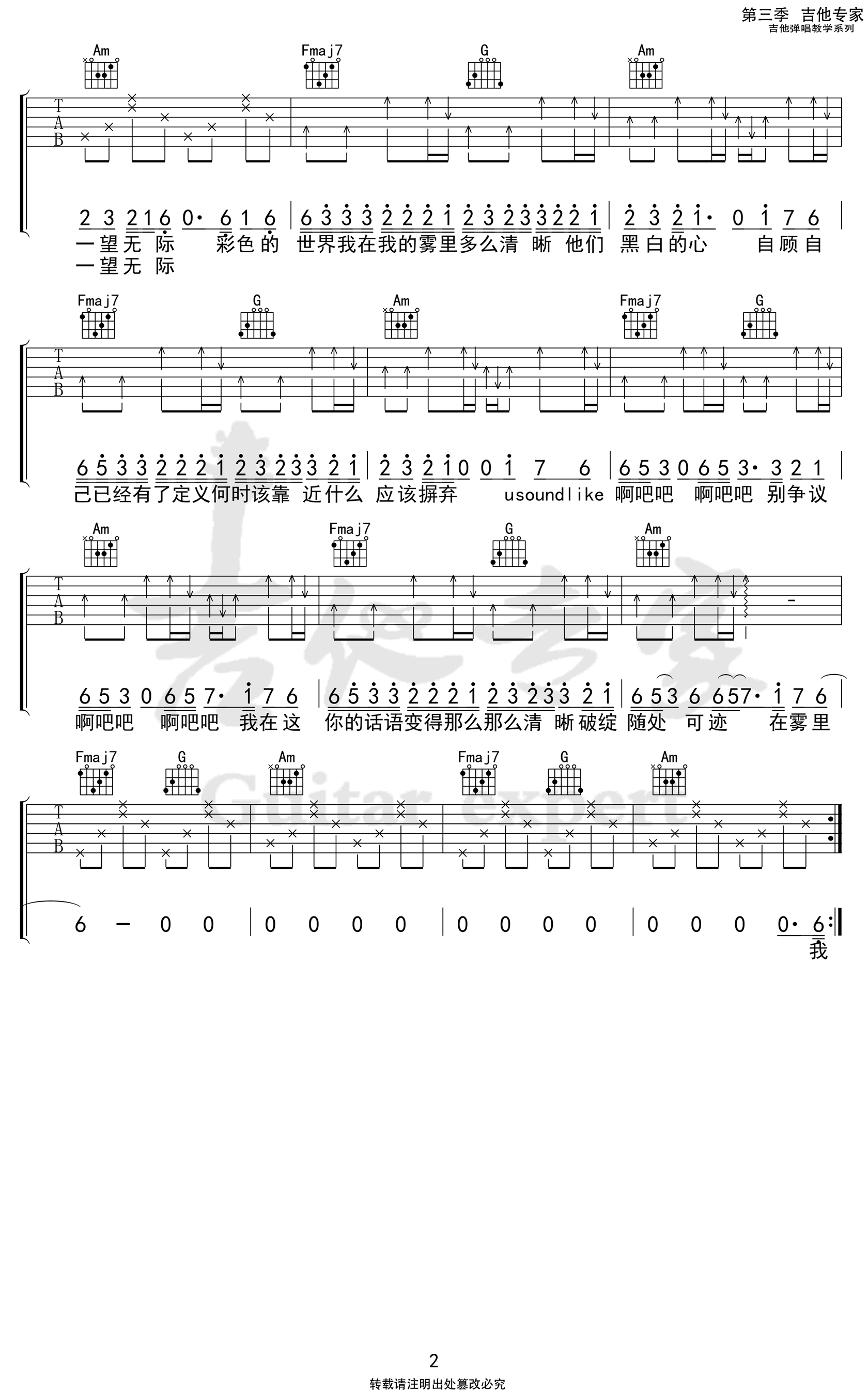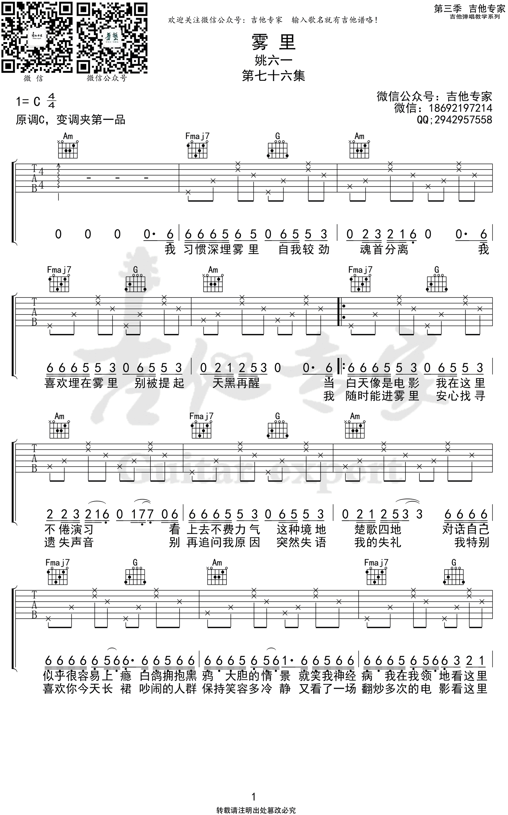 雾里吉他谱_姚六一_C调六线谱_高清弹唱谱 时间:2021-06-14 来源:吉他专家 点击:次 雾里吉他谱,姚六一的一首网络热门歌曲,雾里六线谱,C调指法编配,三张高清图片六线谱。易唱网更新,感谢吉他专家制谱分享。 彩色的世界,我在我的雾里多么清晰。最近超火的一首歌。我们都在生活的迷雾里,看不清本质,找不到未来,也习惯于这种失去自我困局,如何才能保持自我保持清醒,是每一个人的值得思考的问题。