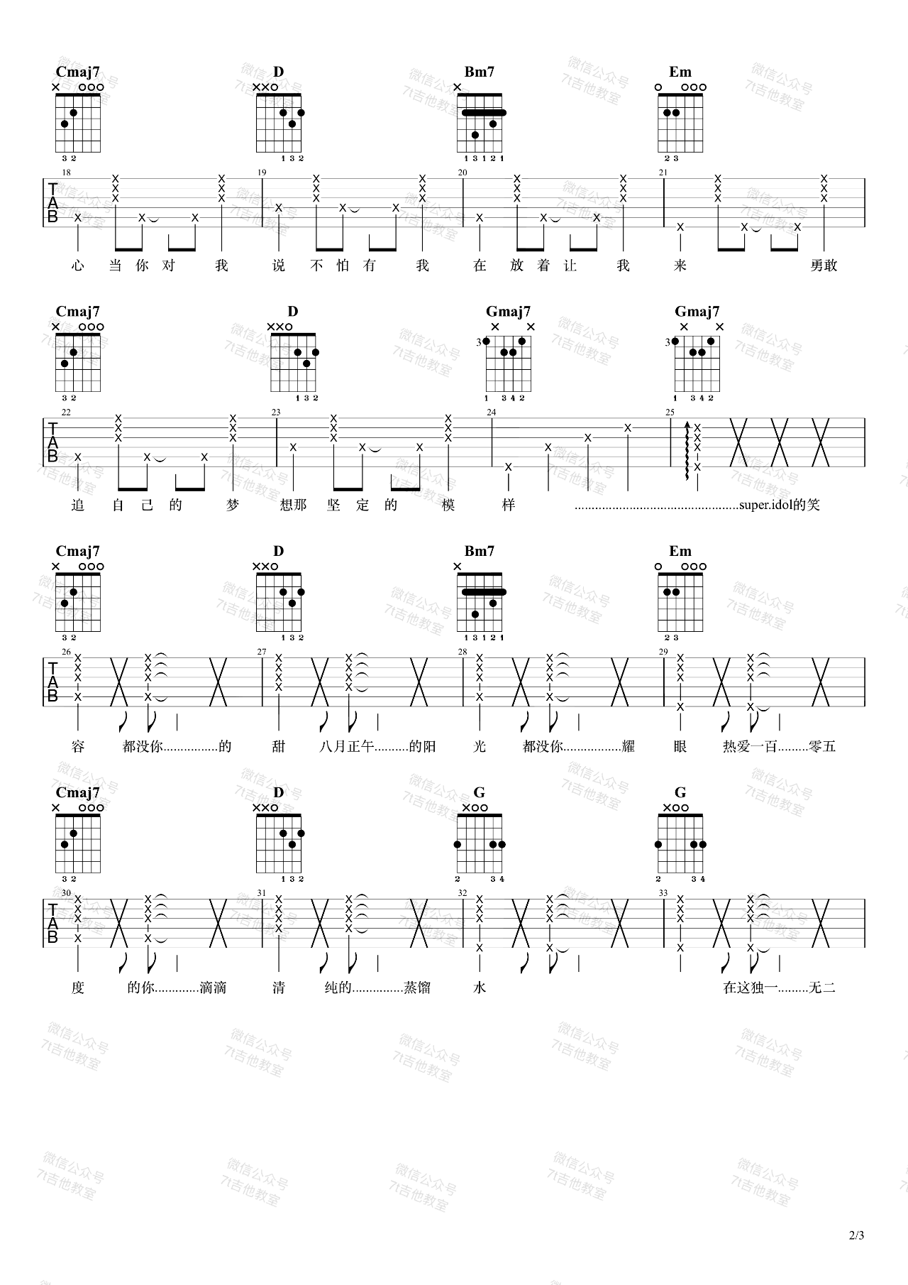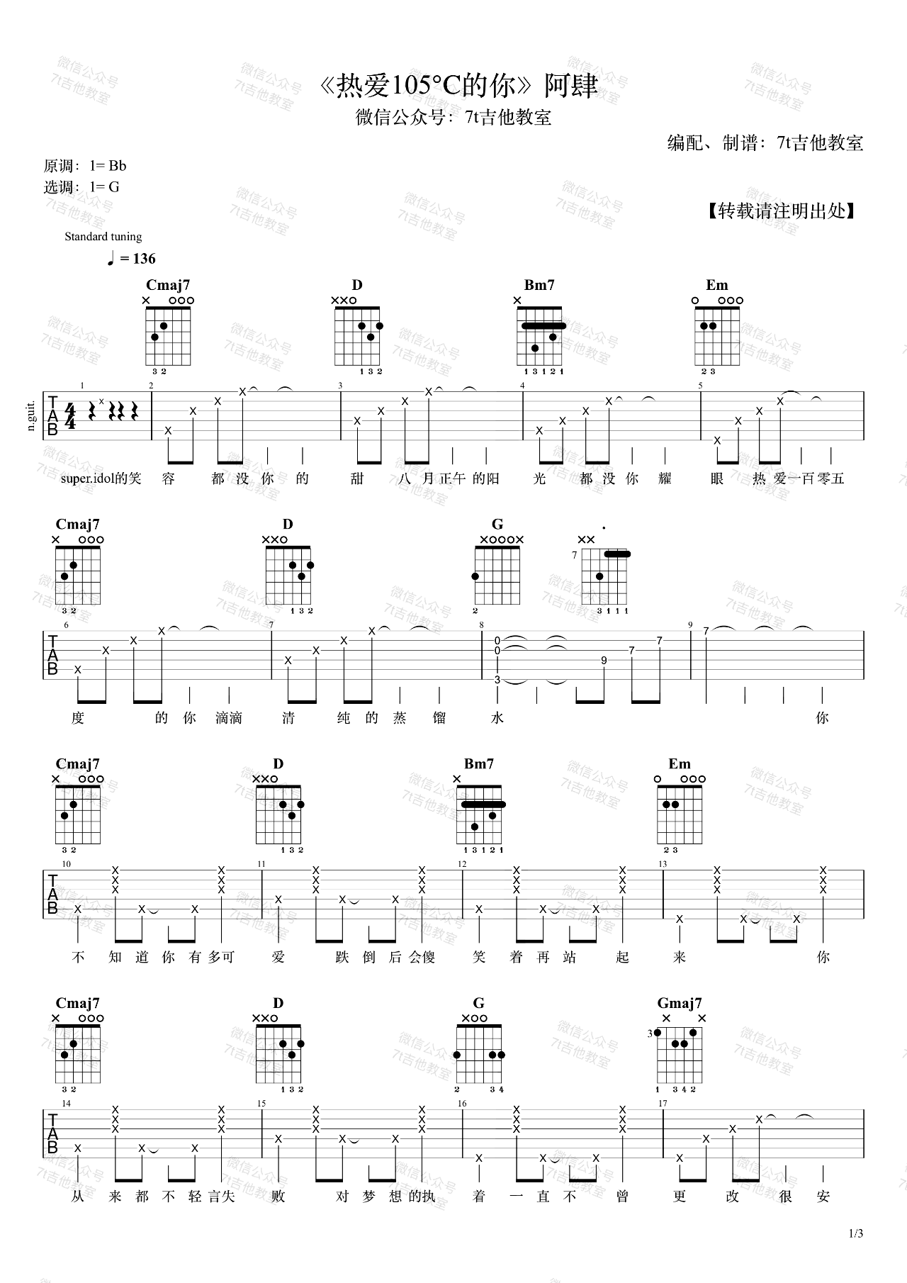 热爱105℃的你吉他谱_G调女生版_阿肆_弹唱演示视频 时间:2021-06-15 来源:7T吉他教室 点击:次 《热爱105℃的你》吉他谱,阿肆这首歌的原调是Bb大调,用的是G大调的指法来编配,演示视频里是标准音调弦,变调夹夹在第3品,也就是原调哦!男生可以不夹变调夹。感谢7T吉他教室编配,易唱网更新。 和弦分析:这首歌的和弦对新手还是比较友好的,用G调来编配一方面比夹1品用A调指法更简单,另一方面G调比原调低了3个调,也可以满足男生的弹唱。整首歌的和弦进行基本上是4536451的不断循环,跟我们经常听说的4536251很像,区别只在最后是251还是451,251和451都是比较常见的终止式,两者功能类似,经常可以互相替代,大家也可以把这首歌弹成4536251,也是很好听滴。